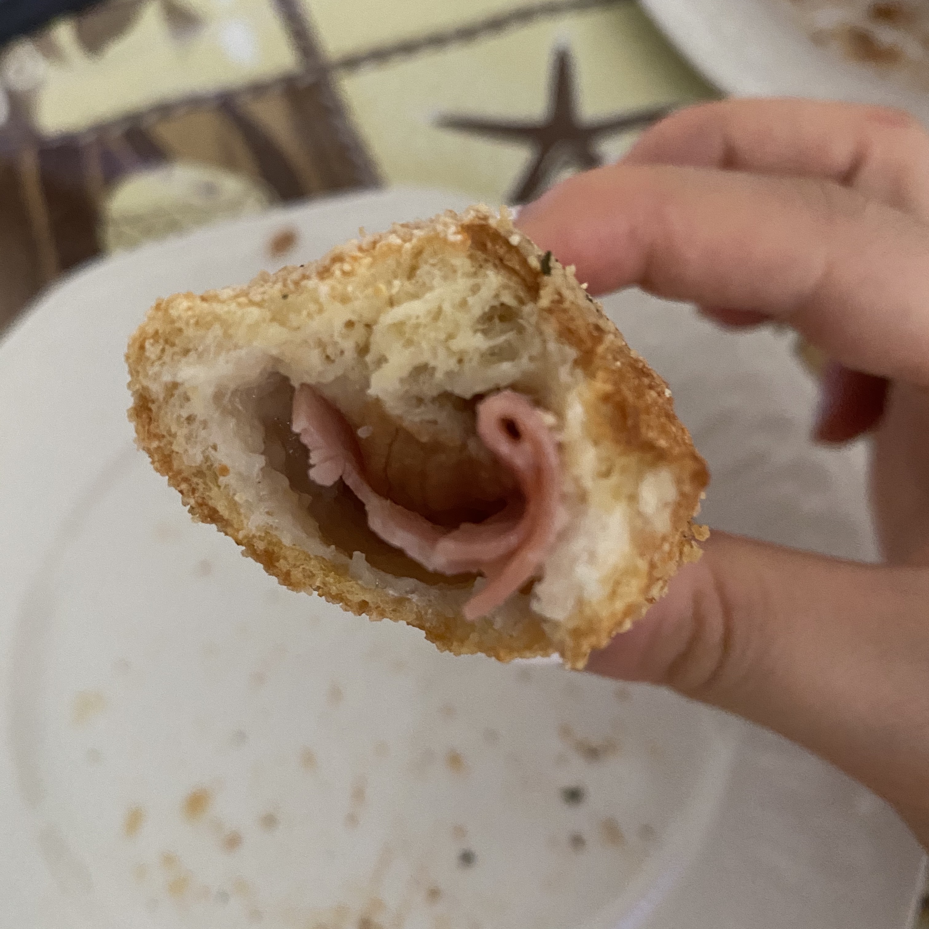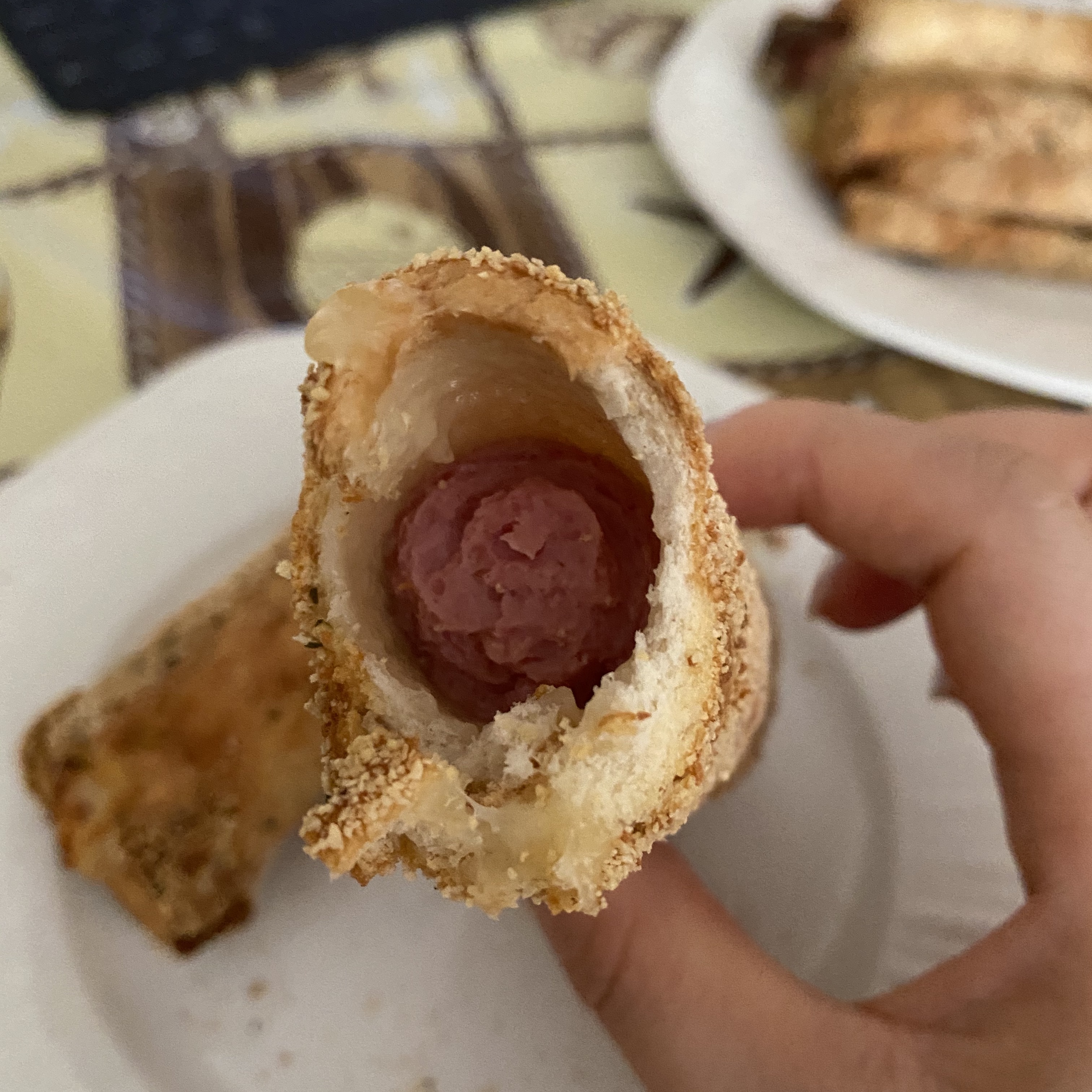 소시지를 넣은 모습은 이렇고, 치즈 때문에 미끄러운가 막 빠지기도 한다. 그러면 다시 넣어서 먹으면 된다. 개인적으로 소시지보다는 햄을 넣어서 만든 것보다 햄을 넣어서 만든 게 더 맛있었다. 아마 소시지 나름이지 않을까 싶긴 하지만, 소시지를 위해서는 핫도그처럼 두꺼워야 좀 짠 맛이 덜 할 것 같다.