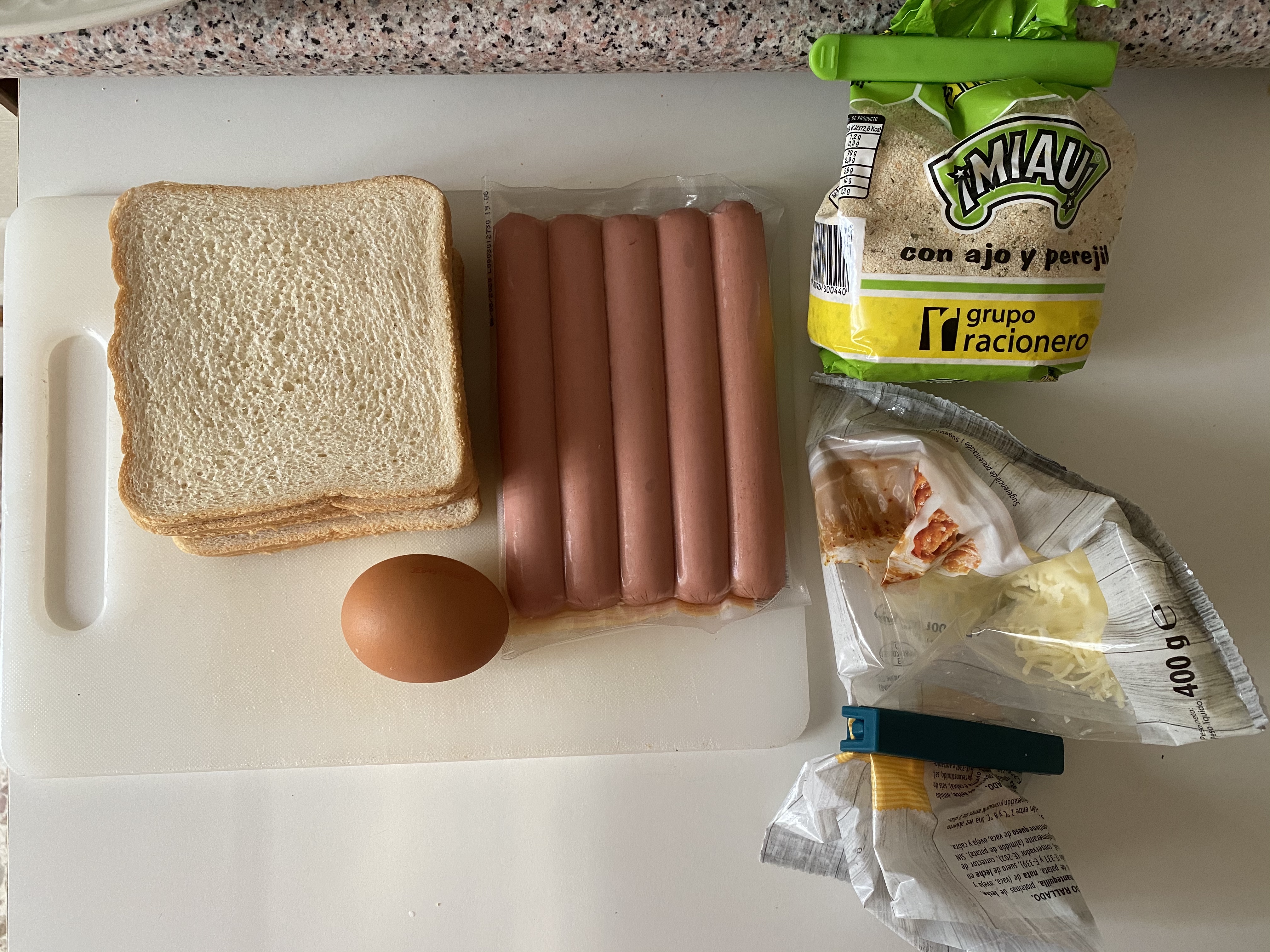 준비물은 식빵, 계란, 소시지 (햄), 빵가루, 치즈이다. 참고로 여기 빵가루는 한국 빵가루와 달리 뭔가 고와서 한국처럼 엄청 바삭거리지는 않는다.