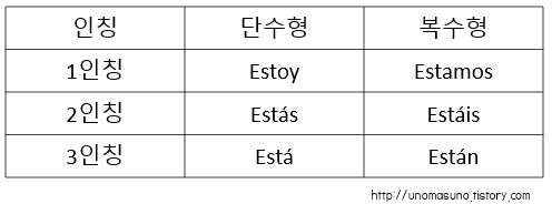 Estar: Estoy, Estas Está (단수)// Estamos, Estáis, Están (복수)