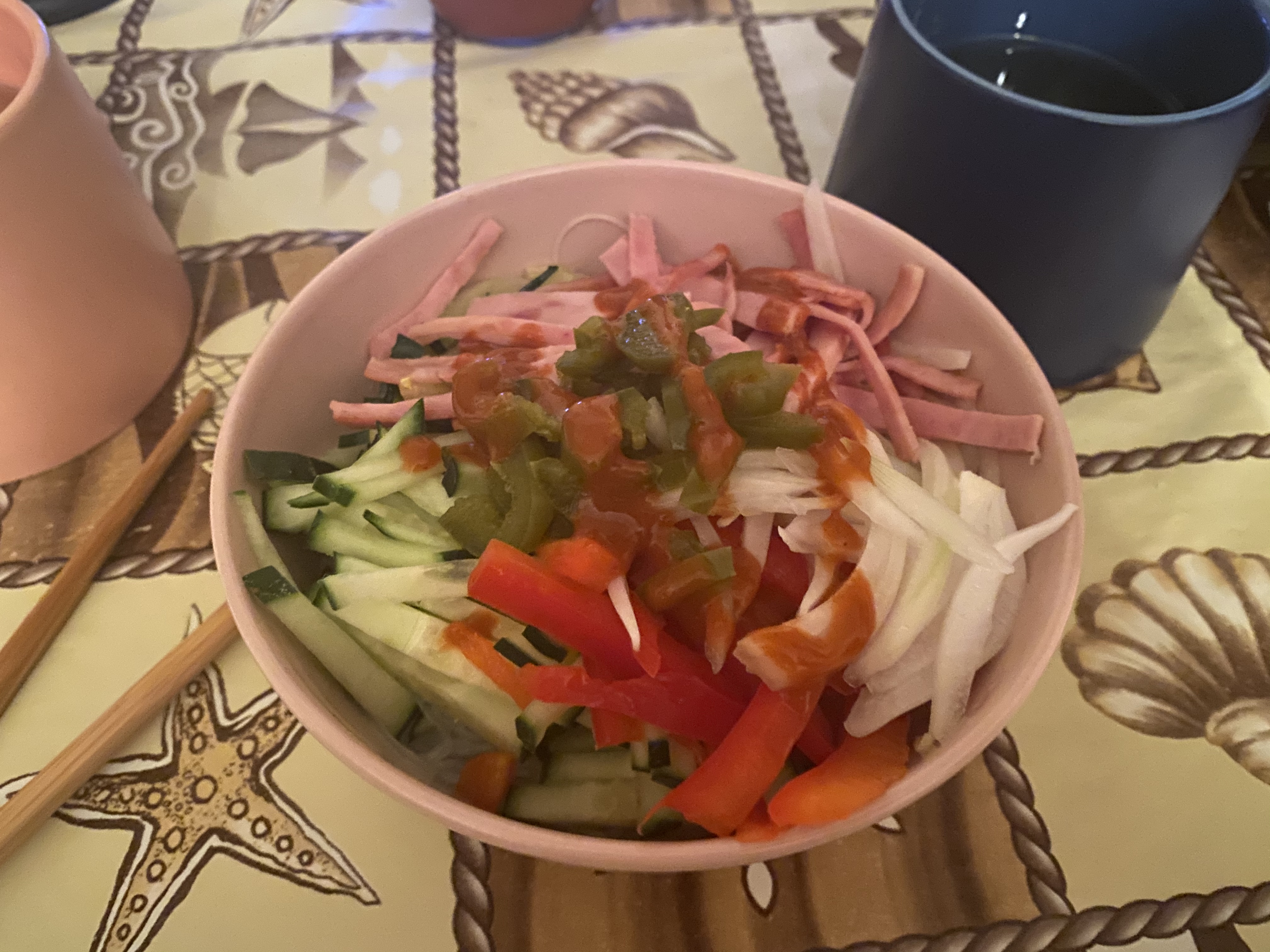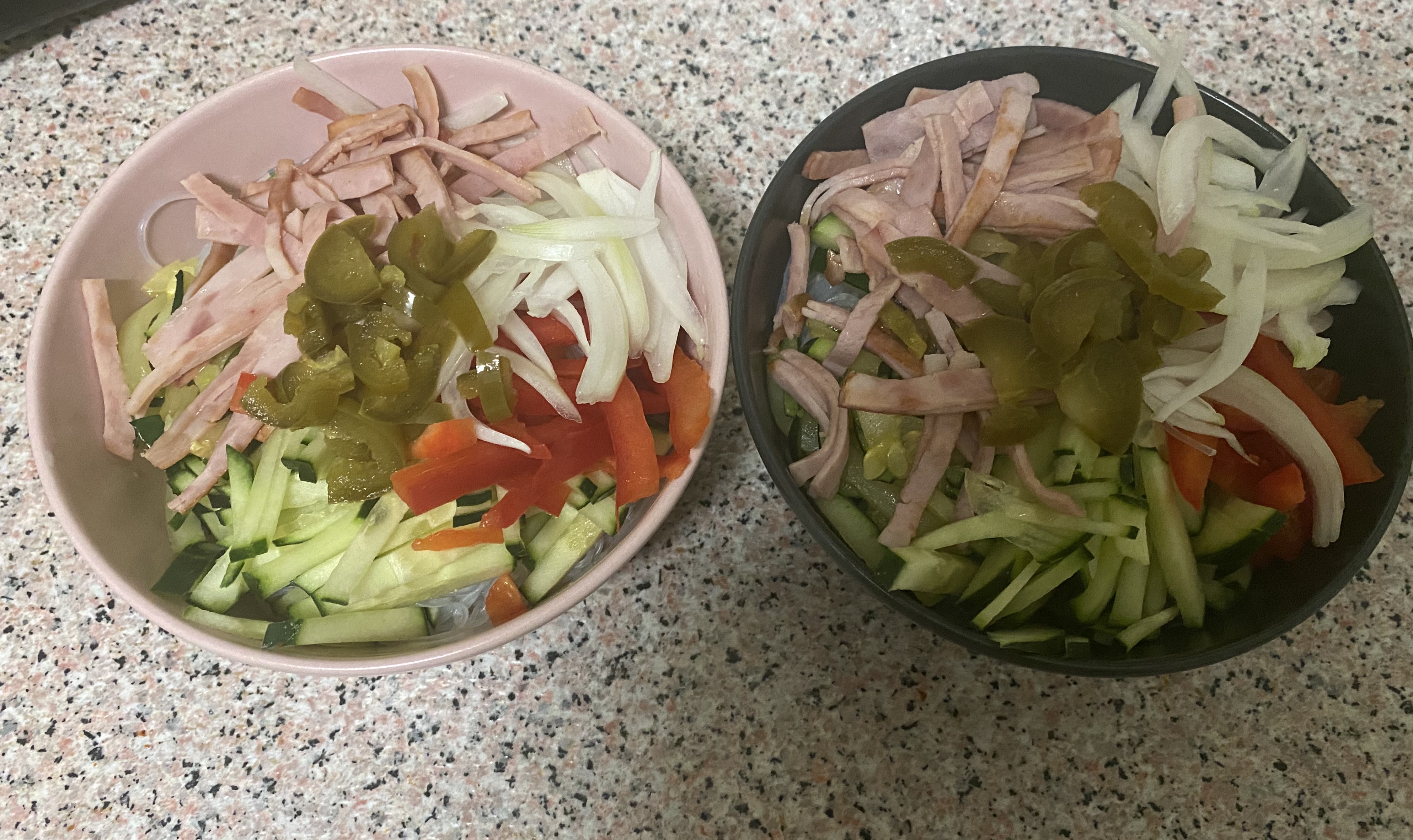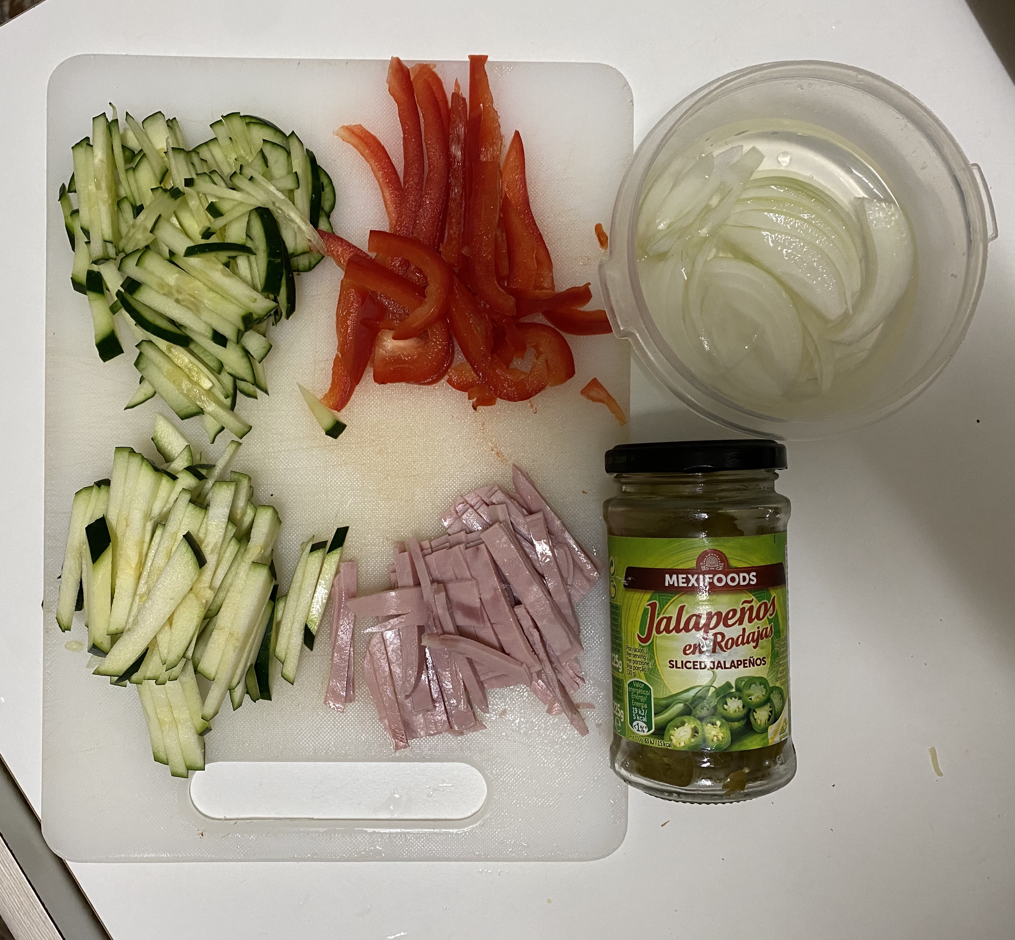 원하는 야채들을 준비한다. 나는 오이, 애호박, 양파, 피망을 준비했고, 햄과 할라페뇨도 준비했다. 볶아야 하는 야채들은 볶아주고!