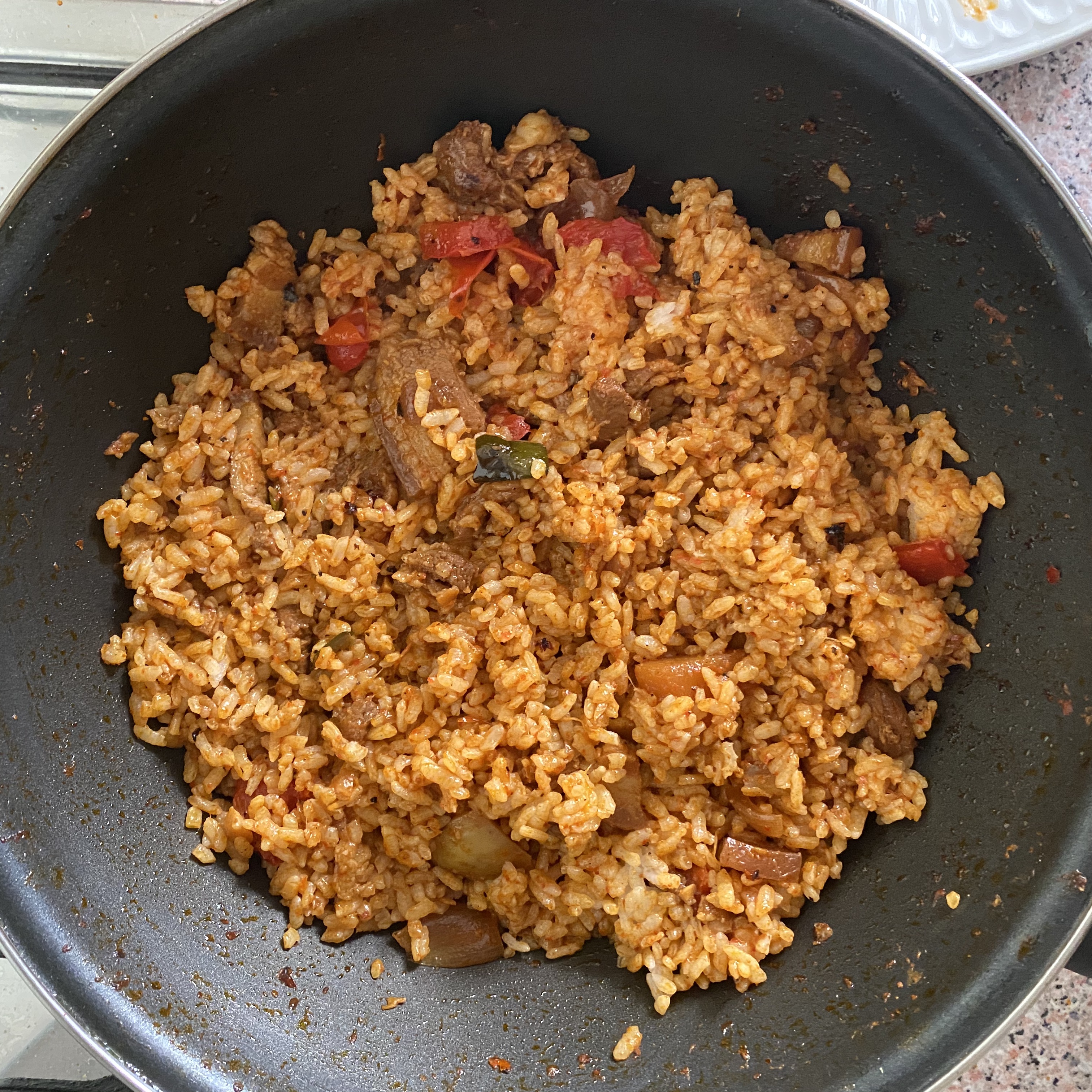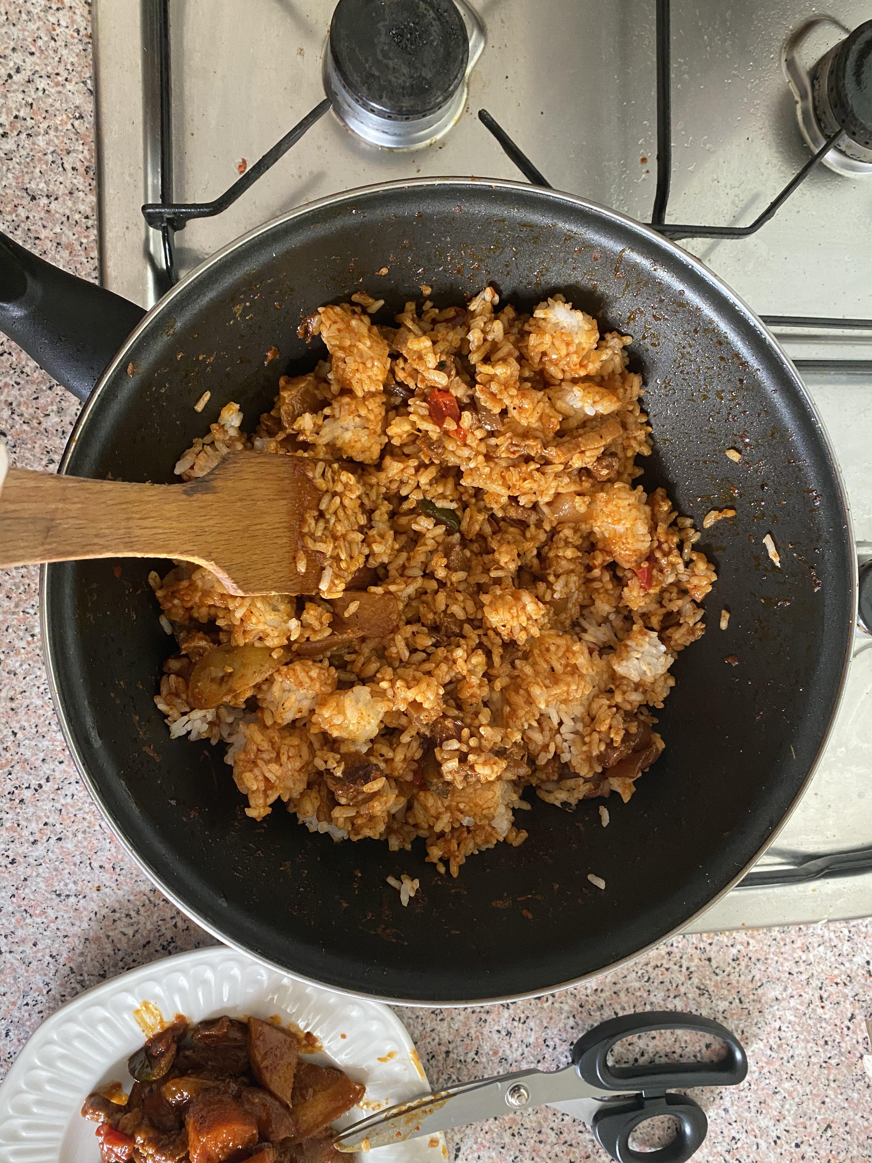 먼저, 있던 고기들과 야채들을 조금 빼 주고, 후라이팬에 있던 고기들은 잘게 잘게 잘라줬다. 그리고 밥을 왕창 넣고 비벼비벼!!