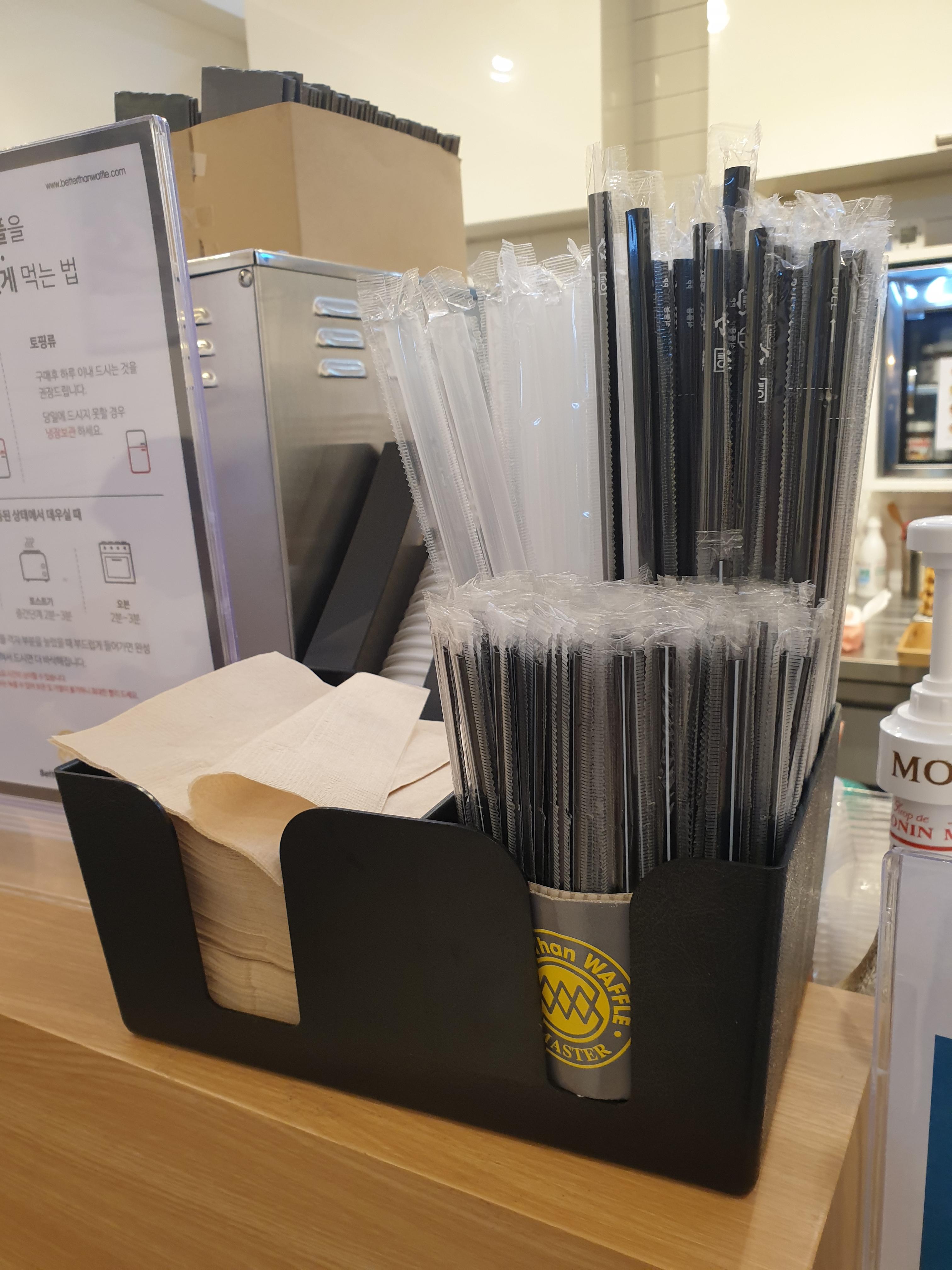 와플을 썰어 먹을 칼과 포크가 함께 나오고, 냅킨은 주문한 음식을 받는 곳에서 가져올 수 있다.