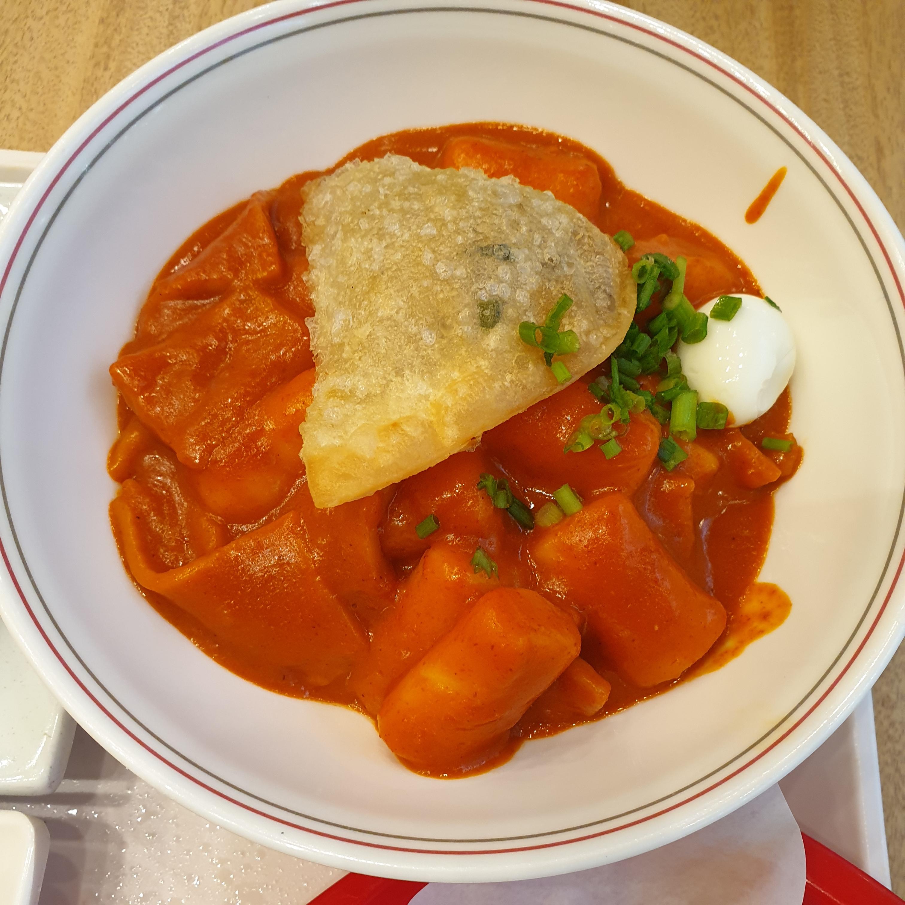 떡복이 위에 납작만두 하나와 메추리알 고명을 올려준다.