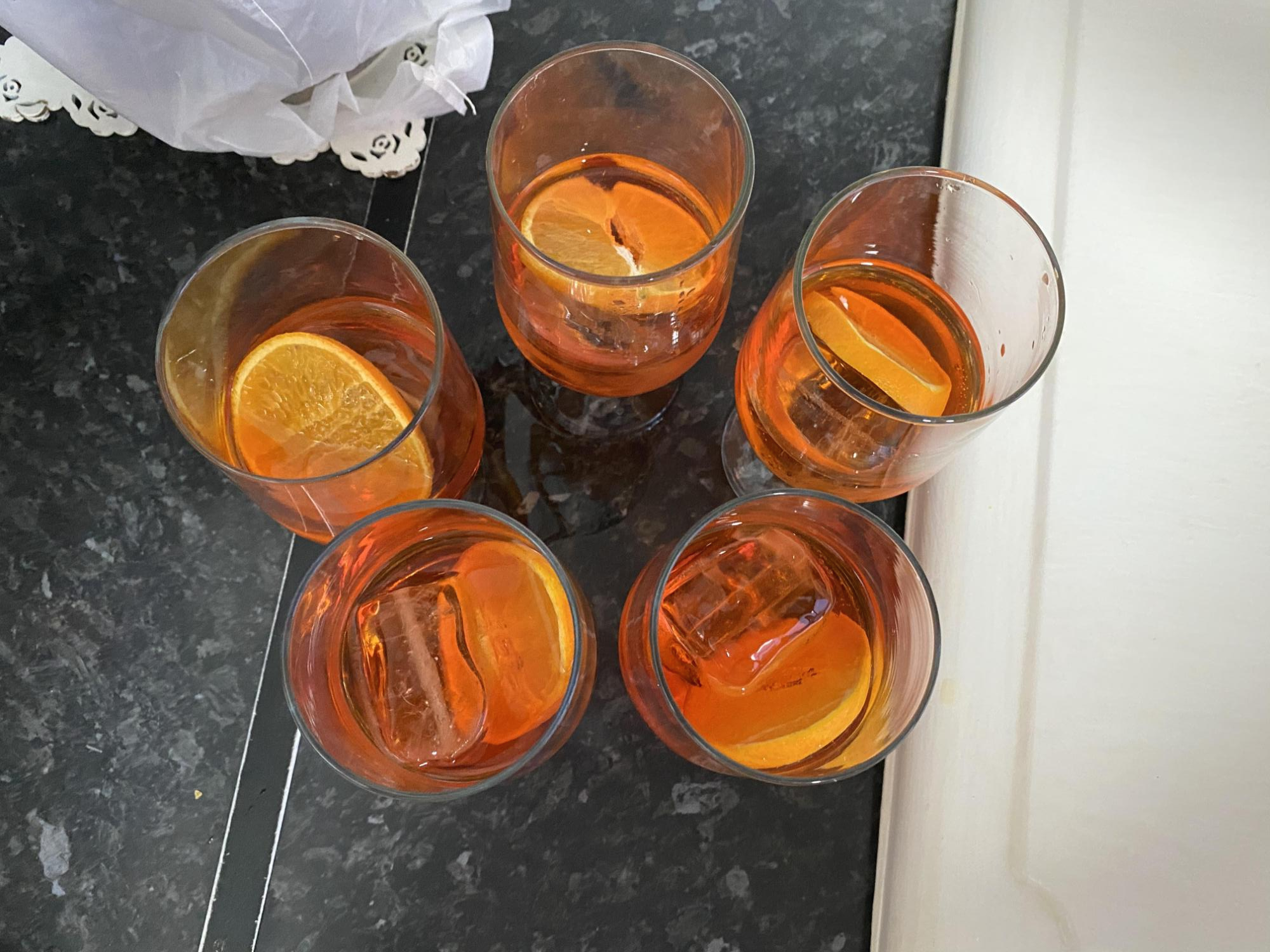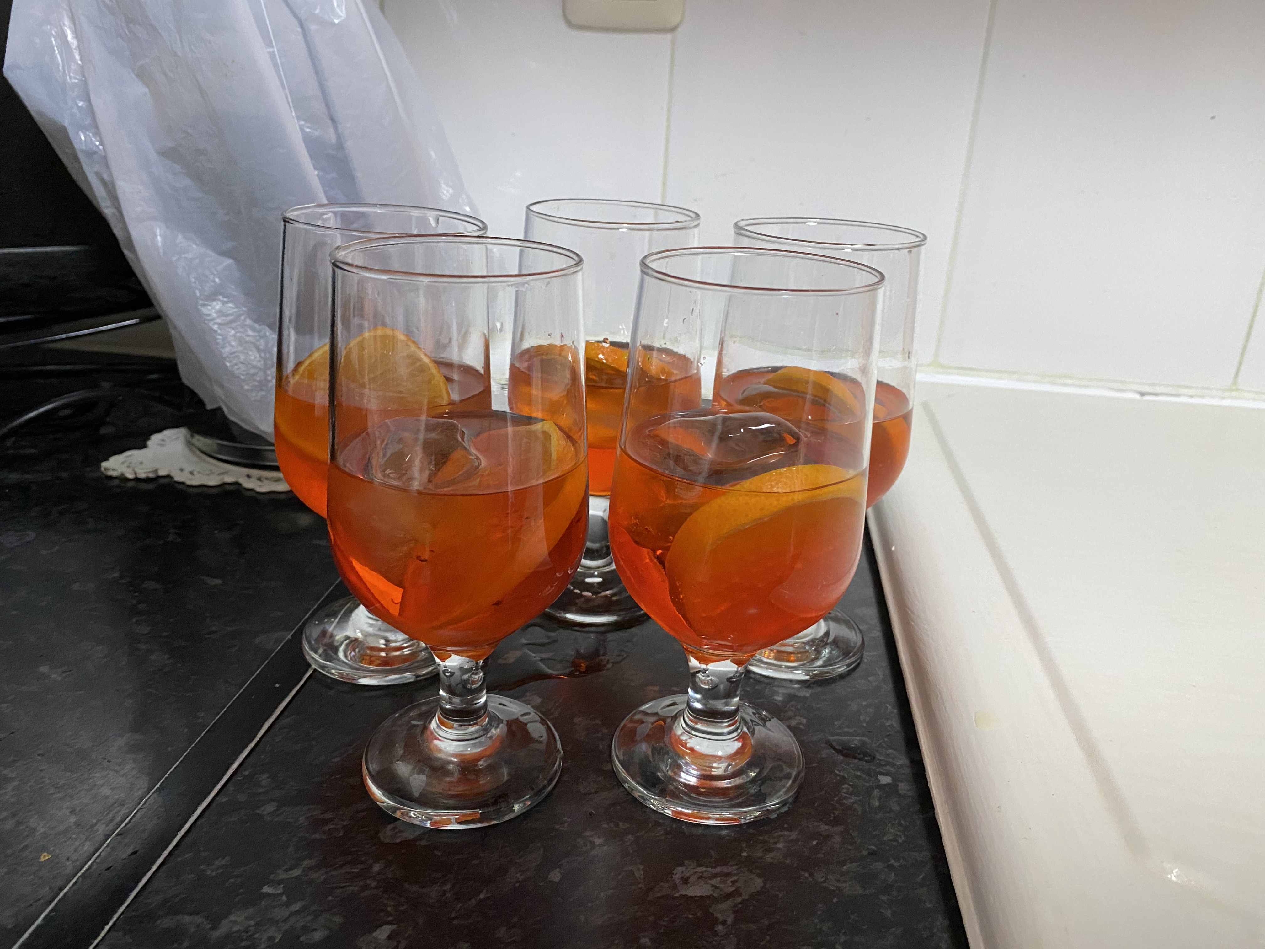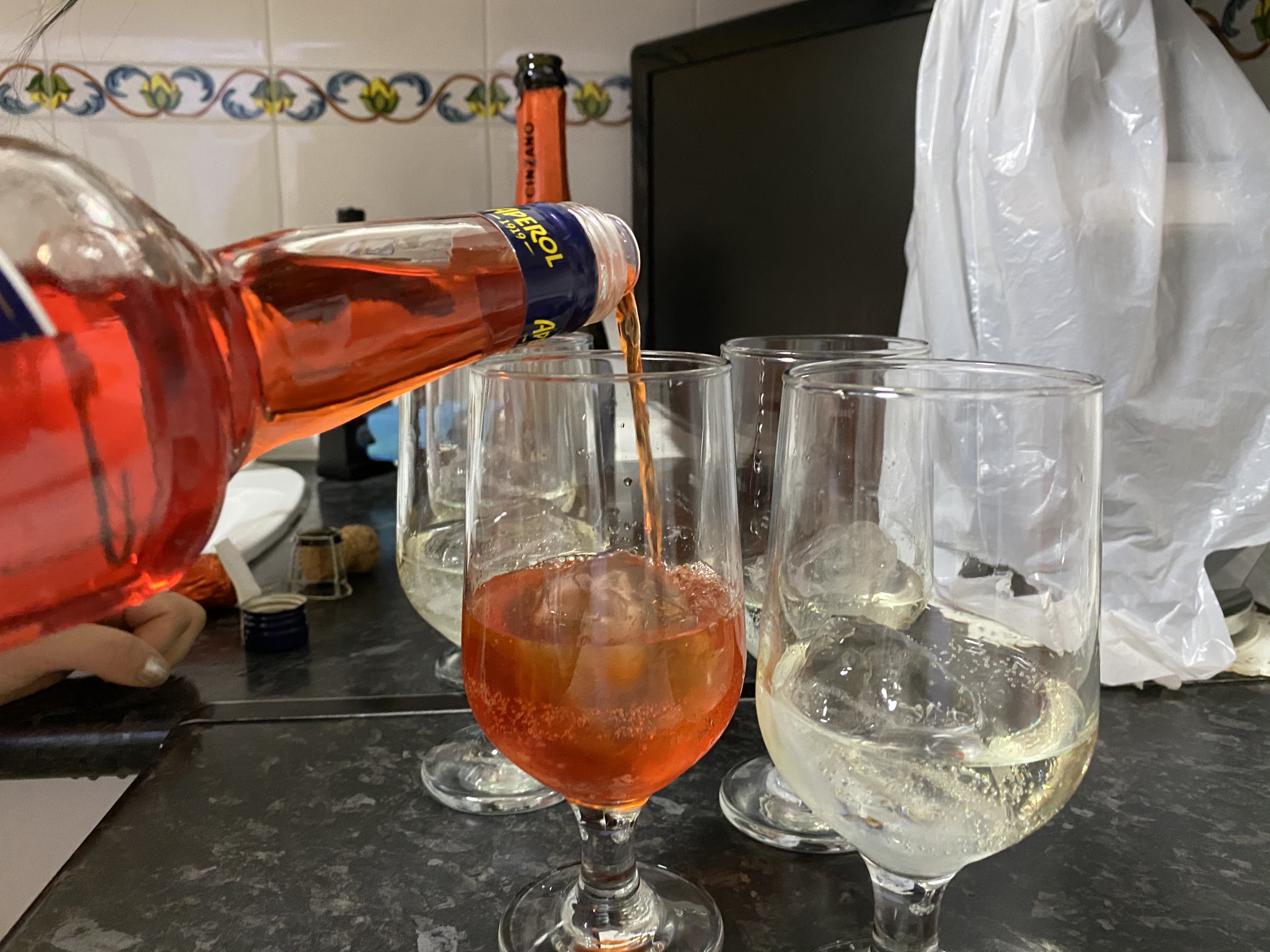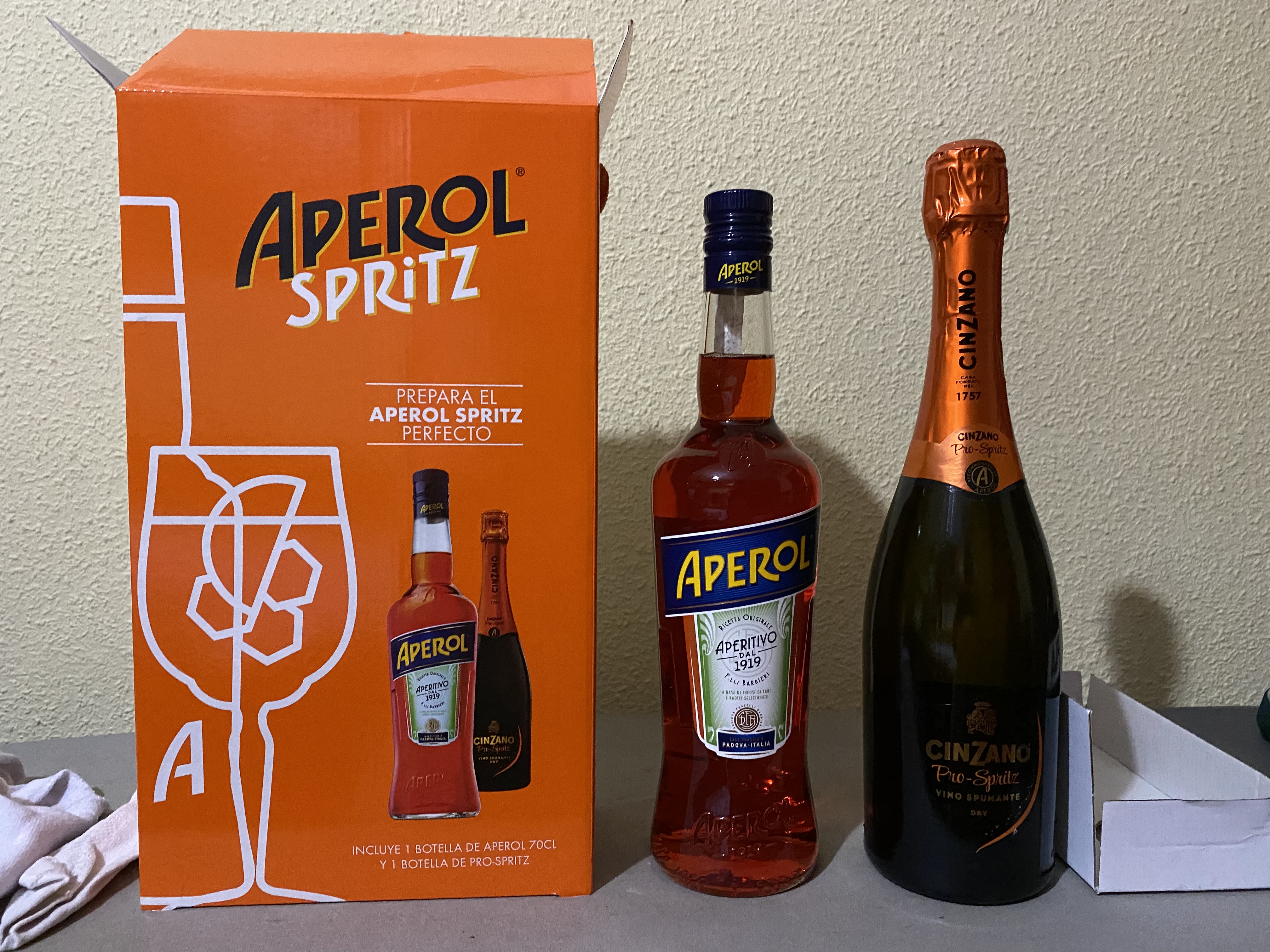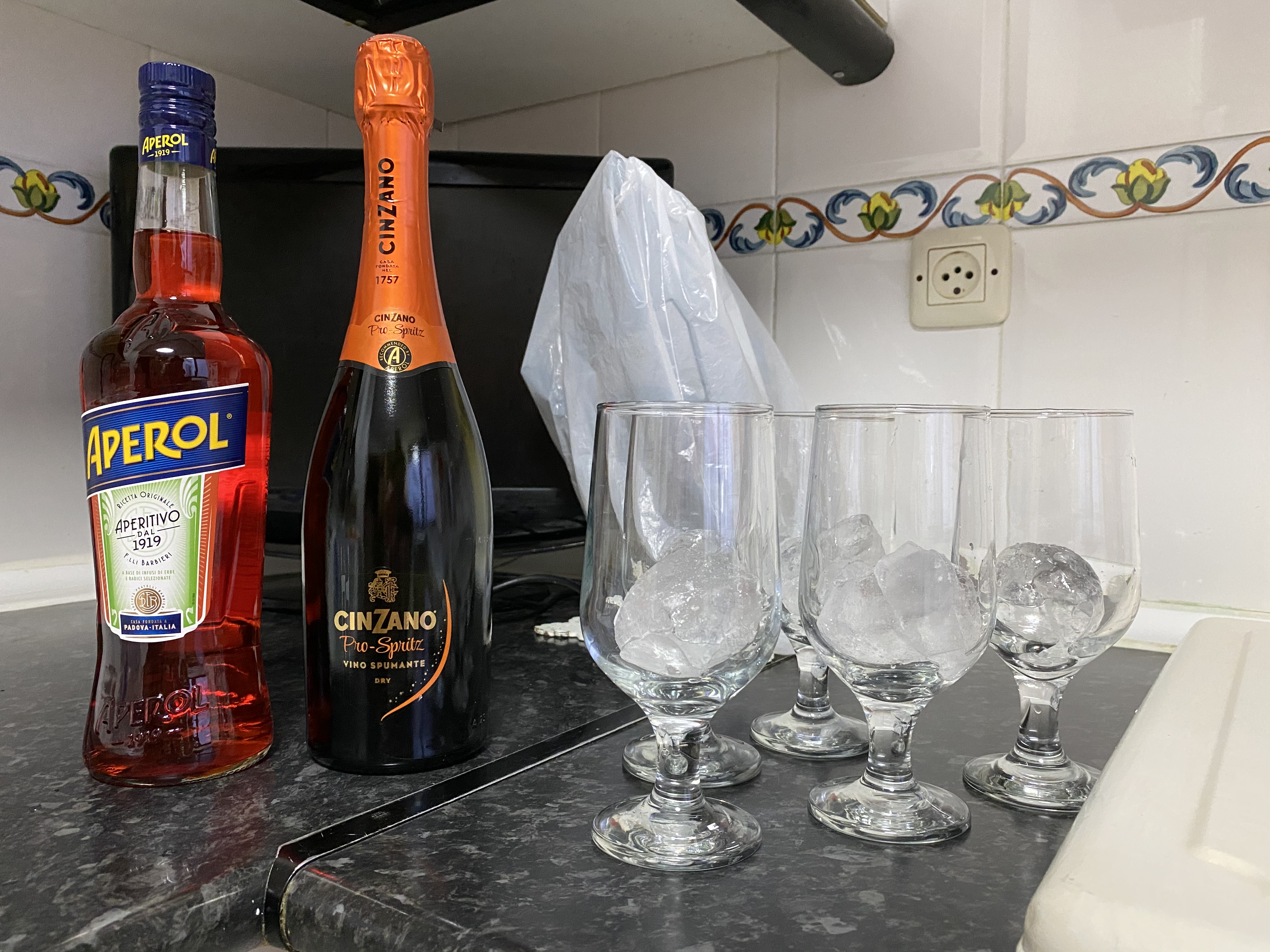 그리고 오후에는 남자친구 부모님께서 오셔서, 남자친구네 집으로 갔다. 가서 이탈리아의 음료 스프리츠를 마셨다. 이게 여행하다가 보면, 이탈리아 사람들이 바에서 다 마시고 있는 음료이다. 주황색 음료. 아페롤이라는 술과 스파클링 화이트 와인을 반반 섞어서 마시는 식전 음료란다. 예전에 로마 여행하다가 바에 가서 사람들이 다 마시고 있길래 나도 저거 달라고 했던 기억이 난다. 근데 막상 가져온 건 내가 원하는 게 아니었던 것 같다. ㅋㅋㅋ 마트에서 보고 한 2달 벼르고 있다가, 드디어!! 사 버렸다. 가격은 12.50유로이고, 스프리츠를 만들 수 있도록 술이 두 병이나 들어있으니, 막 비싼 건 아닌 것 같았다.