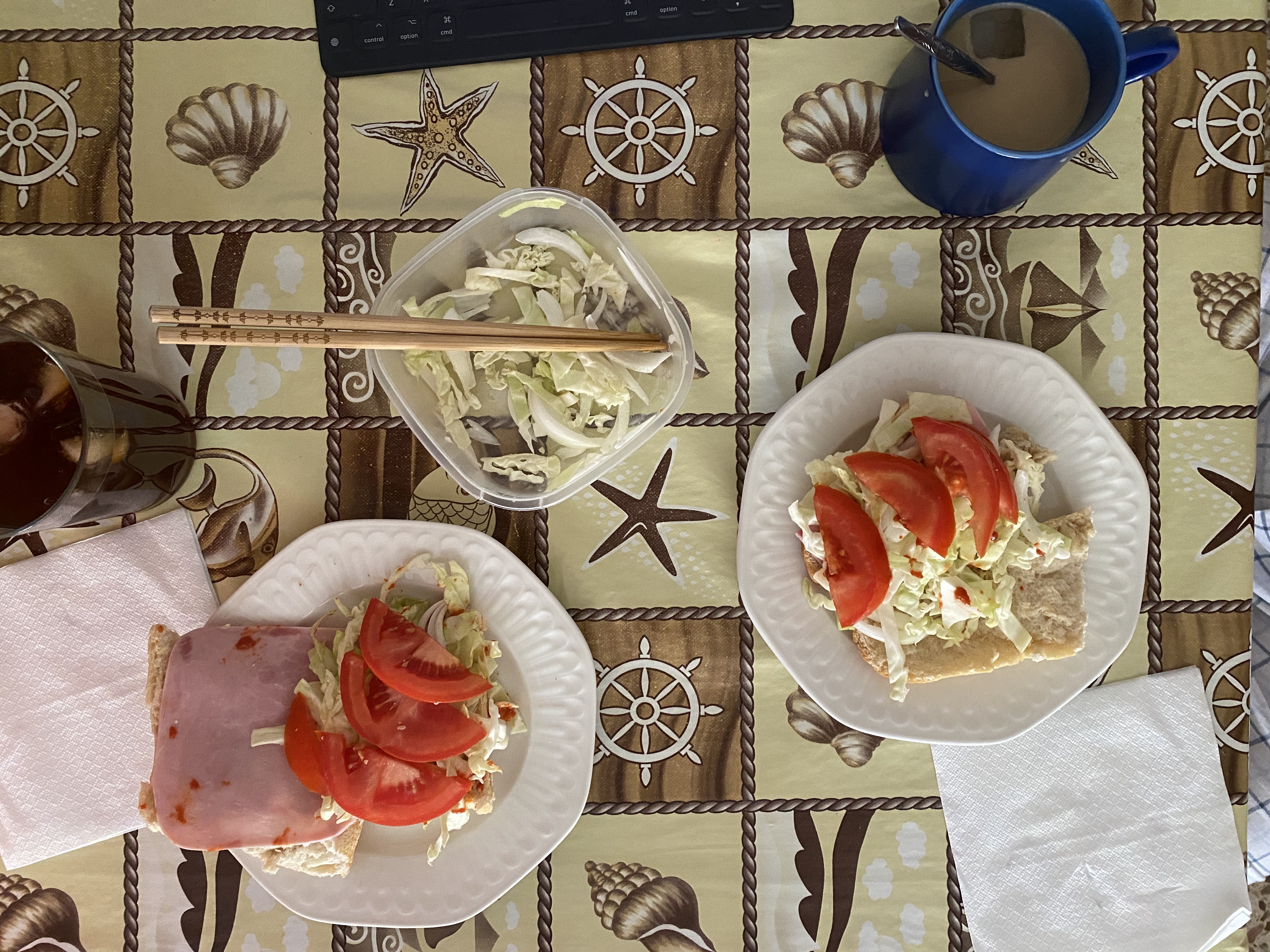 그리고 이틀 전에 만든 양배추 샐러드를 얹었다. (양배추 잘게 잘라서, 식초에 담가뒀던 양파와 섞고, 간 살짝 해주고, 마요네즈랑 섞어 주기!) 그리고, 위에 스리라차 소스를 뿌려주고, 뒤 늦게 토마토도 잘라서 얹어주었다.