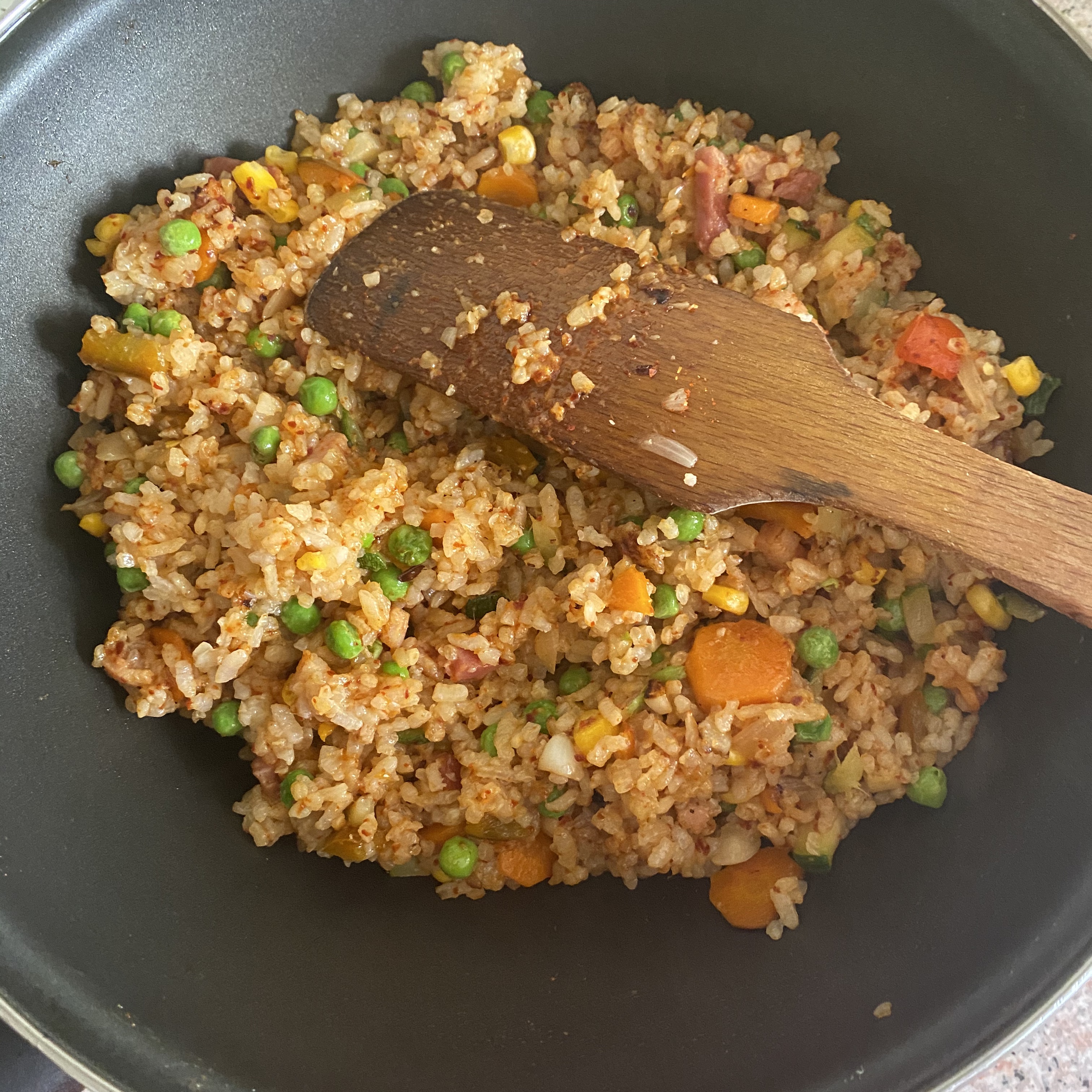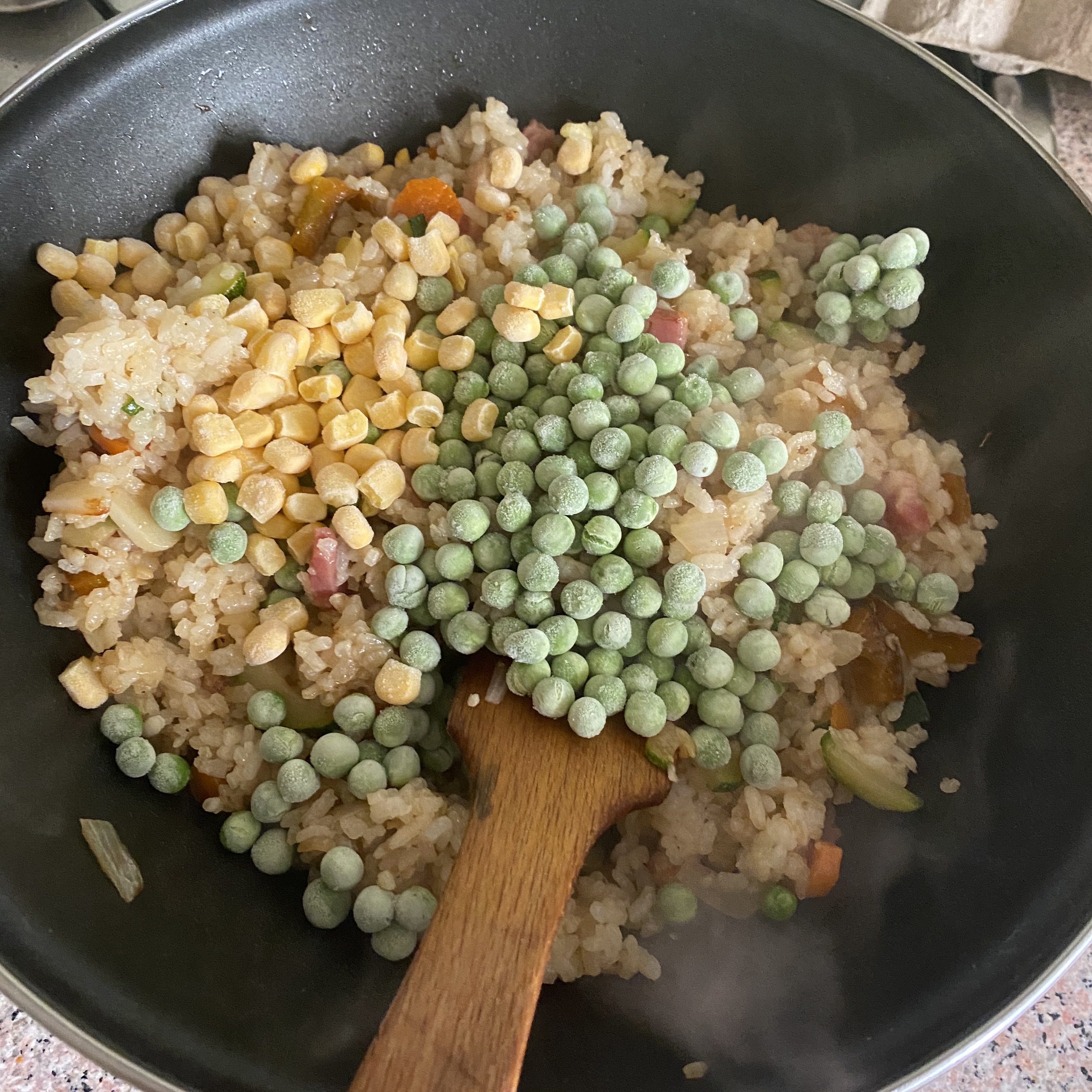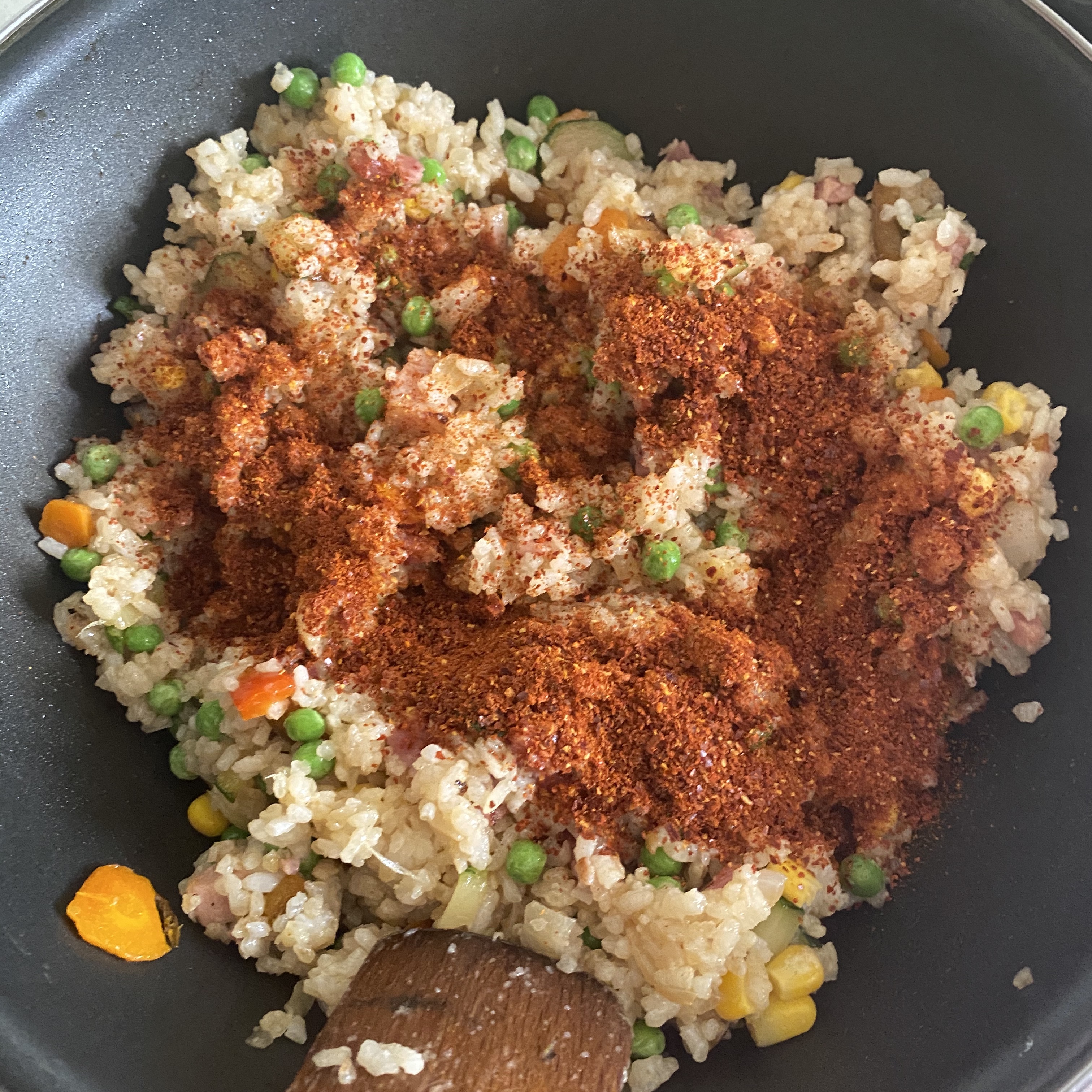 마지막에 깜박하고 넣지 않은 완두콩과 옥수수도 넣어줬다. 금방 익으니 사실 크게 상관은 없다. 그리고 고추가루까지 넣고, 잘 비벼주면.
