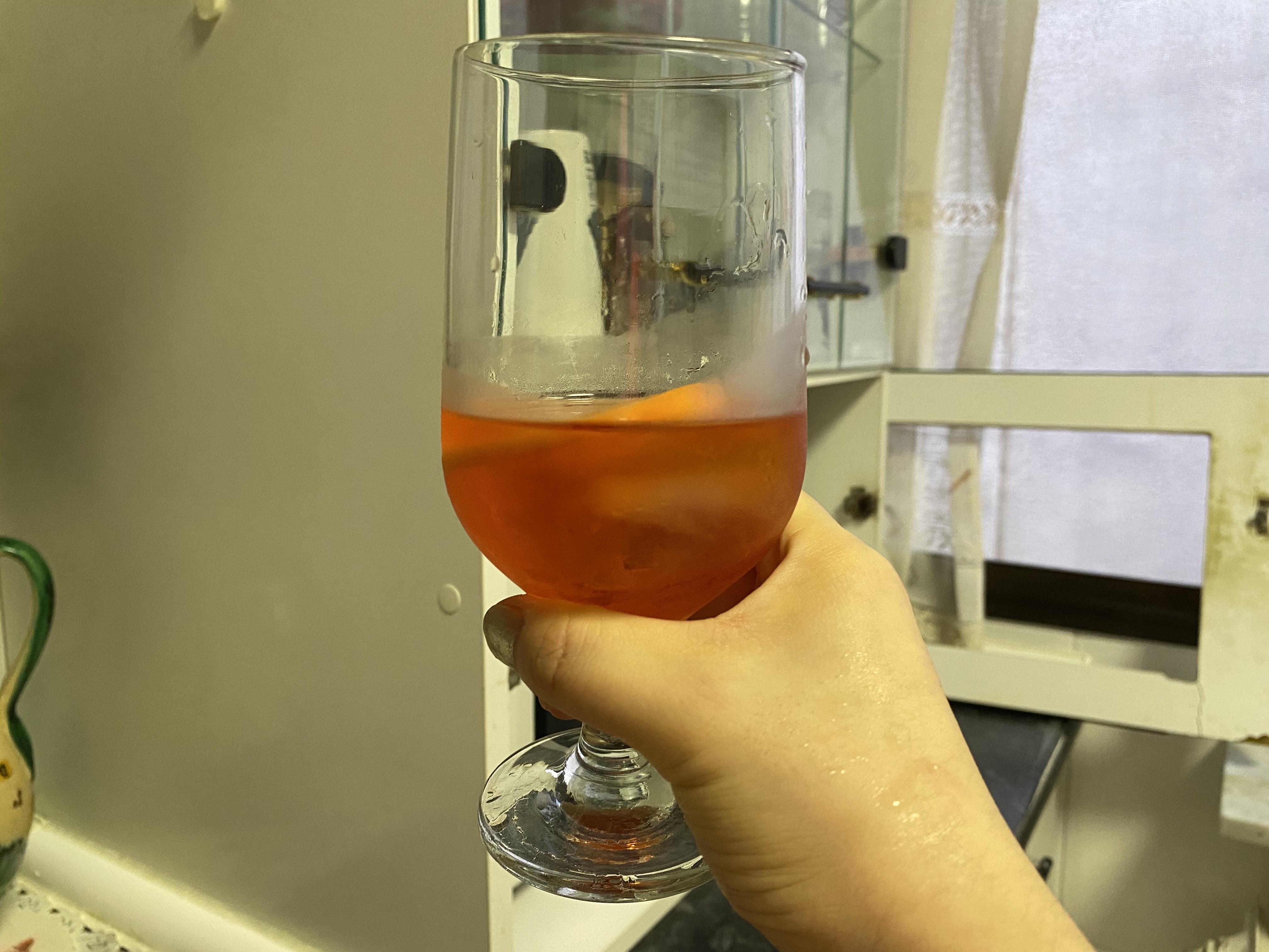 그리고 화이트 와인 부어준 만큼 아페롤을 부어준다. 마지막으로 원래는 오렌지를 넣어야 하는데, 냉장고에 귤만 있길래 귤을 넣어서 완성했다.