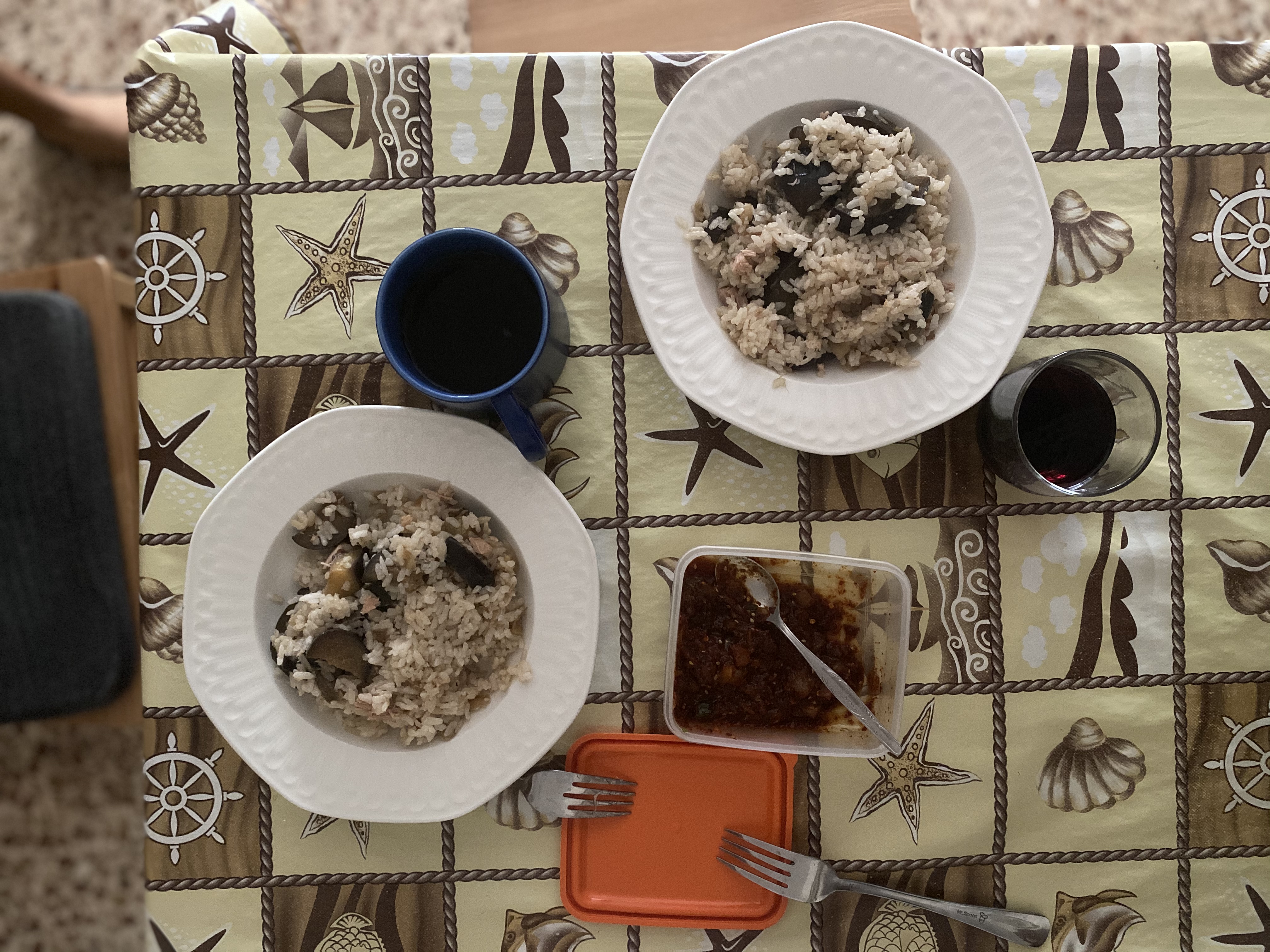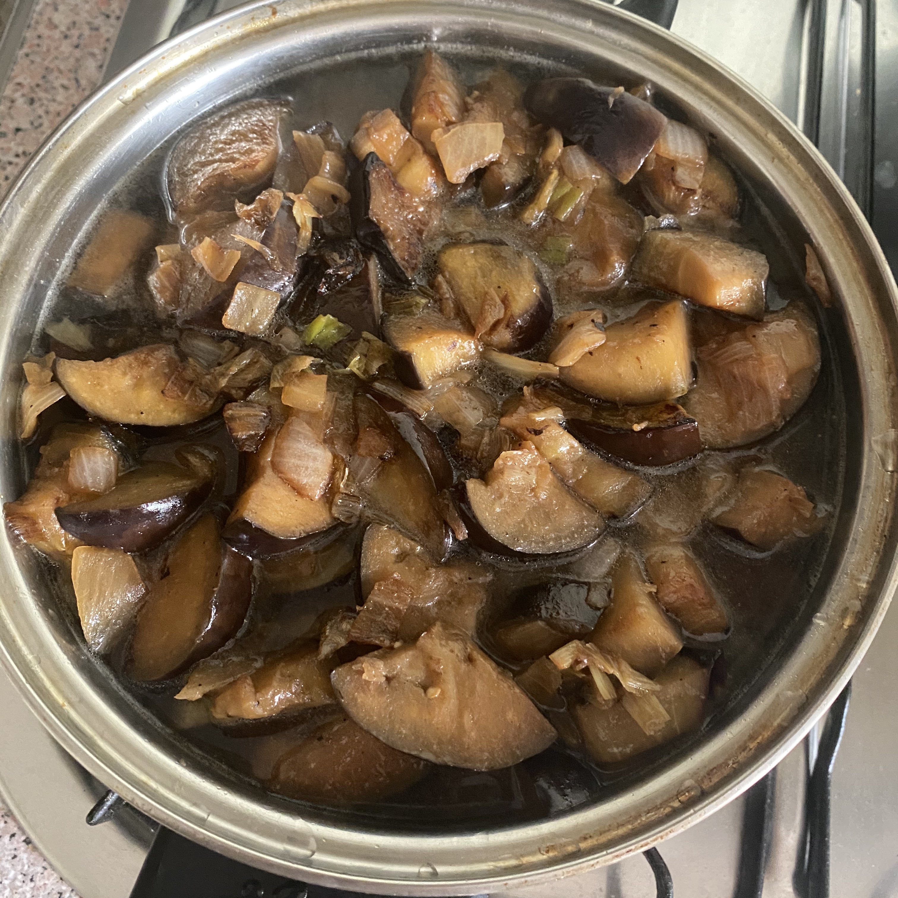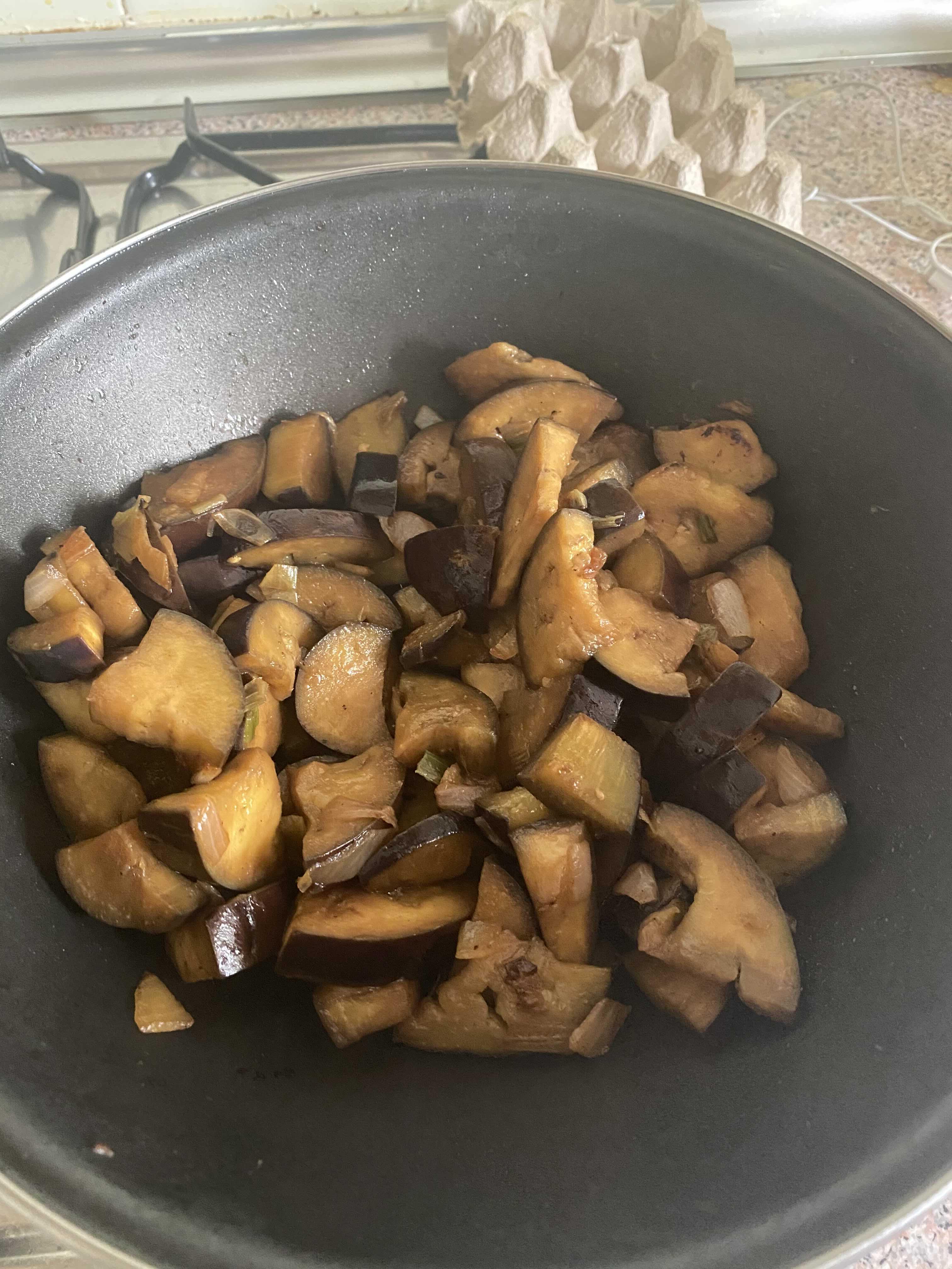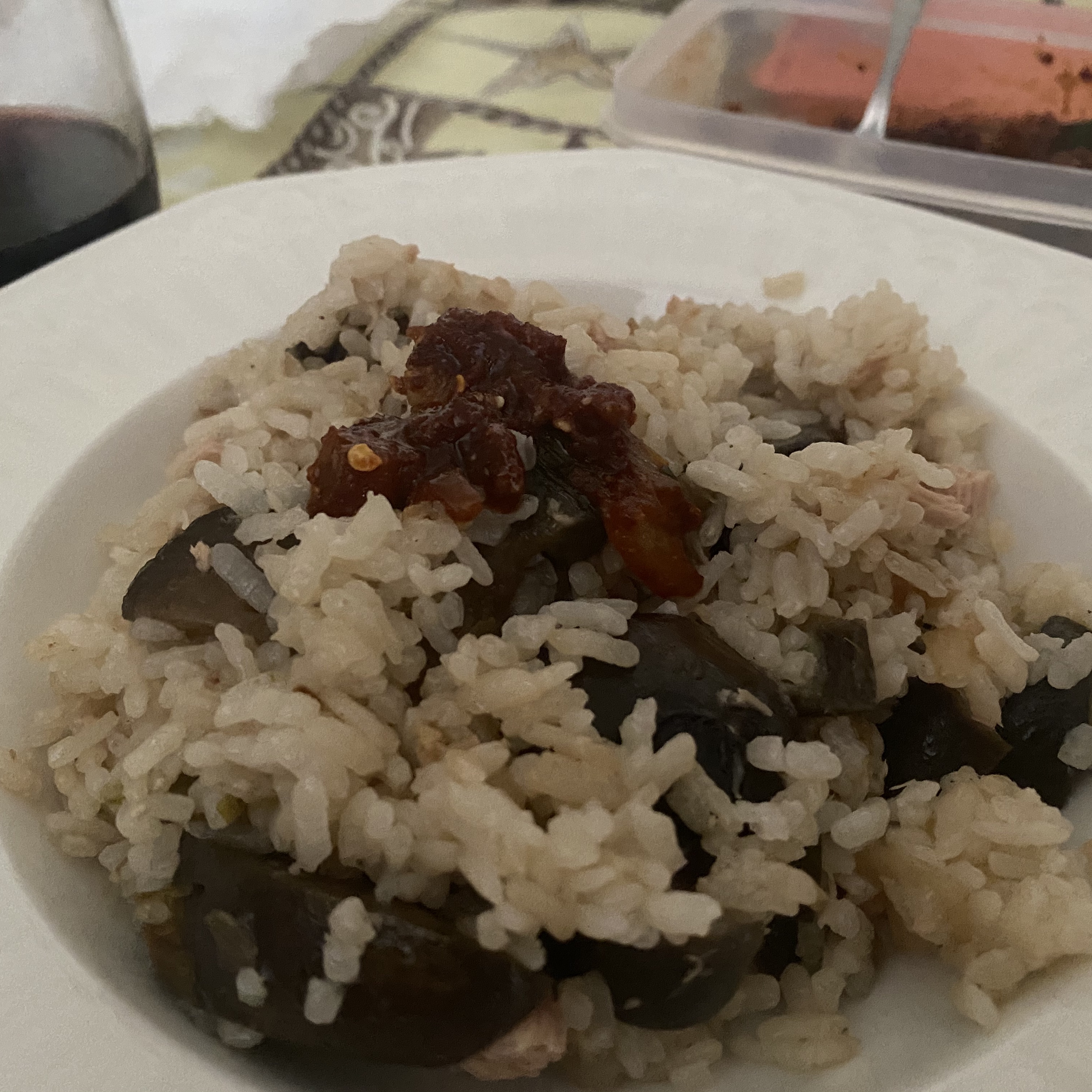 만들고 나니 반찬으로 먹어도 너무 충분할 것 같다. 쌀은 미리 씻어놨었다. 그리고 요리된 가지를 그 위에 얹었더니 넘칠 것 같았다. 다행히 넘치지는 않았다.