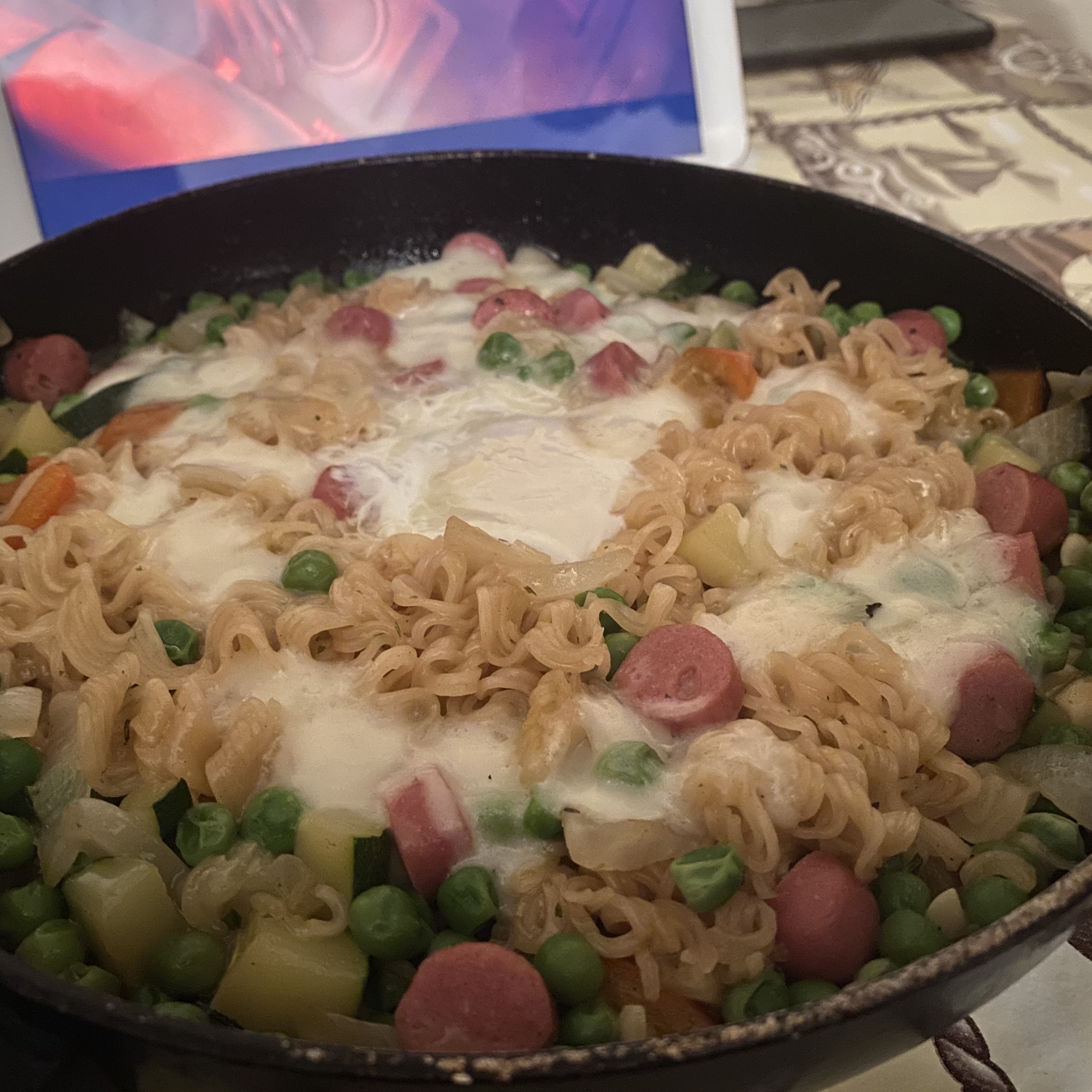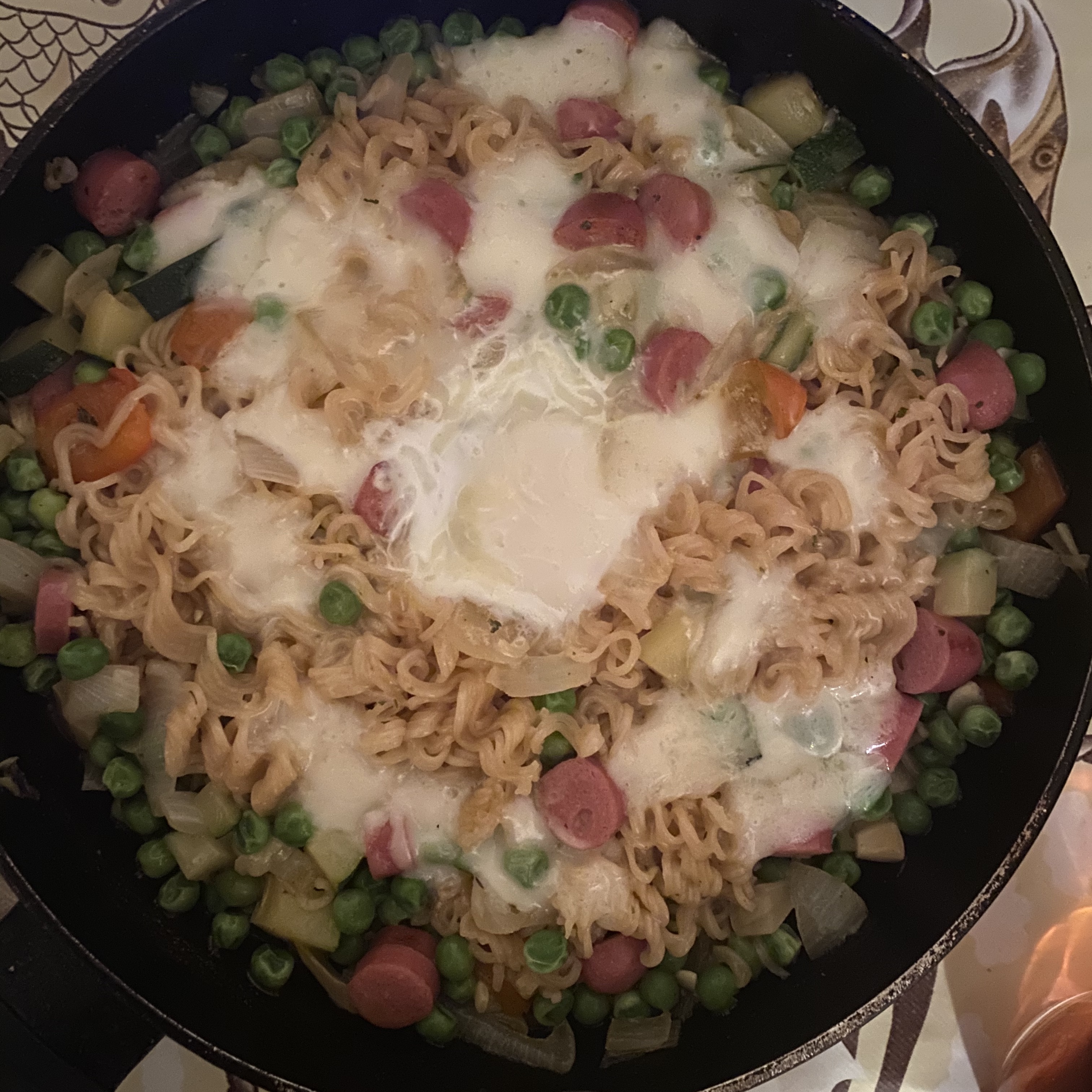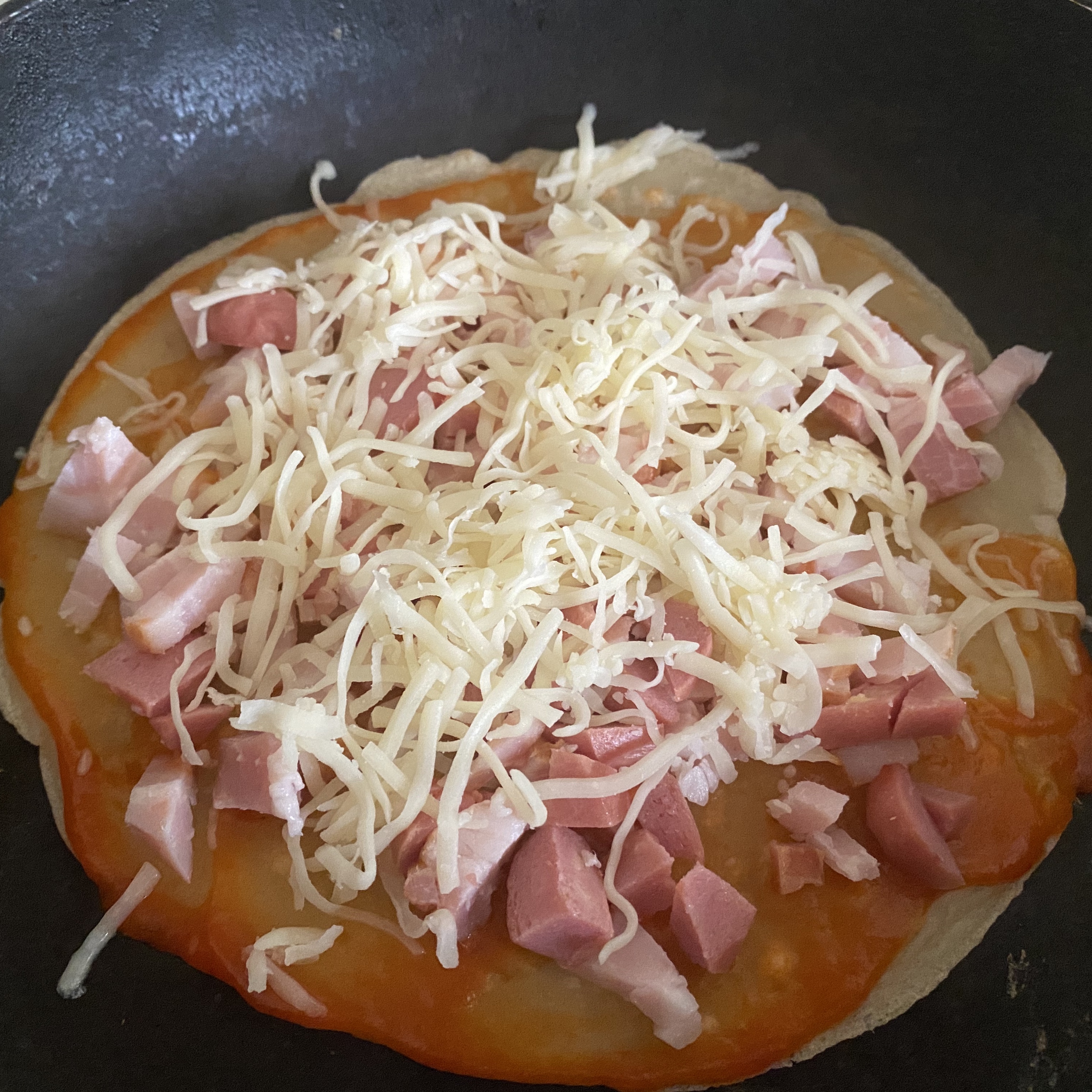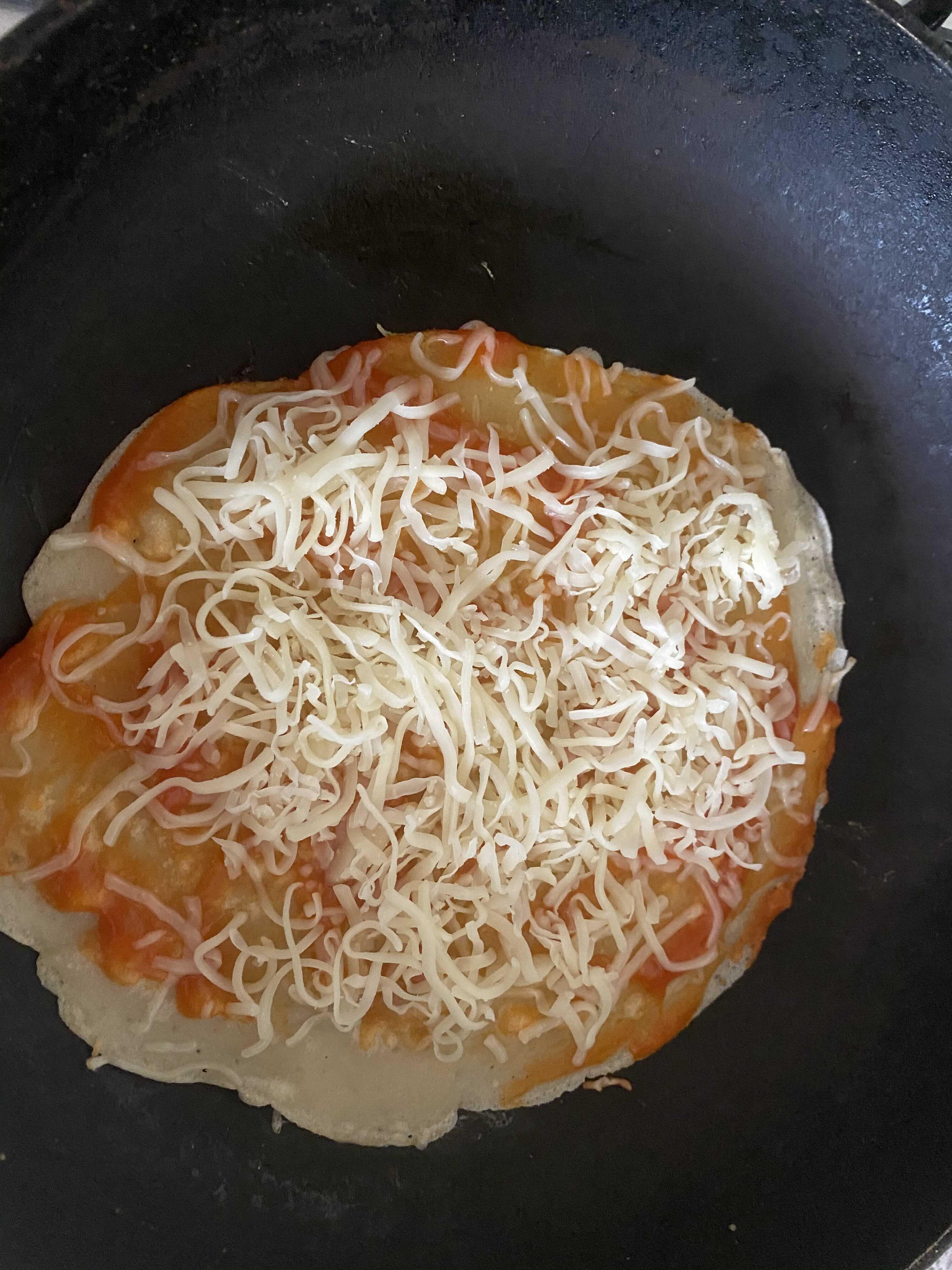 하나는 토마토 소스에 소시지를 잘라서 넣고, 옥수수 넣고 치즈를 얹어줬다. 그리고 후라이팬 뚜껑을 살짝 닫아주고, 치즈다 녹기만을 기다리면 끝.