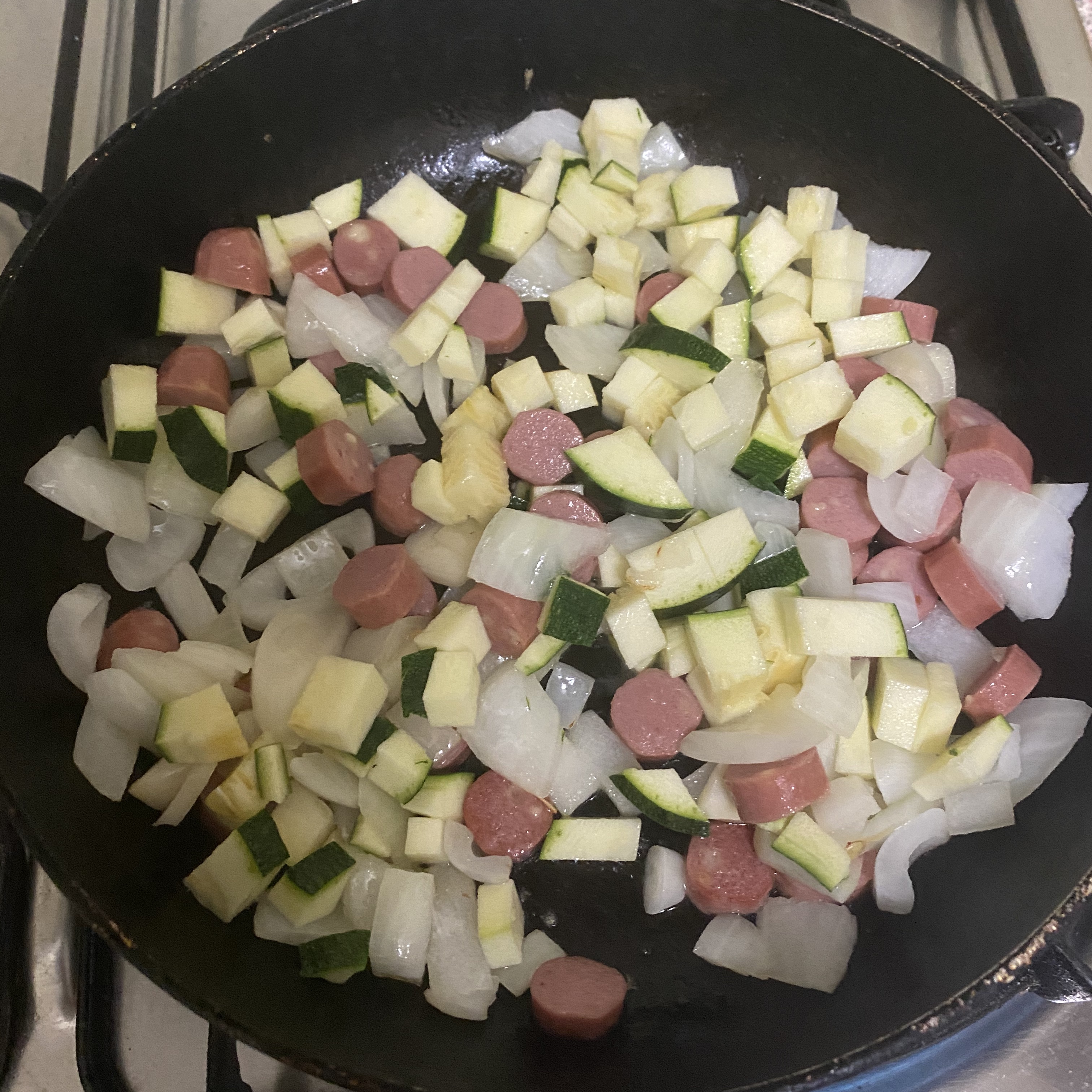 이 라면으로 둘이서 배를 채우기 위해선 뭔가 넣어야 한다 ㅎㅎ 맨날 먹는 소시지, 양파, 마늘을 넣어주고, 애호박도 잘게 잘라서 넣어줬다.
