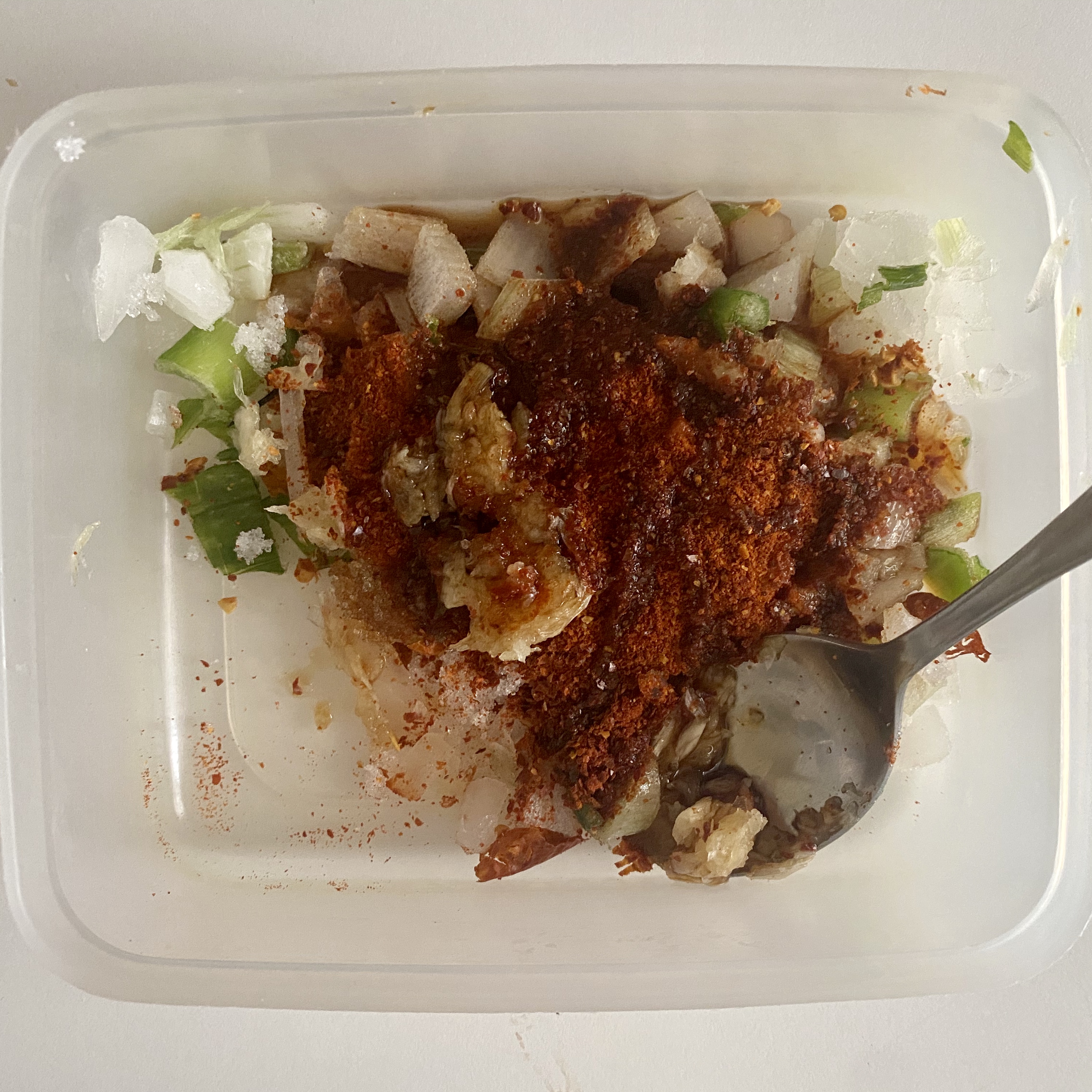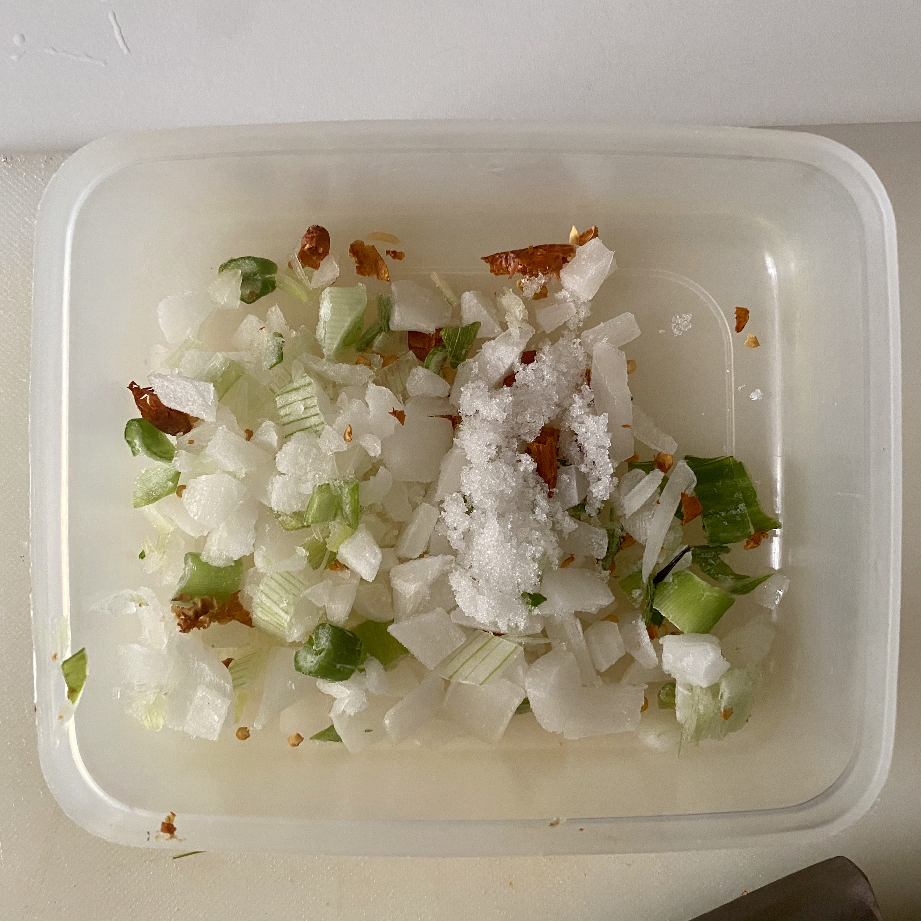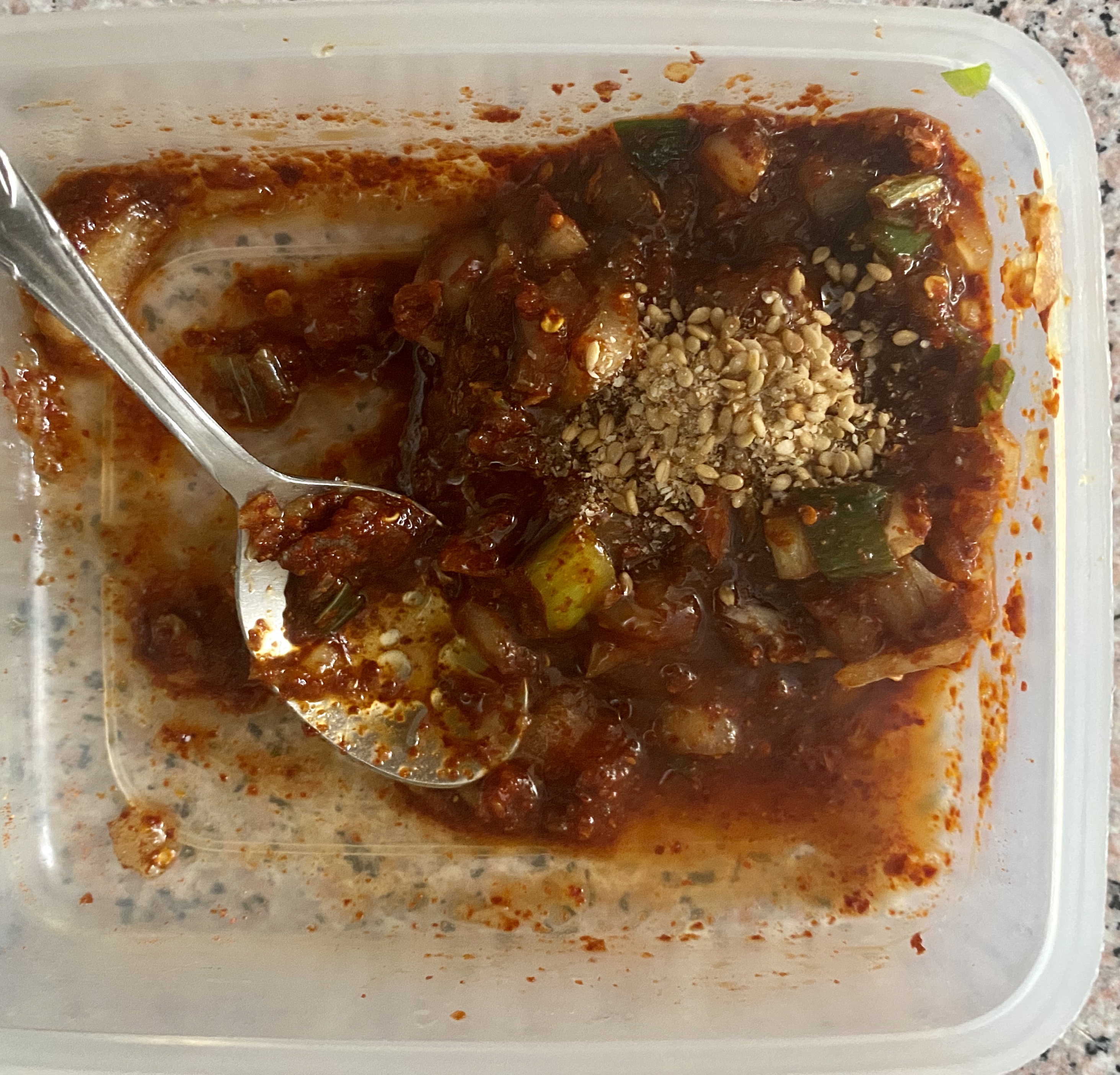 가지밥을 만드는 동안 양념장을 만들어 주었다. 파 냉동했던 것 꺼내서 넣고, 나는 청양고추가 없으니 매운 마른 고추 Cayena 카제나 도 잘라서 넣고, 설탕 한 1 작은 숟가락 넣어줬다. 고춧가루도 넣고, 마늘도 다져서 넣고, 간장과 참기름도 넣고 쉐낏쉐낏 해 주었다.