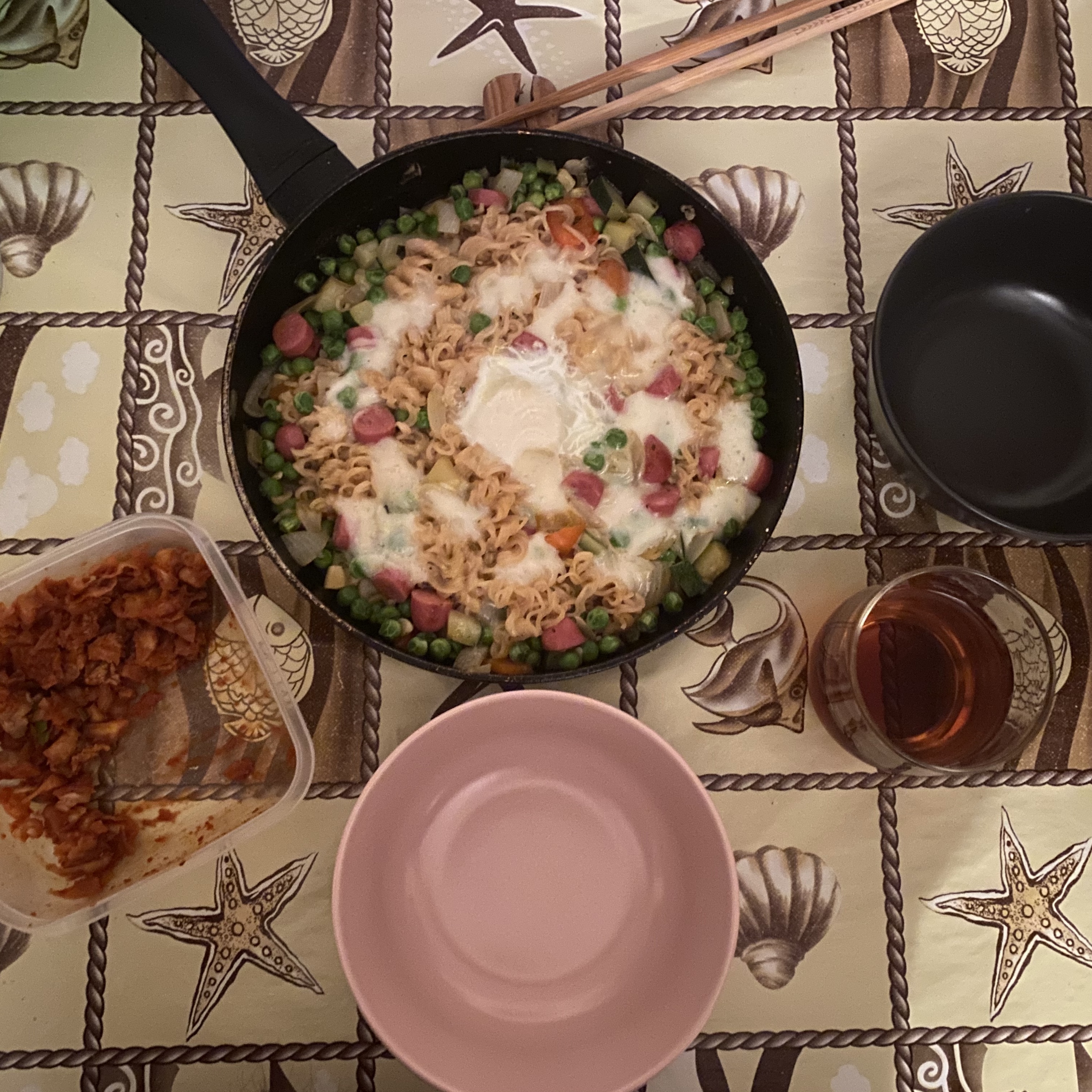 김치도 꺼내서 같이 먹었다. 양이 와!!! 배불러 막 이런 정도는 아니었지만, 간단히? 먹기 딱 좋은 정도였다. 나중에 아무것도 넣기 싫어서 라면만 먹으려면 한 사람 당 두개는 끓여야 한다.