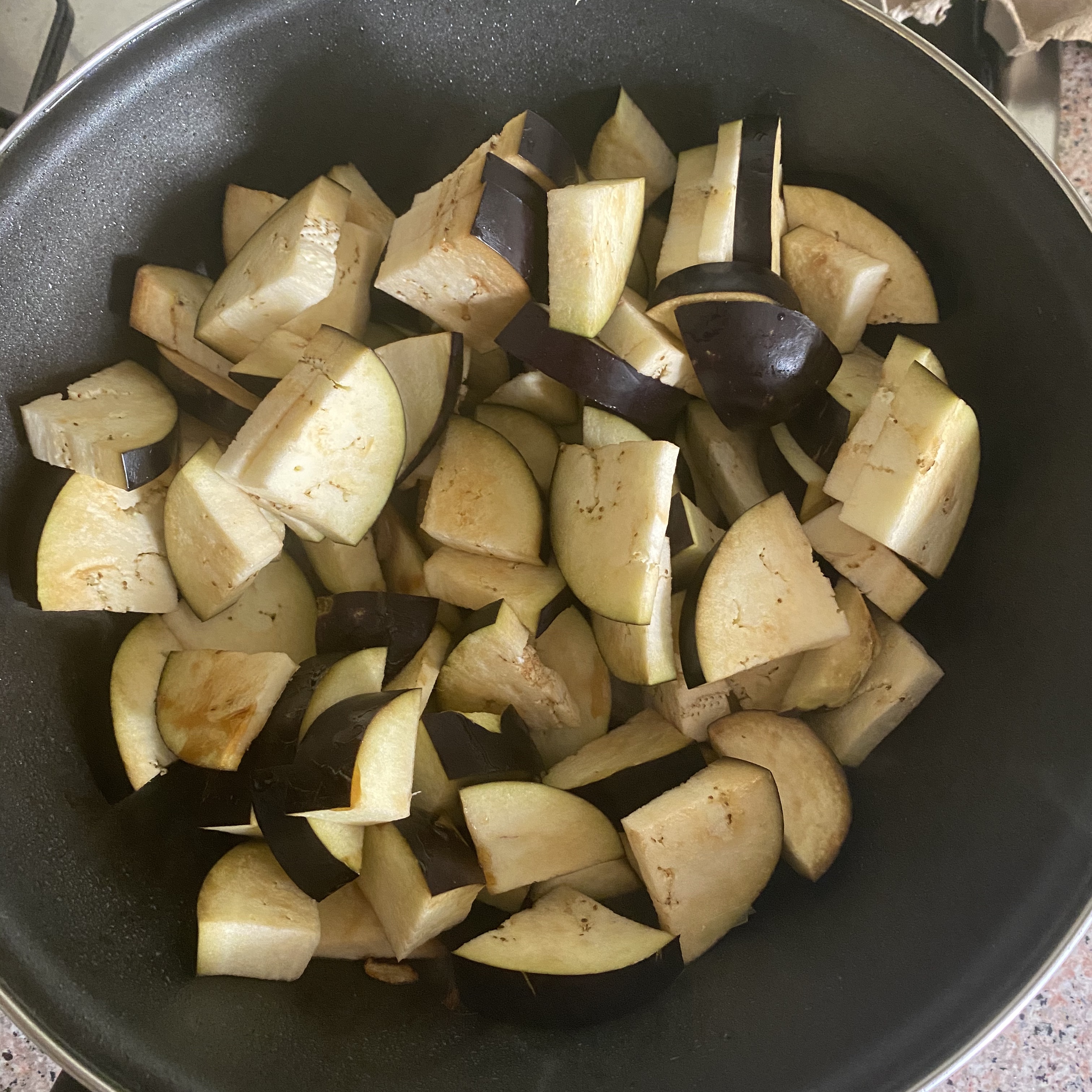 약간 연기가 나는 것 같을 때 가지 자른 것을 전부 넣어주고, 숨이 죽을 때까지 계속 볶아줬다. 밑에 가지가 양념장을 다 먹어버렸지만, 열심히 위아래를 섞어줬다.