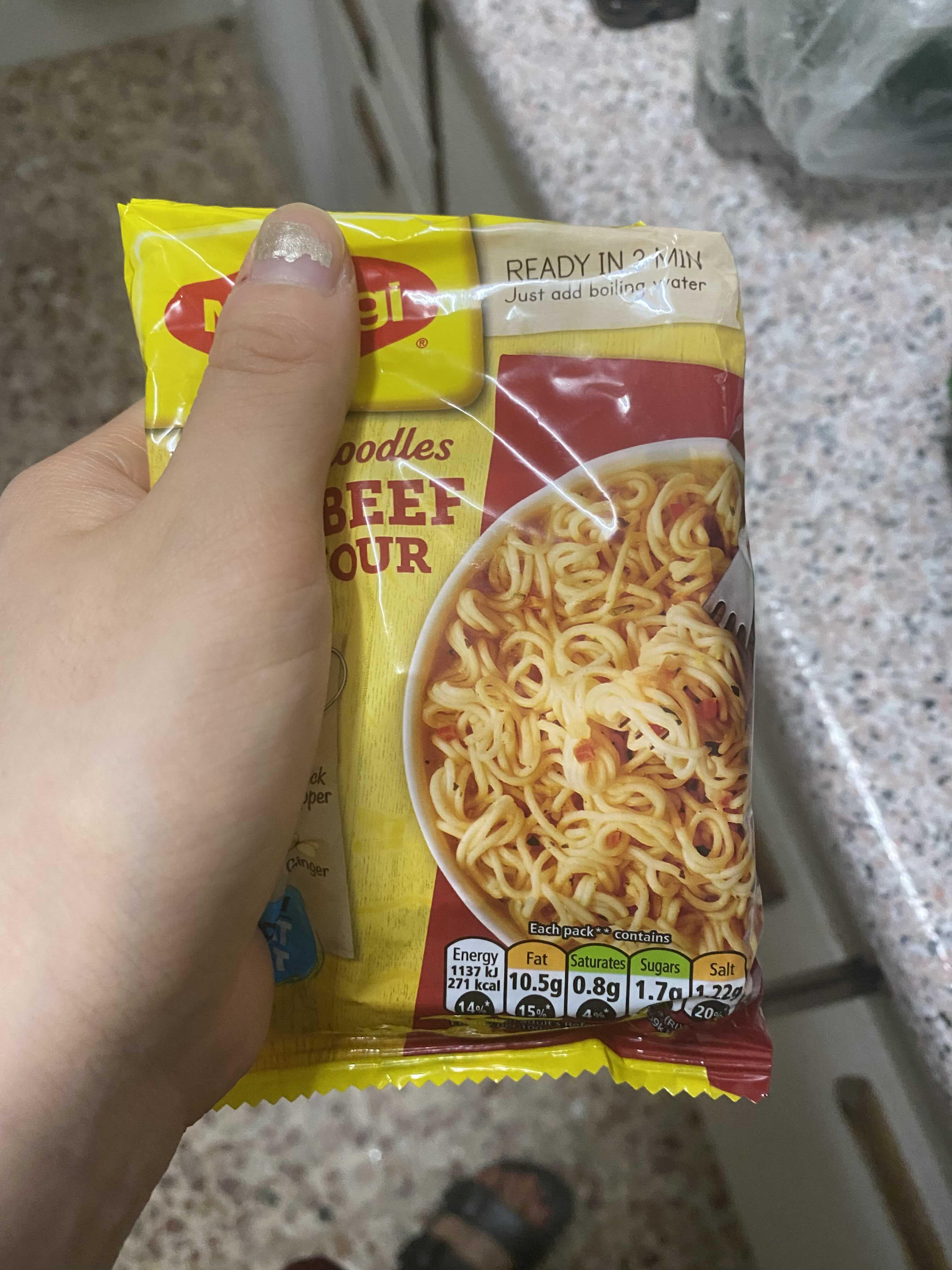 저번에 사온 스페인 라면? 유럽 라면? 바베큐 맛이다. 네개 팩으로 1.50유로이길래 샀더니, 겁나 작다. 하나에 58그람? 우리나라 라면의 반 크기다. 내 손이 전혀 큰게 아닌데, 딱 내 손바닥만하다.