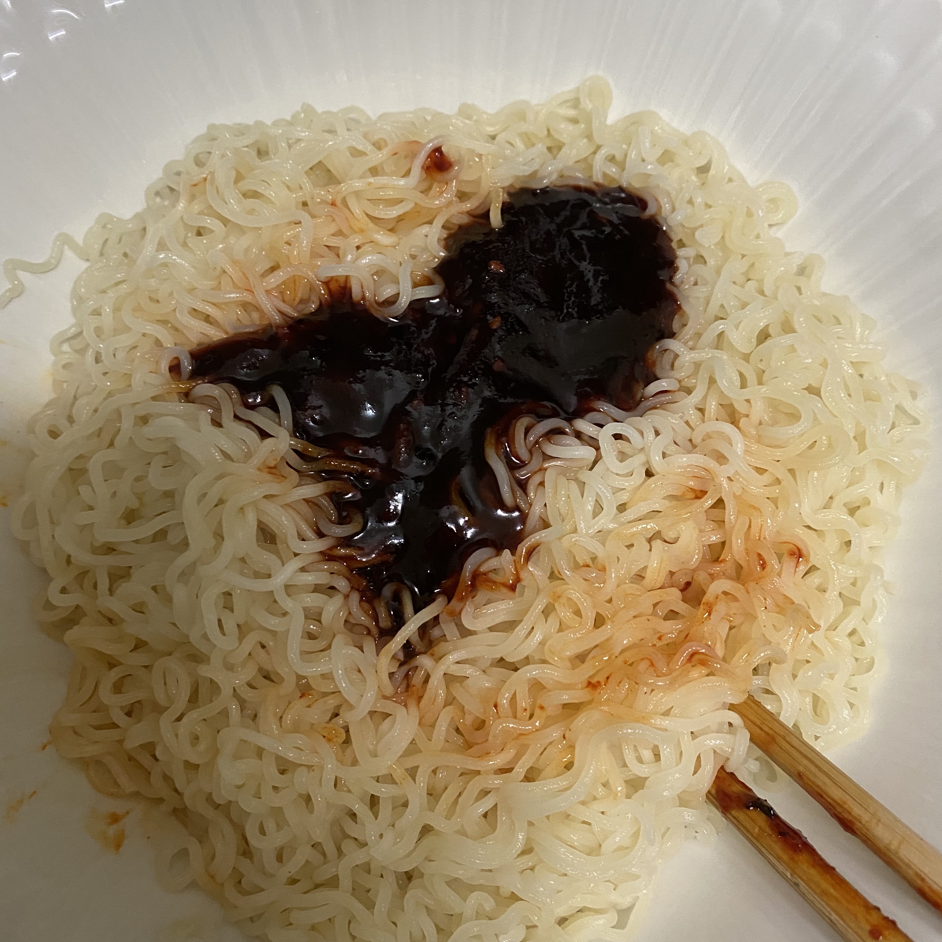 빨리 하기 위해서 미리 물을 끓여놓고, 면을 후다닥 삶았다. 다 삶아서 찬물에 헹궈주고, 소스를 뿌려준다.