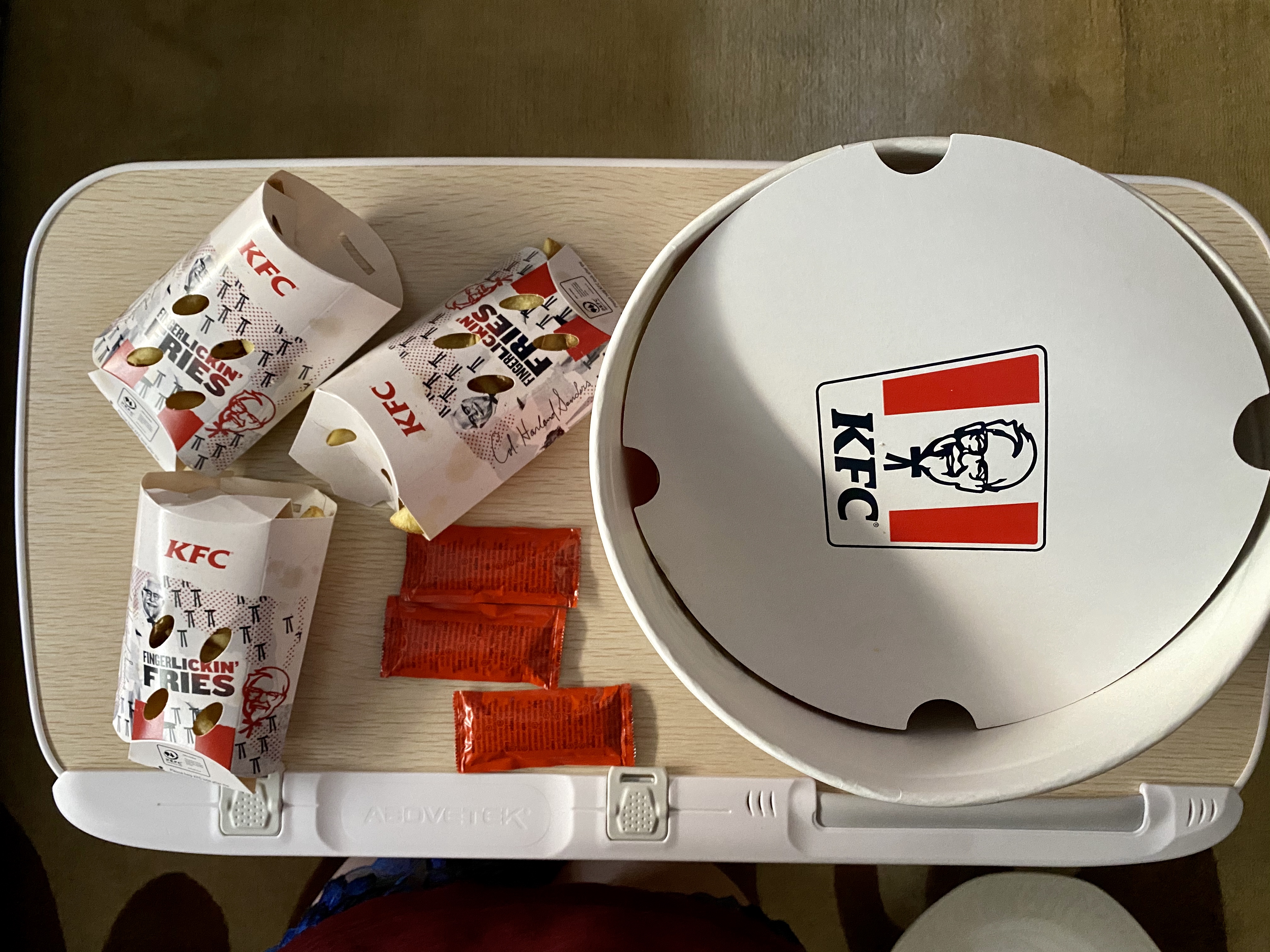 그래서, 점심에 뭘 먹기로 했냐면! KFC를 시켜먹기로 했다. 마침 Uber eats 8월 쿠폰도 계속 오길래, 시켰다. 50%로 할인해준다고 했는데, 최대 할인 금액이 8유로다 ㅡㅡ 메뉴는 3인 메뉴로, 9개 조각, 감자칩 3개 , 그리고 음료수는 립톤으로 시켰다. 총 가격은 할인받아서 18.79유로였다. 우리나라 치킨이랑은 정말 비교도 안되지만, 그냥 가끔 닭튀김이 먹고 싶을 때, 종종 먹는다. 우리나라 치킨보다는 기름이 확실히 많고, 가끔 잘 튀겨지지 않아서 뼈 근처에는 빨간 부분도 조금 있다.