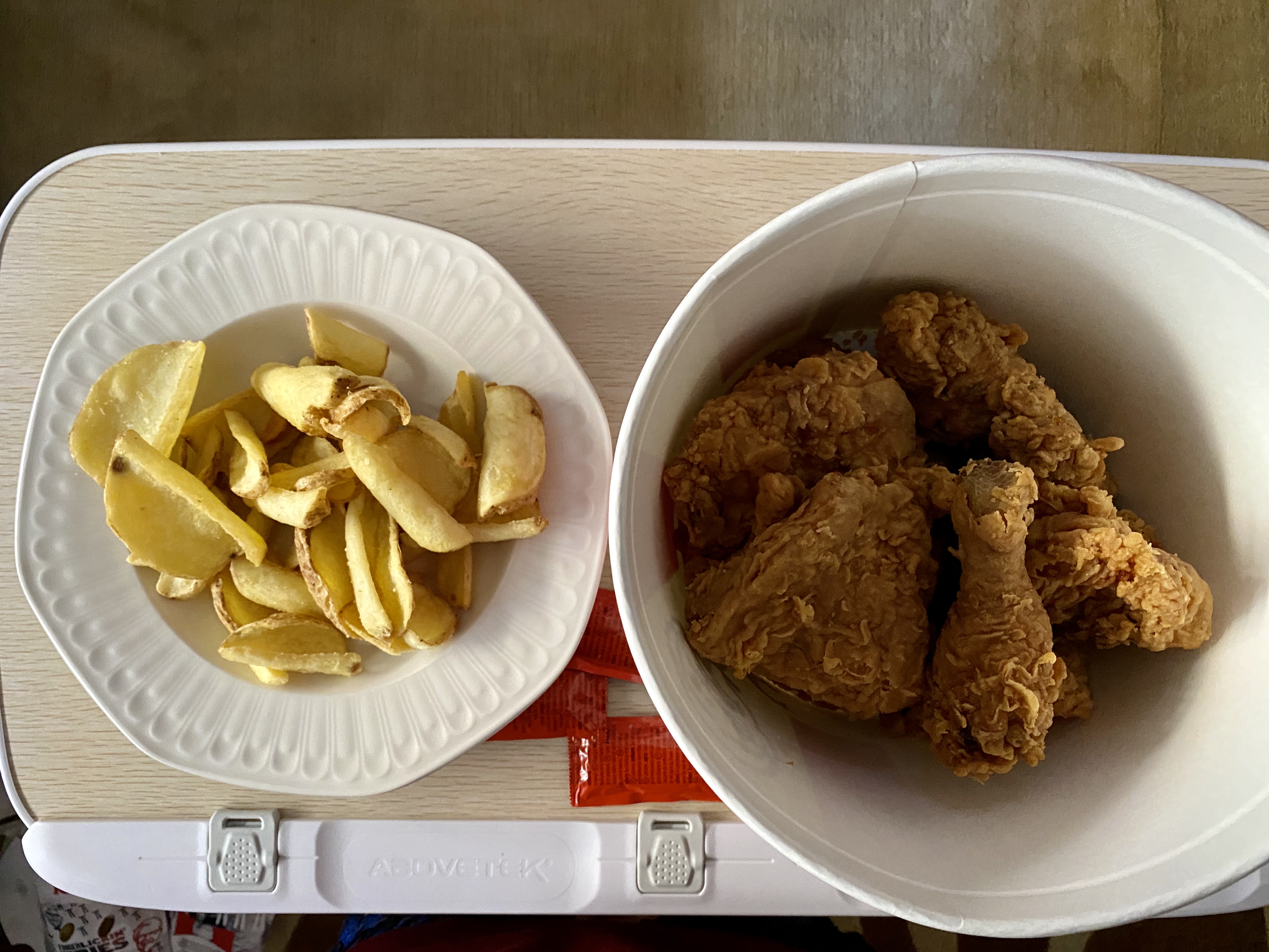 저기 닭 조각이 9 조각인거다. KFC는 한 마리 두 마리로 파는 게 아니라, 몇 인용으로 판다. 아마 2인분은 6조각, 3인분은 9조각 이런 식이다. 조각도 꽤 크다. 옆에 감자칩은 루스틱으로 시켰는데, 일단 2개정도만 그릇에 담아서 먹었다.