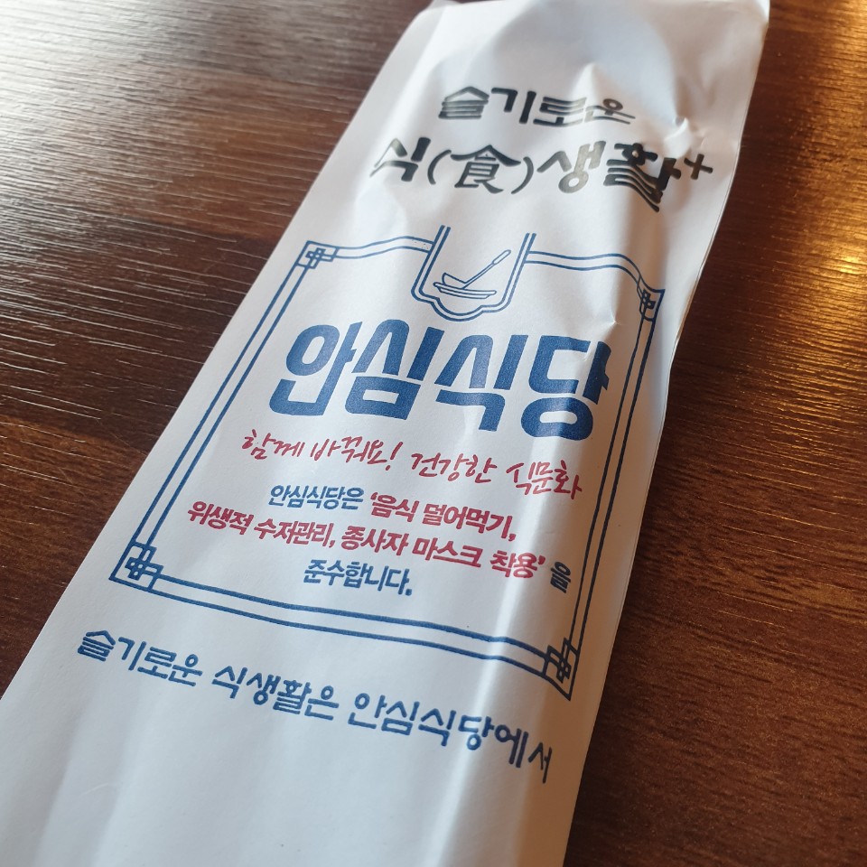 자리에 앉아서 테이블을 보니 여기는 코로나 안심식당이었다. 얼마 전에 코로나 방역수칙을 철저히 준수하는 음식점을 안심식당으로 지정한다는 뉴스를 봤었는데 이곳이 그런 식당인가보다!! 들어오자마자 발열체크, 출입자 명부 작성, 손소독을 하고 개별 포장이 된 수저와 직원들의 철저한 마스크 착용, 테이블 거리두기, 일정시간 환기까지 완벽하게 이루어지는 음식점이었다. 완전 감동