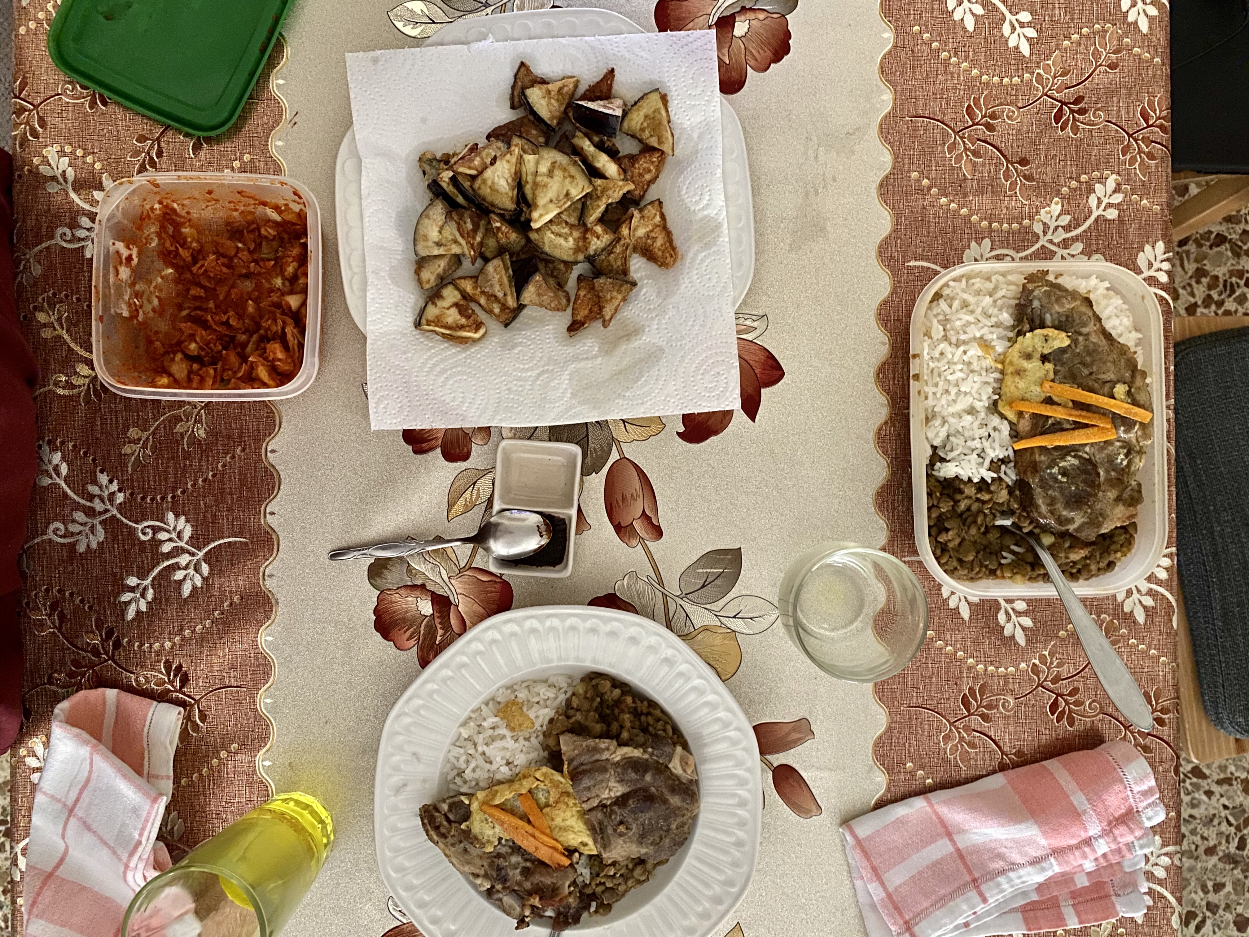 가지전은 이렇게 나왔다. 맛있겠다. 근데, 그냥 먹으면 조금 심심한 감이 있어서, 간장에 찍어먹었다 김치도 꺼냈고, 전 날 남은 렌틸콩까지 데워서 먹었다.