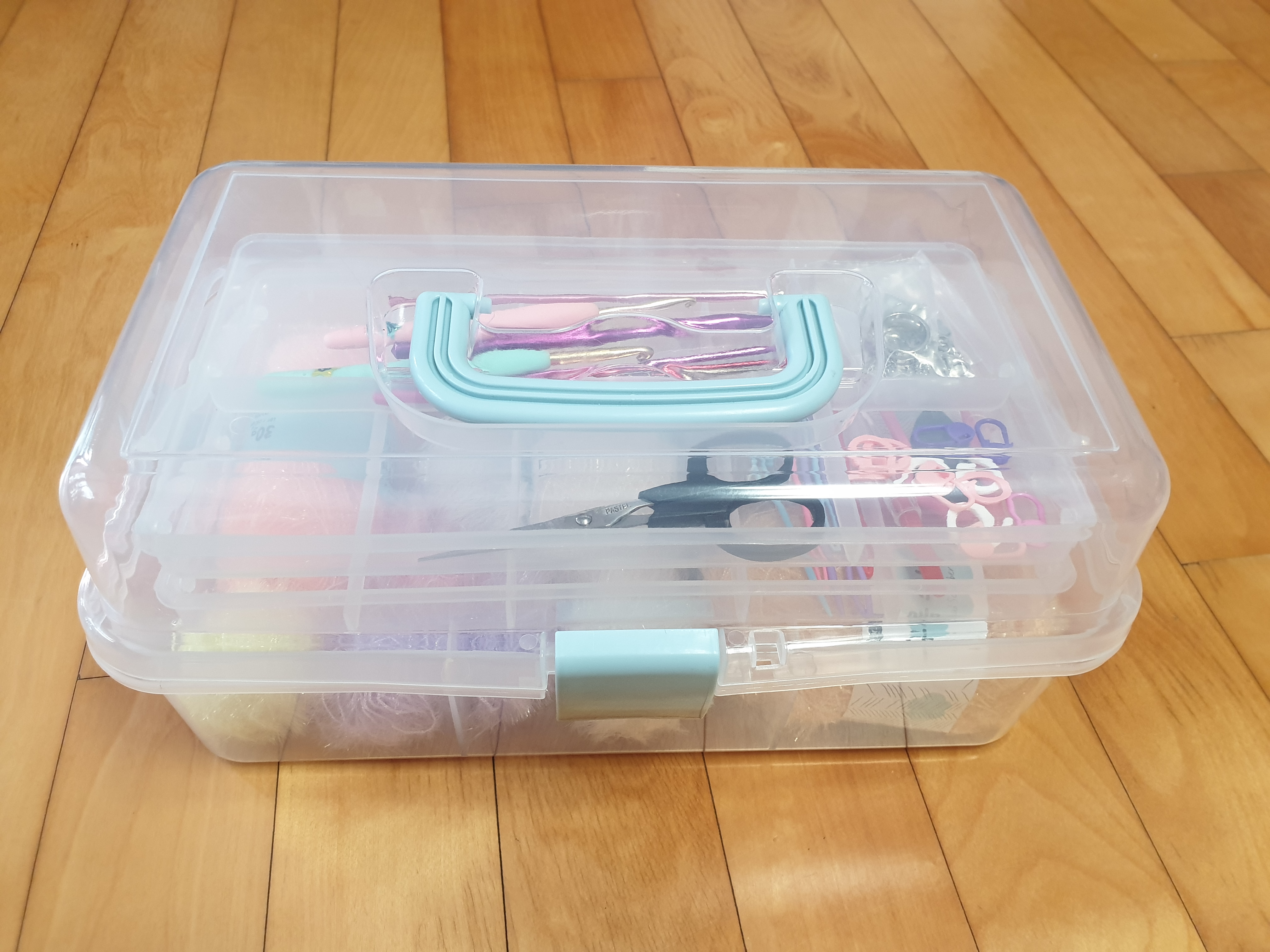 코바늘을 하다보니 도구나 부자재가 점점 늘어났고, 남자친구가 사준 큰 파우치에 담아 다녔지만 파우치는 턱없이 작아졌다. 코바늘 도구와 부자재 정리가 시급했다!!! 그래서 고민을 하고 있었는데 저렴한 가격에 괜찮은 정리함을 샀다. 크기도 꽤 크고 수납도 많이 된다.