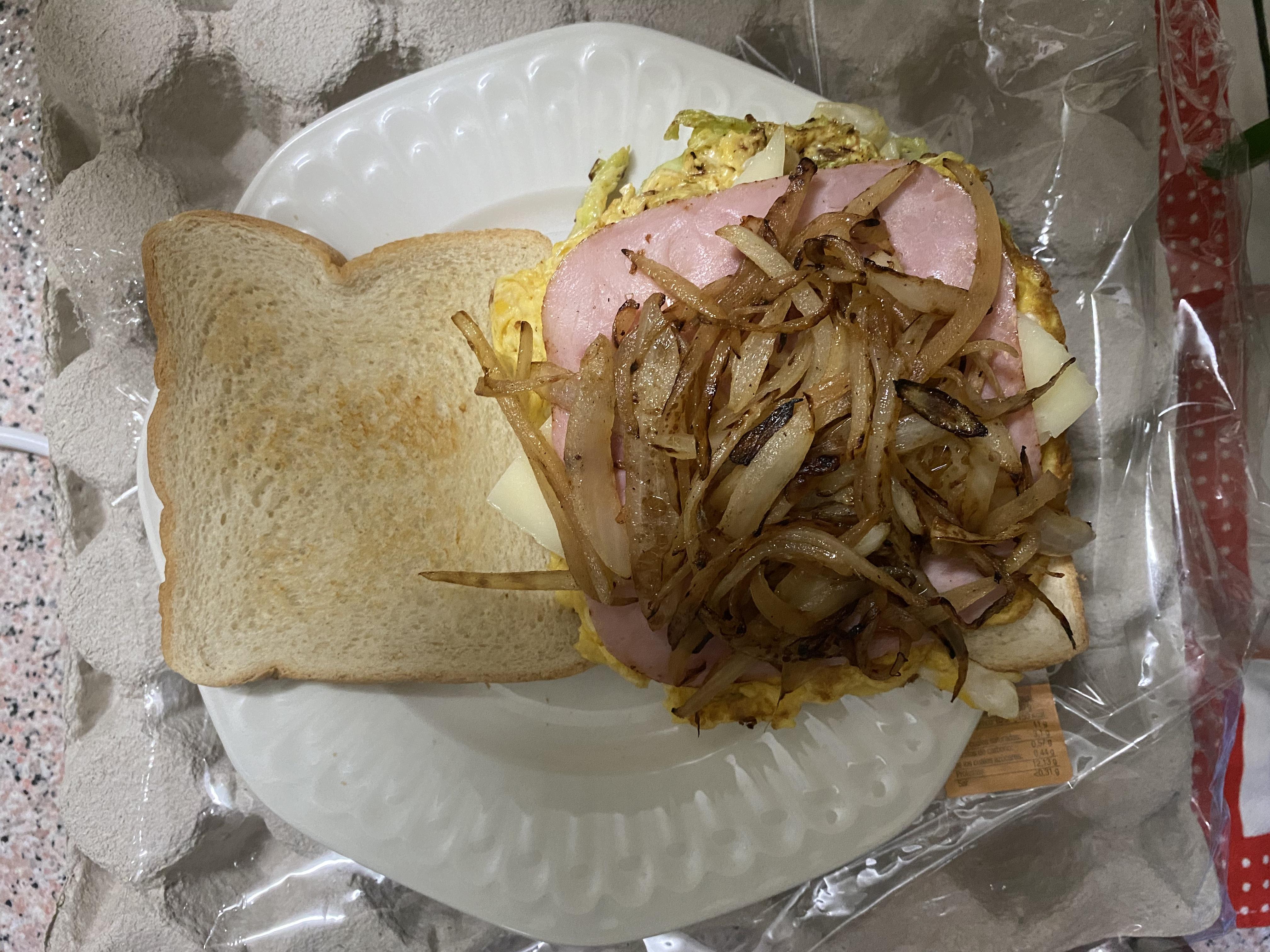 구운 빵위에 계란을 얹고, 치즈를 얹고, 햄까지 얹어서, 그 위에 양파 카라멜라이징?을 얹어줬다.