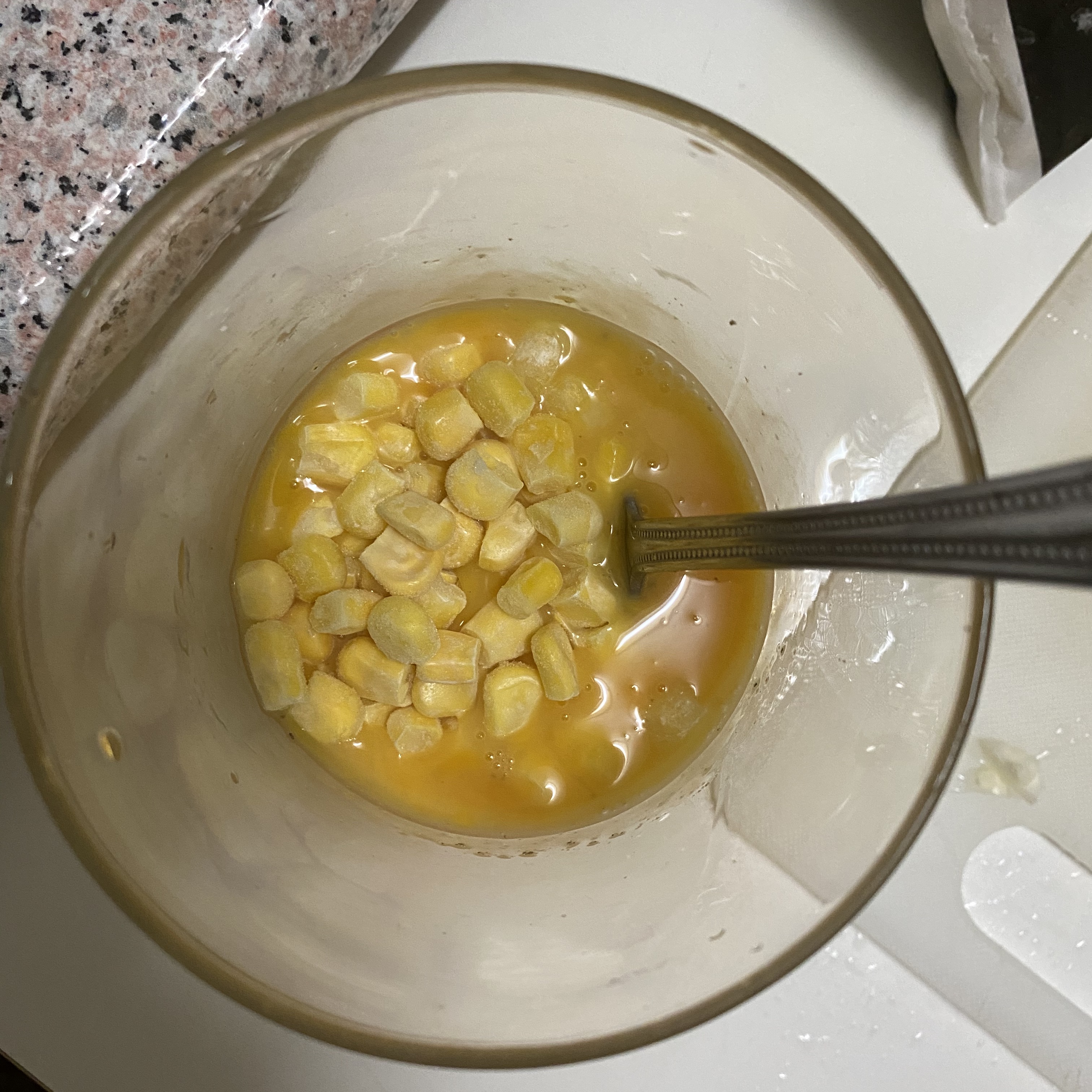 계란 3개는 풀어서 준비했고, 소금과 후추도 넣어줬다. 그리고 나서 옥수수도 넣었다. 옥수수가 씹히면 정말 맛있을거야.