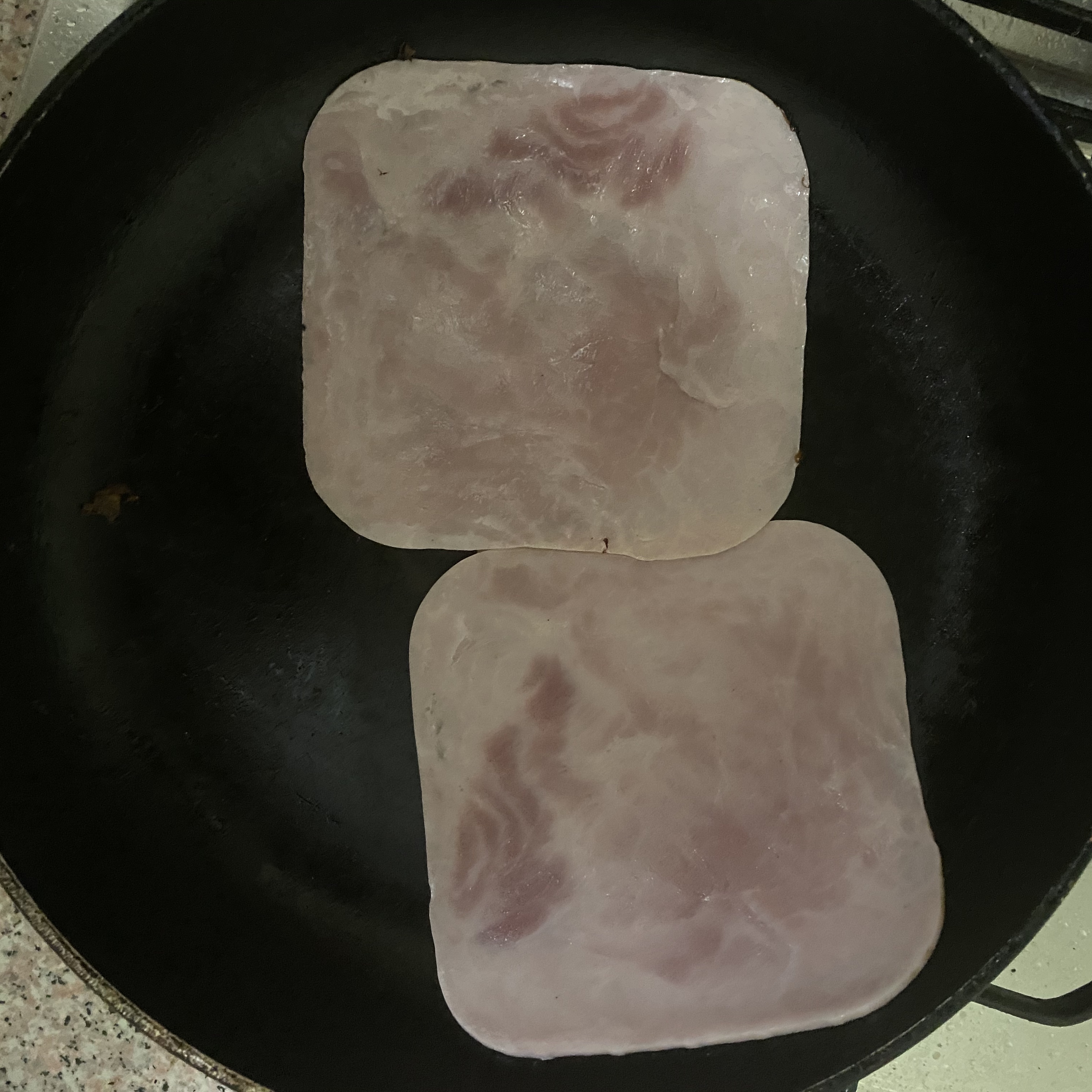그리고, 양배추를 먼저 기름에 볶아주고 나서, 그 위에 계란과 옥수수 섞인 물을 위에 반 정도 부어서 2개를 만들어줬다. (근데 양배추 볶는 사진이 없네ㅜ) 그리고 햄도 후라이팬에 살짝 데워준다.