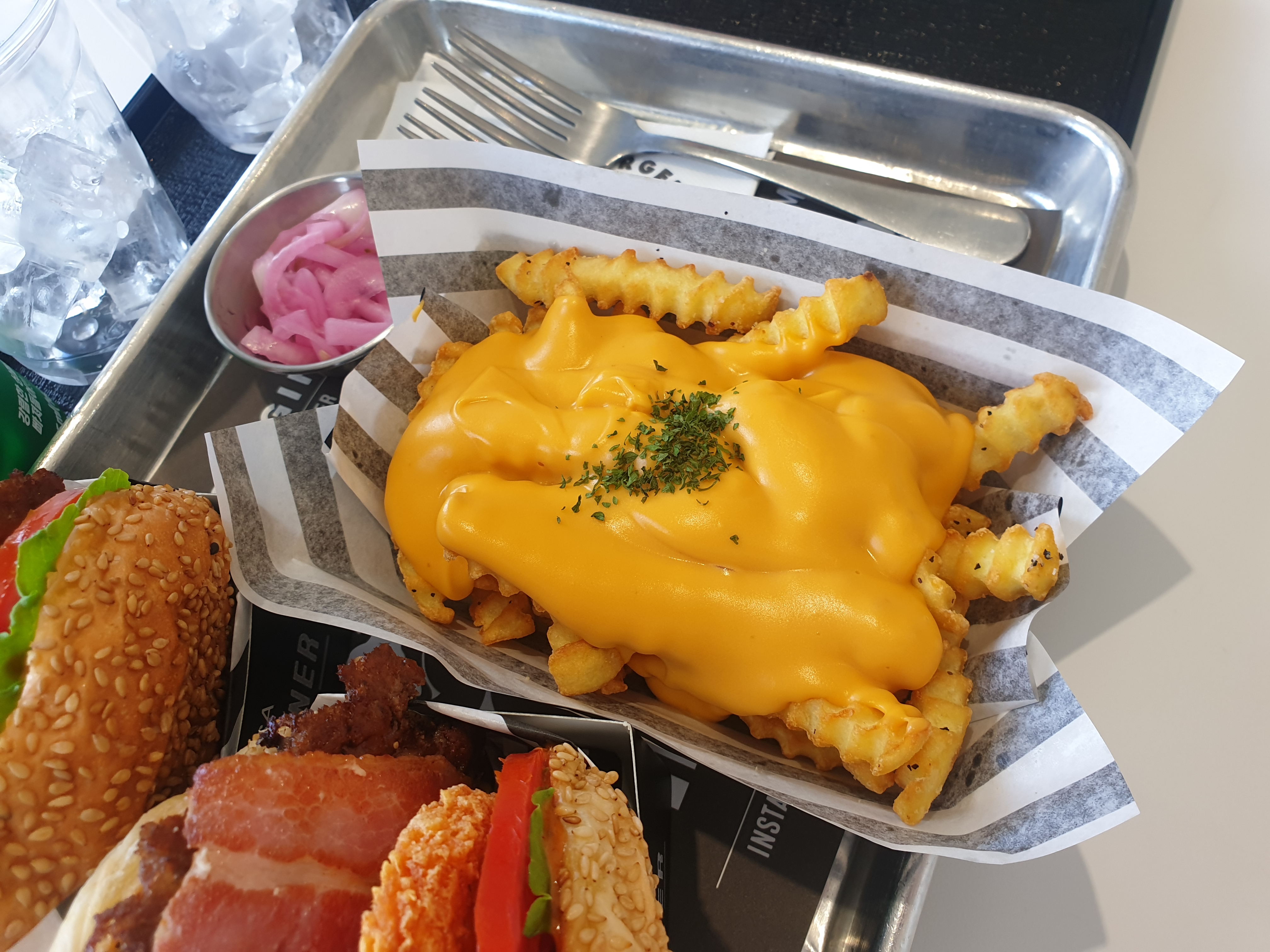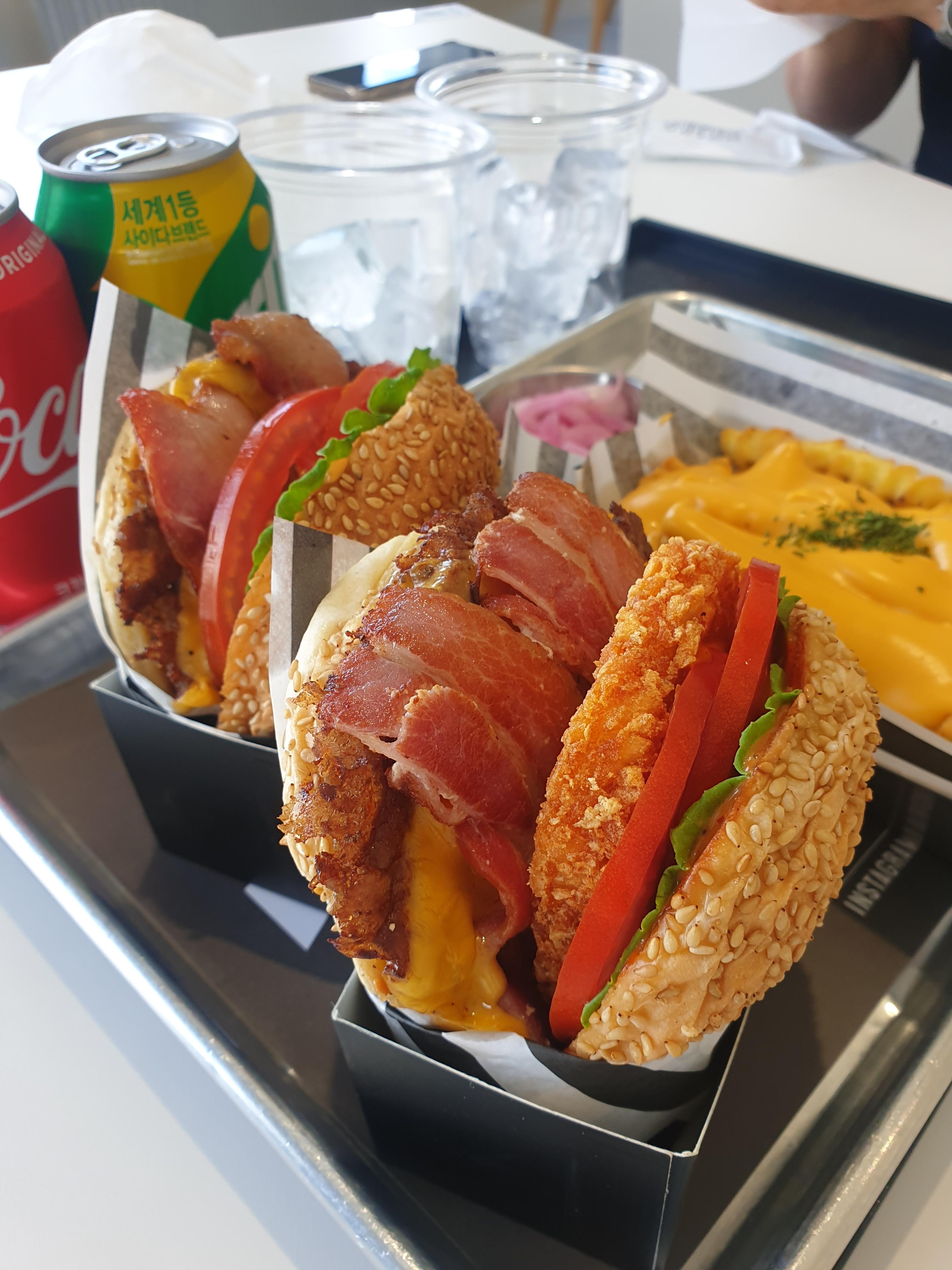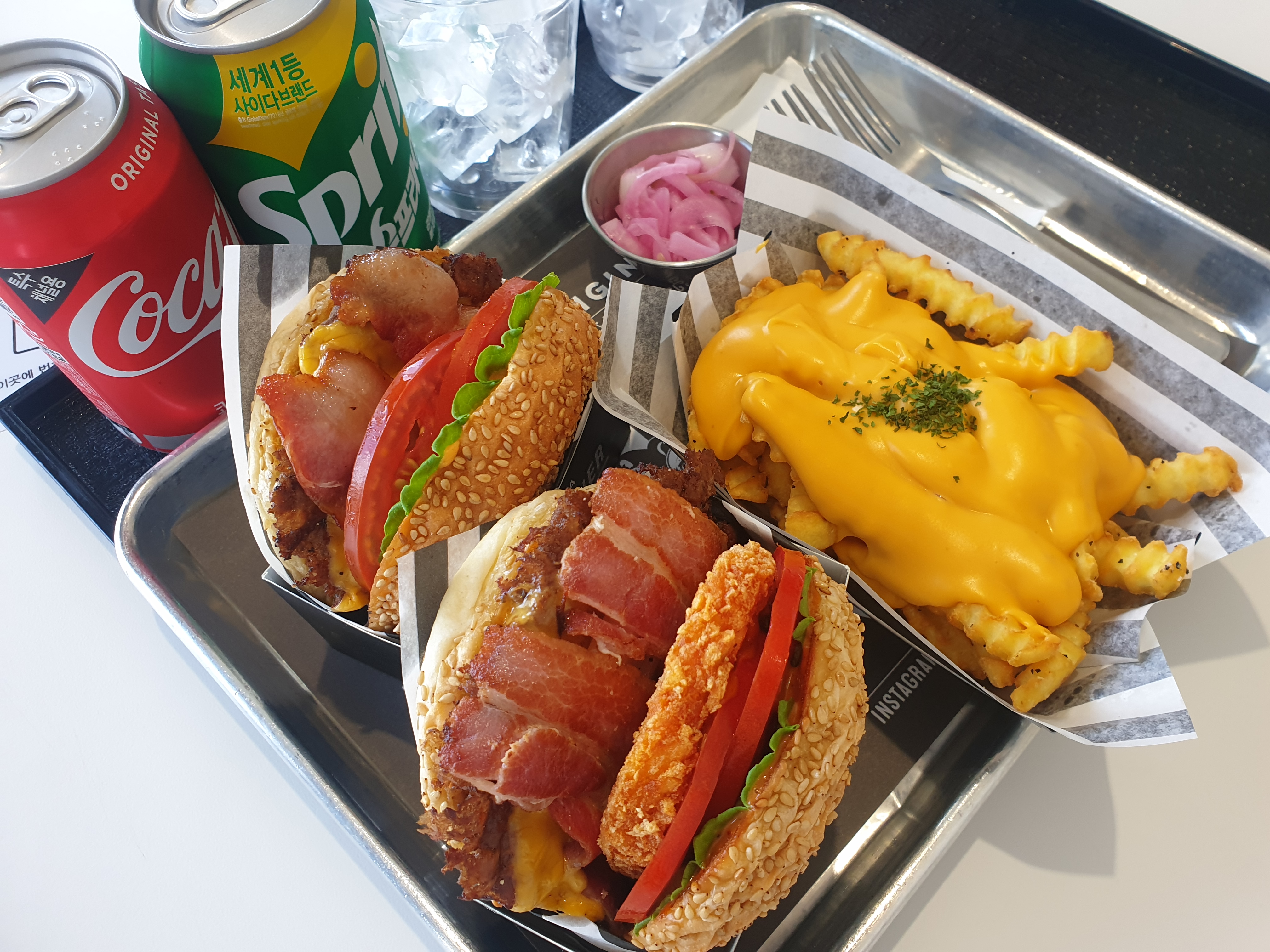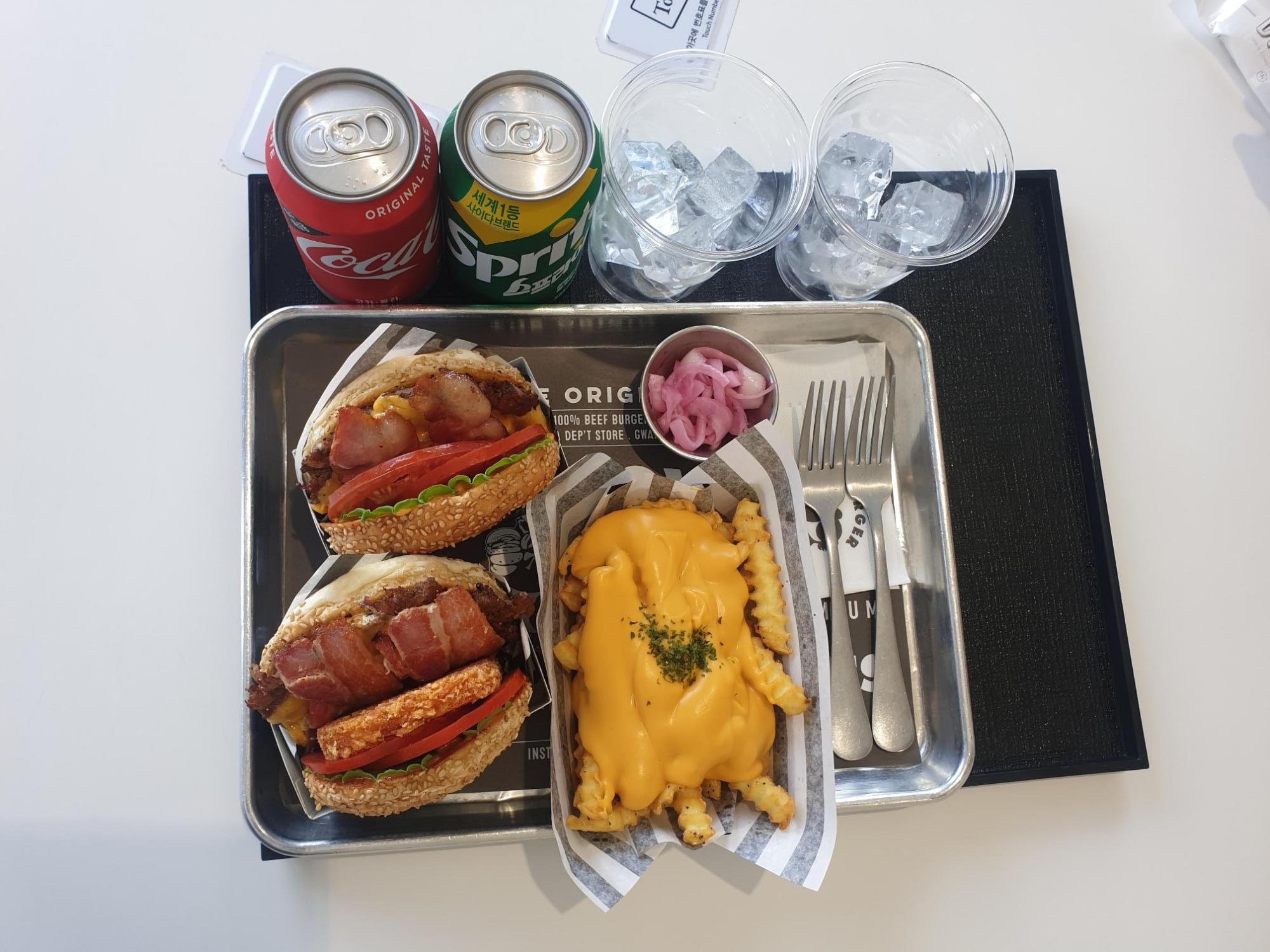 주문한 음식이 나왔다. 버거 두 개와 함께 치즈 감자튀김과 콜라, 사이다를 주문했다. 여기는 피클 대신 절인 양파를 주는데 진짜 맛있다.