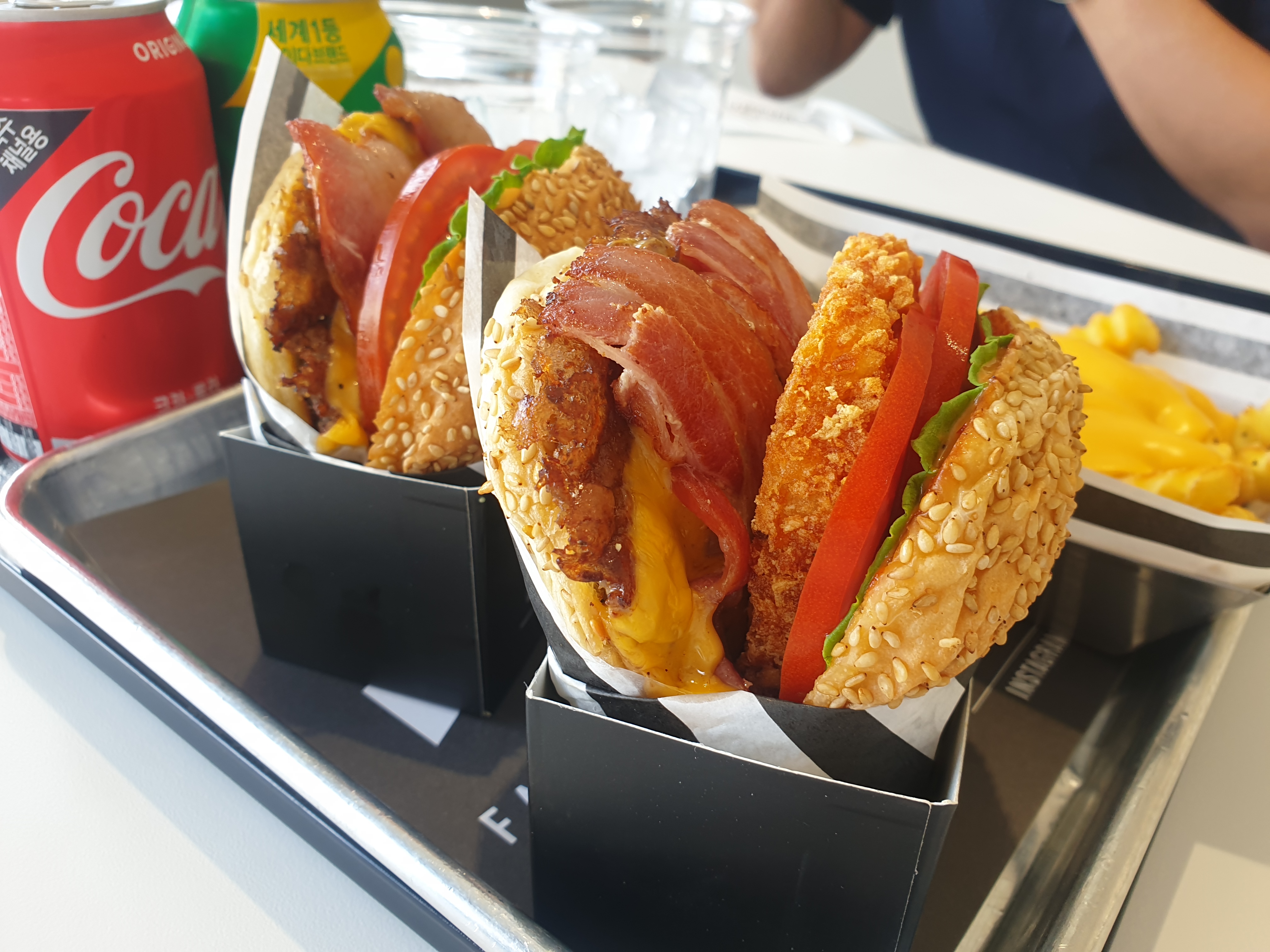 해시브라운 버거와 베이컨 치즈버거이다. 해시브라운 버거는 베이컨치즈버거에 해시브라운이 들어가있다. 베이컨 치즈버거는 토마토와 상추, 양파 식감이 많이 느껴지고, 해시브라운 버거는 가운데 부드러운 해시브라운이 들어가 있어서 고소하고 부드러운 식감이다.