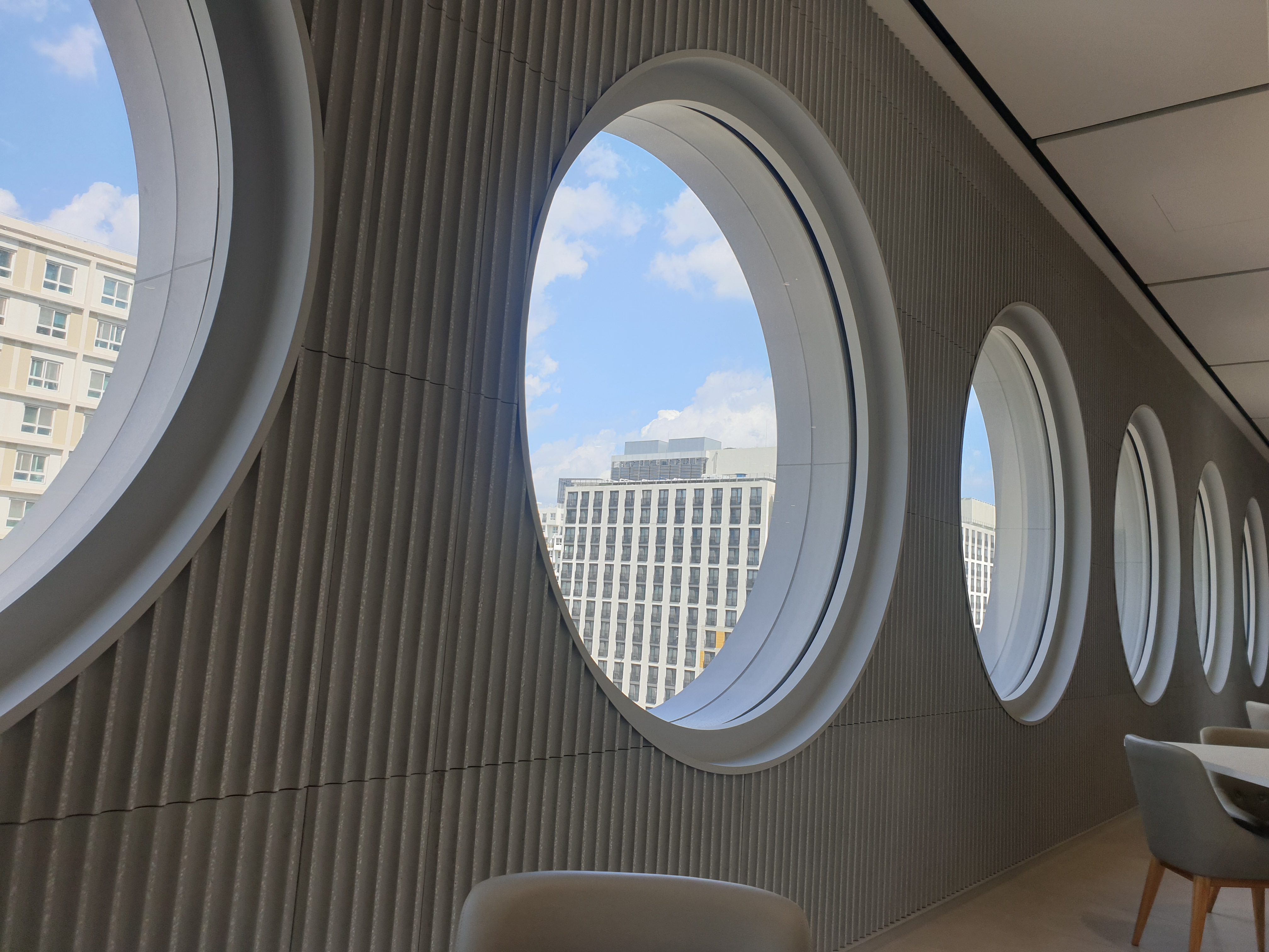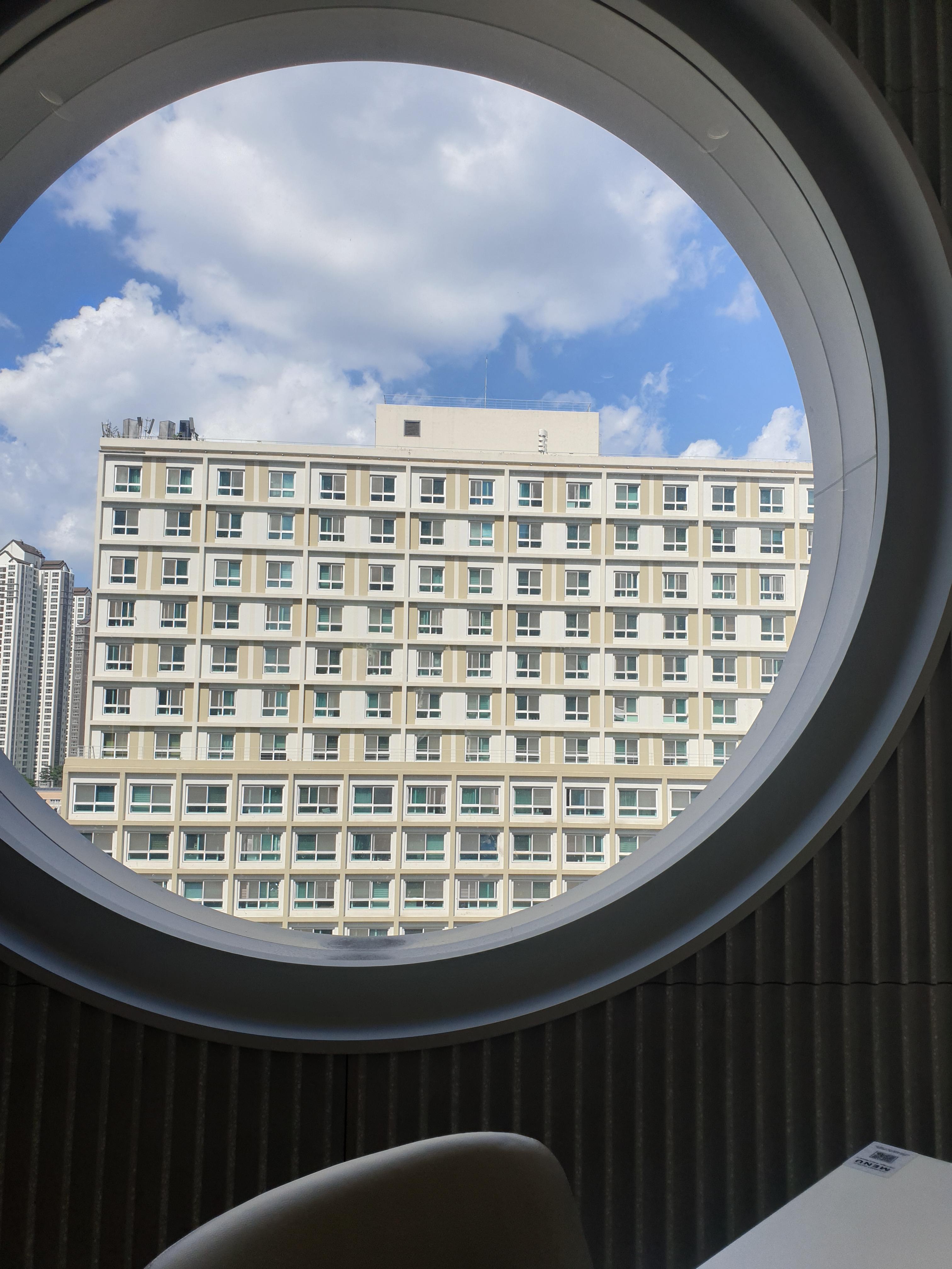 그리고 이 사진은 음식을 먹었던 자리에서 본 바깥 풍경이다. 와 하늘도 너무 예쁘고 동그란 창문이 특이하고 예뻤다. 뭔가 비행기를 탄 느낌도 있고 히히 넘 예쁘다. 하늘도 파랗고 구름도 뭉게뭉게 이쁘다.