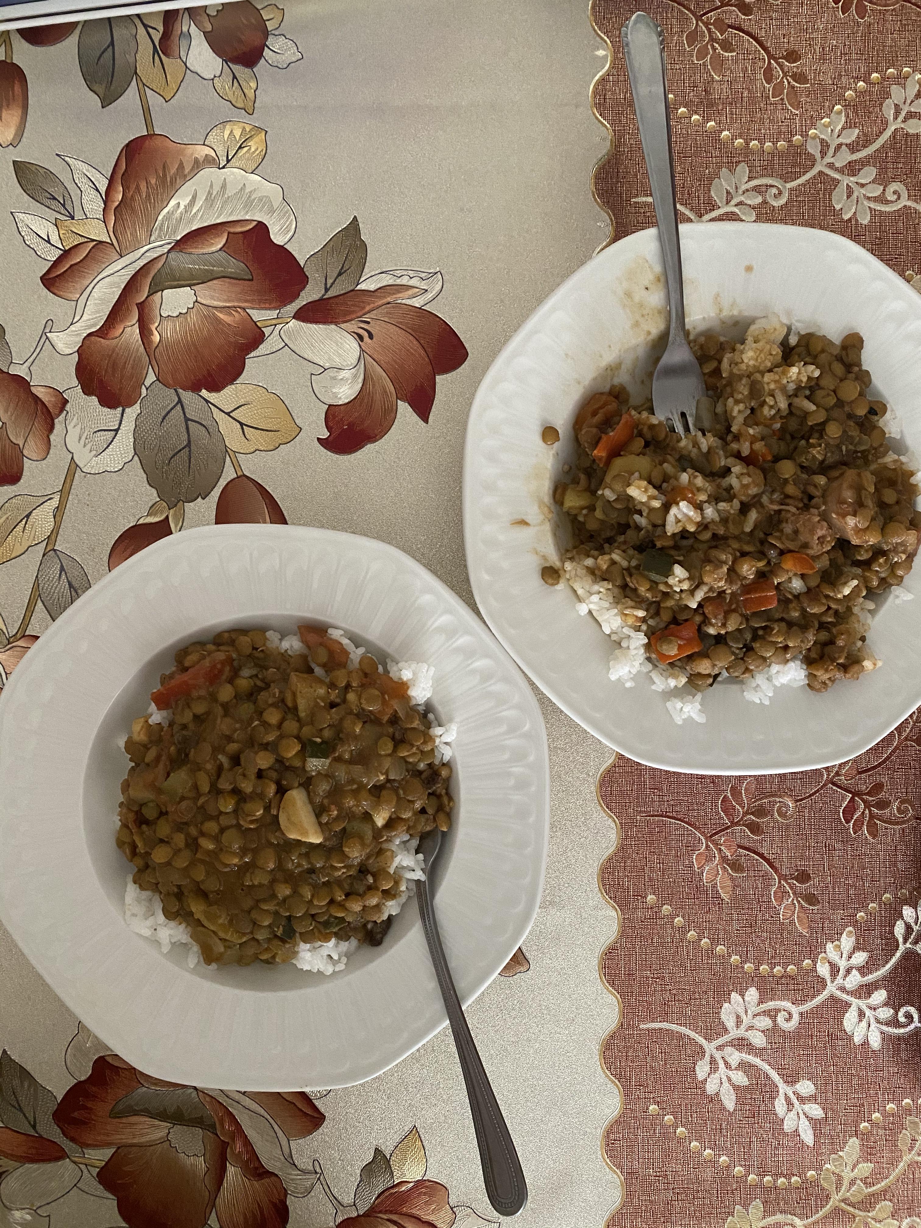 점심은 또 어제 먹었던 렌틸콩 음식이다. 국 종류의 음식들이 다 그런가, 하루 지나면 약간 맛이 더 진해지고, 맛있어진다. 하지만, 어제보다는 확실히 소시지들이 많이 줄었다. 어제 다 먹었나? 사진에 콩밖에 보이지 않는다 ㅎㅎ 그래도 맛있게 먹었다.