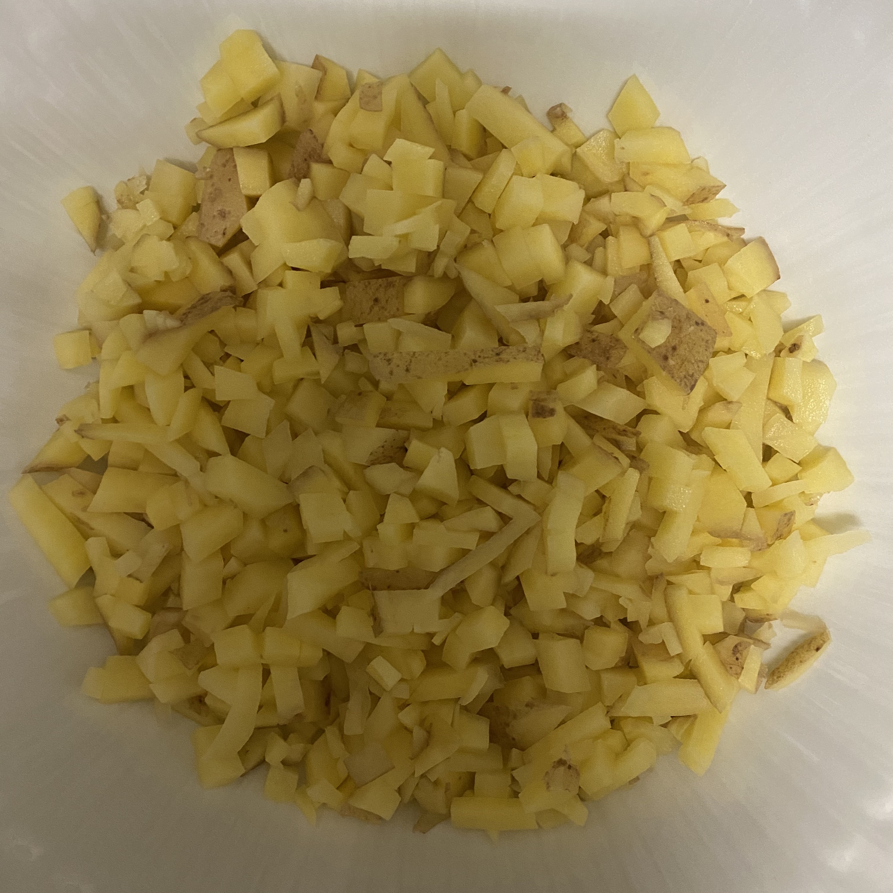 그러면 감자를 2개 준비하고 다 잘게 잘라준다. 껍질을 벗기면 너무 좋겠지만, 나는 귀찮아서 항상 잘 씻어서 껍질까지 먹는다. 양파도 잘라준다. 자잘자잘하게 잘라준다.