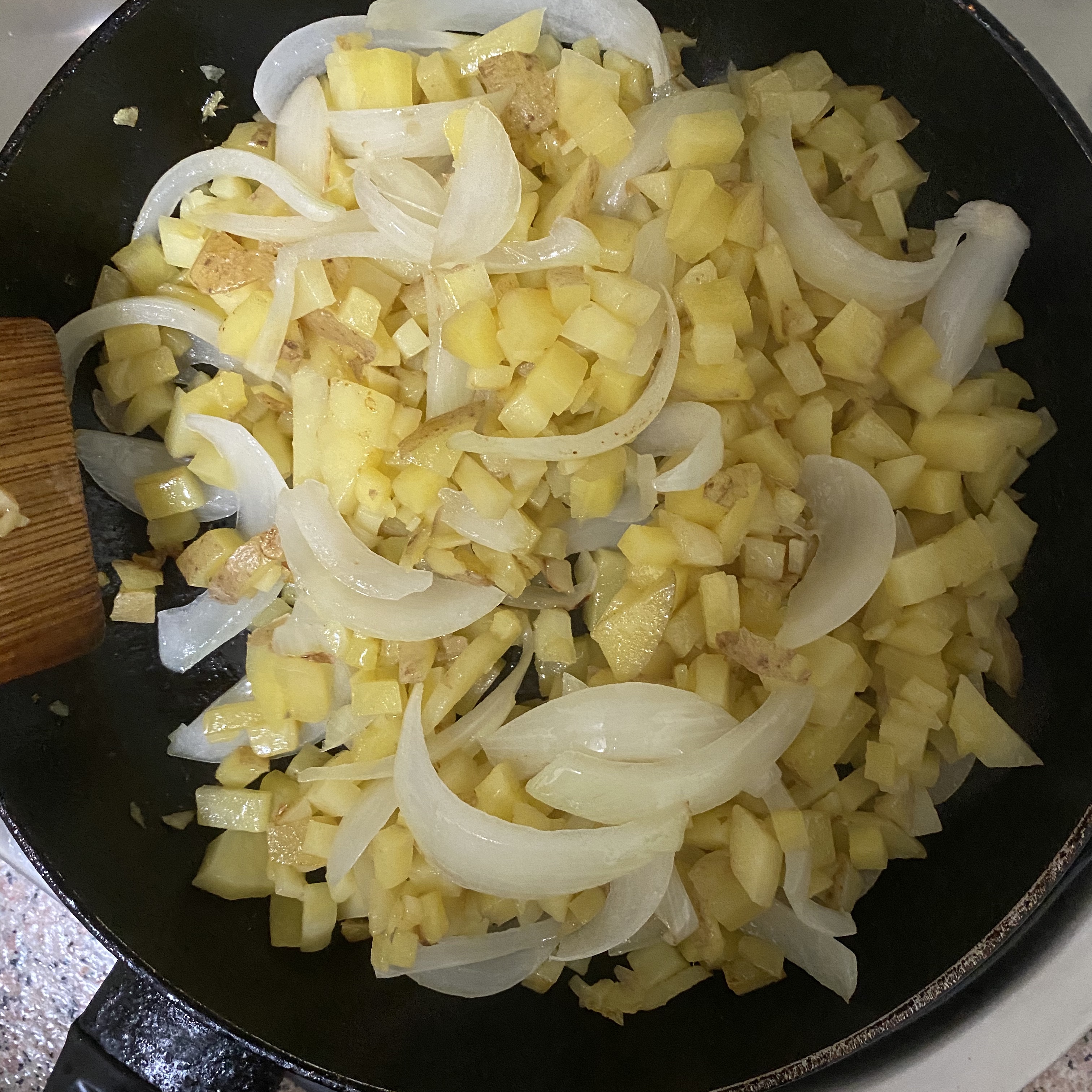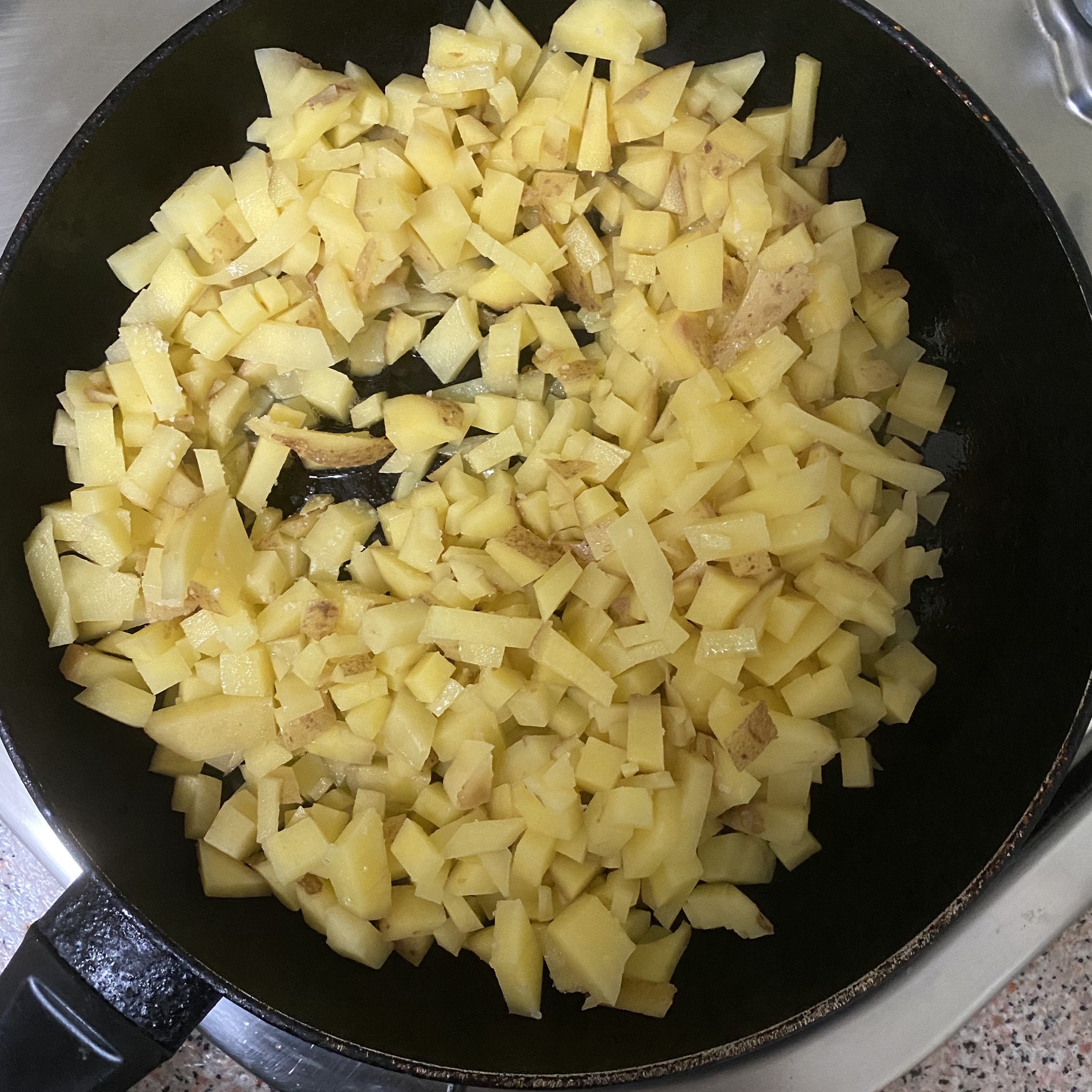 그러면, 후라이팬에 기름을 충분히 두루고 감자를 넣고 볶아준다. 어느 정도 볶아 준다음에 양파를 넣는다.
