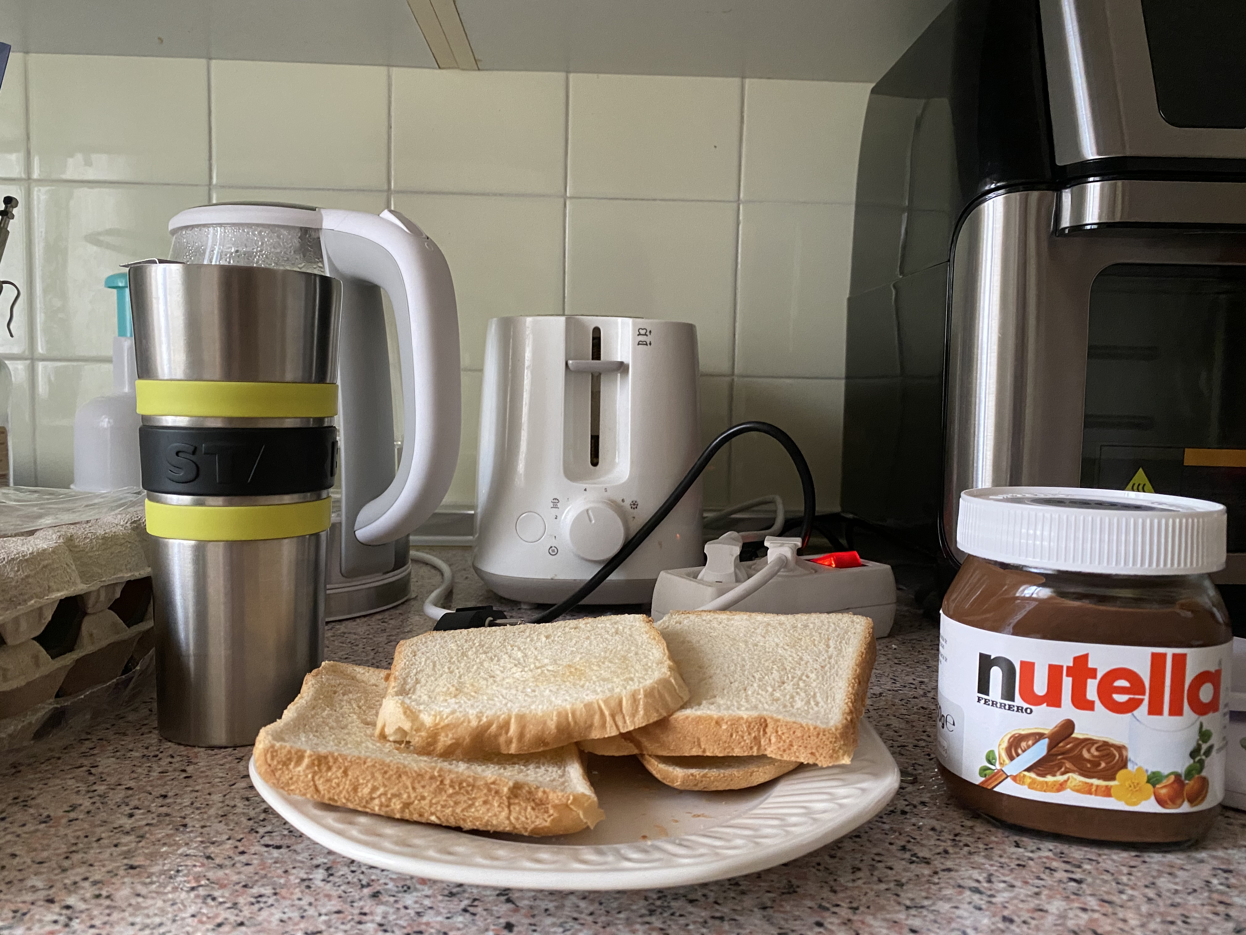 빵도 토스트해서 누텔라를 꺼내서 아침으로 먹기로 했다. 바나나도 먹을까 했는데, 아직 너무 초록색이어서 꺼내지 않았다. 그리고 남자친구는 커피가 안 받으니 화이트 티를 마셨다. 저거 너무 맛있어. 스페인에 오시면 꼭 드셔보세요. 개인적으로 블랙티보다 더 맛있는 것 같다.