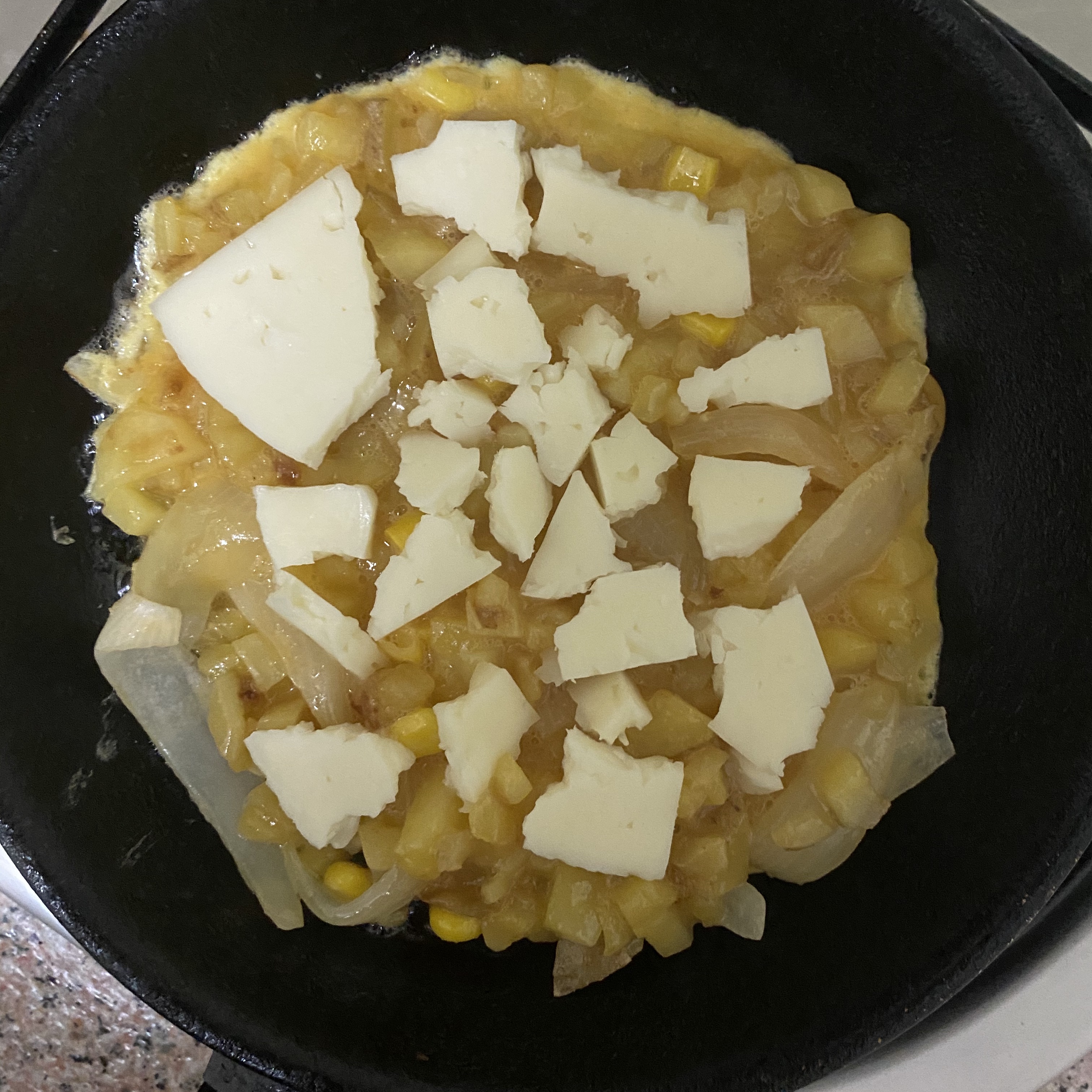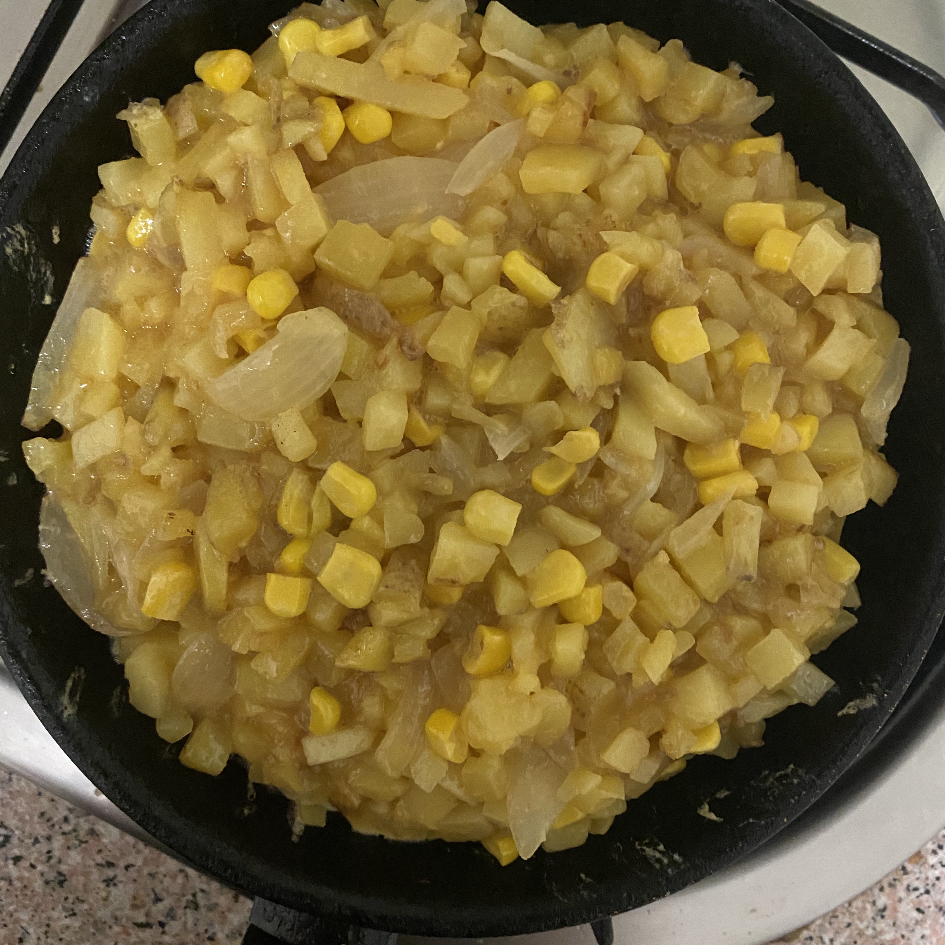 스페인식 오믈렛에는 사실 옥수수가 들어가지 않는데, 원래 감자, 계란에는 옥수수 들어가면 너무 맛있다 헤헷 그래서 조금 넣어줬다. 충분히 잘 섞어준 다음에, 아까 후라이팬에 있던 감자와 양파 익은 걸 여기에 넣어서 잘 섞어준다.