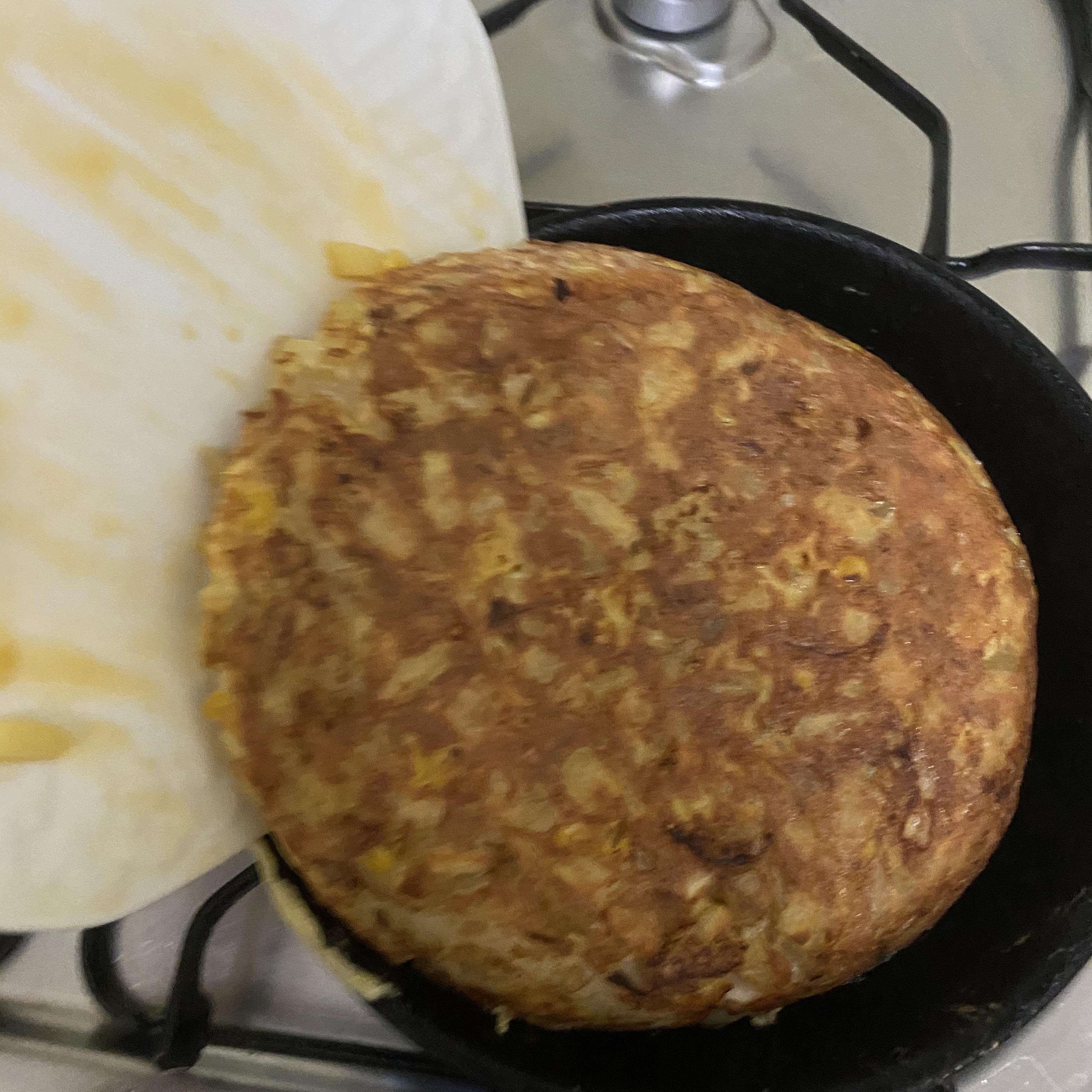 오분이 지나면 뒤집어야 하는데, 어떻게 하지?라고 생각한다면! 후라이팬에 맞는 그릇을 하나 가져와서, 얘를 덮는다. 그리고 재빠르게 사진에서처럼 뒤집어준다.