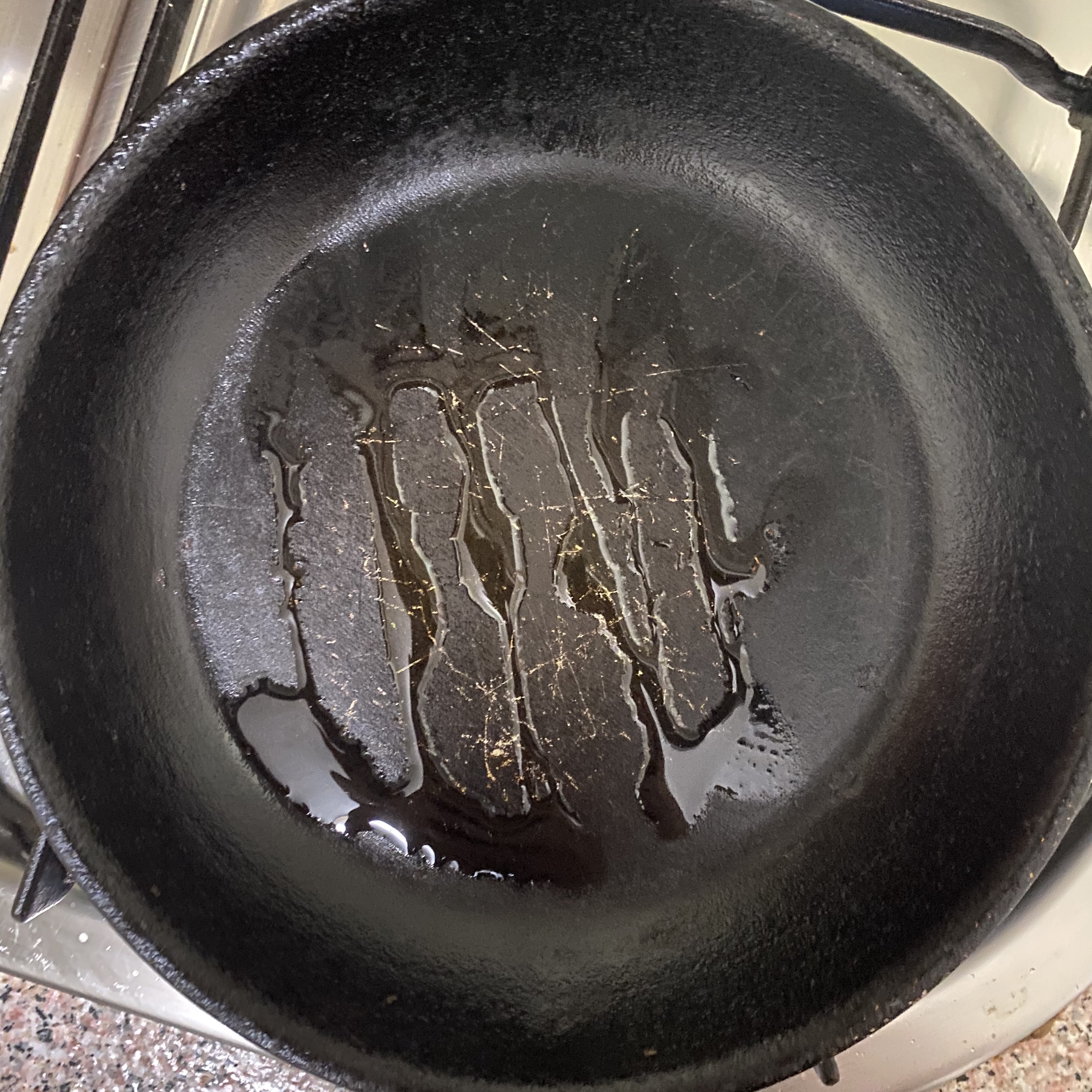 그리고! 마지막 단계, 아까 사용했던 후라이팬보다는 조금 작은 팬을 꺼내서 기름을 약간 둘러준다. 그리고, 볼에 있던 양의 1/3 정도만 후라이팬에 담아준다.