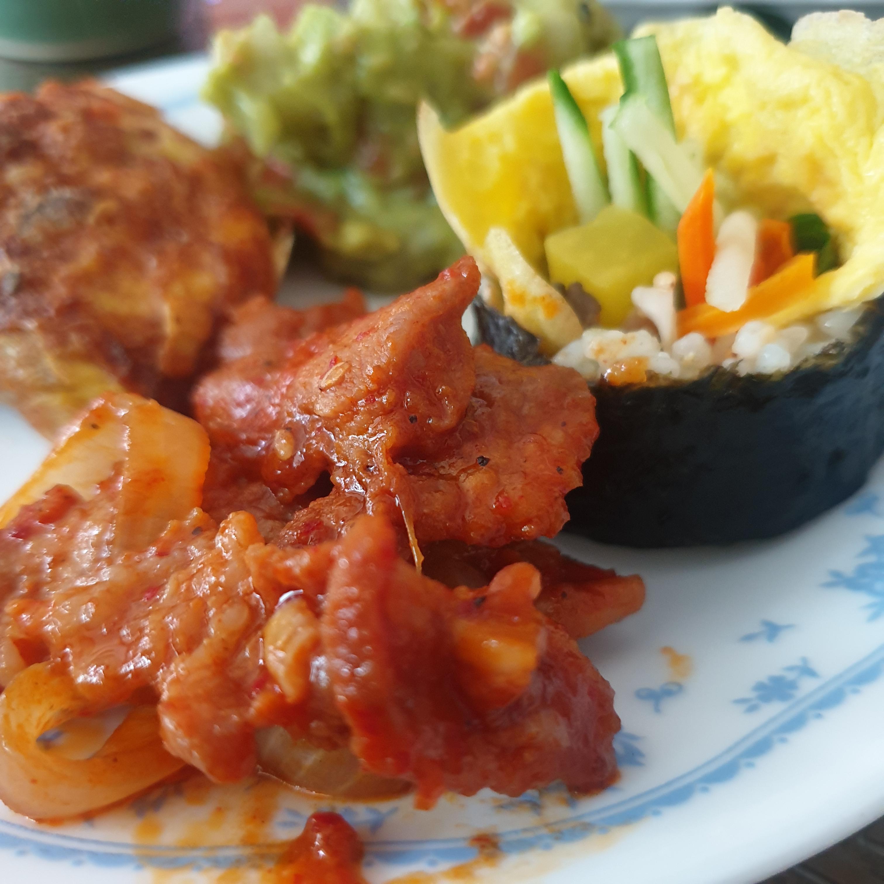 음식은 모두 한 가운데 두고 나눔 접시에 과카몰리, 오믈렛, 김밥, 제육볶음을 담았다. 뭔가 뷔페 같기도 하다.