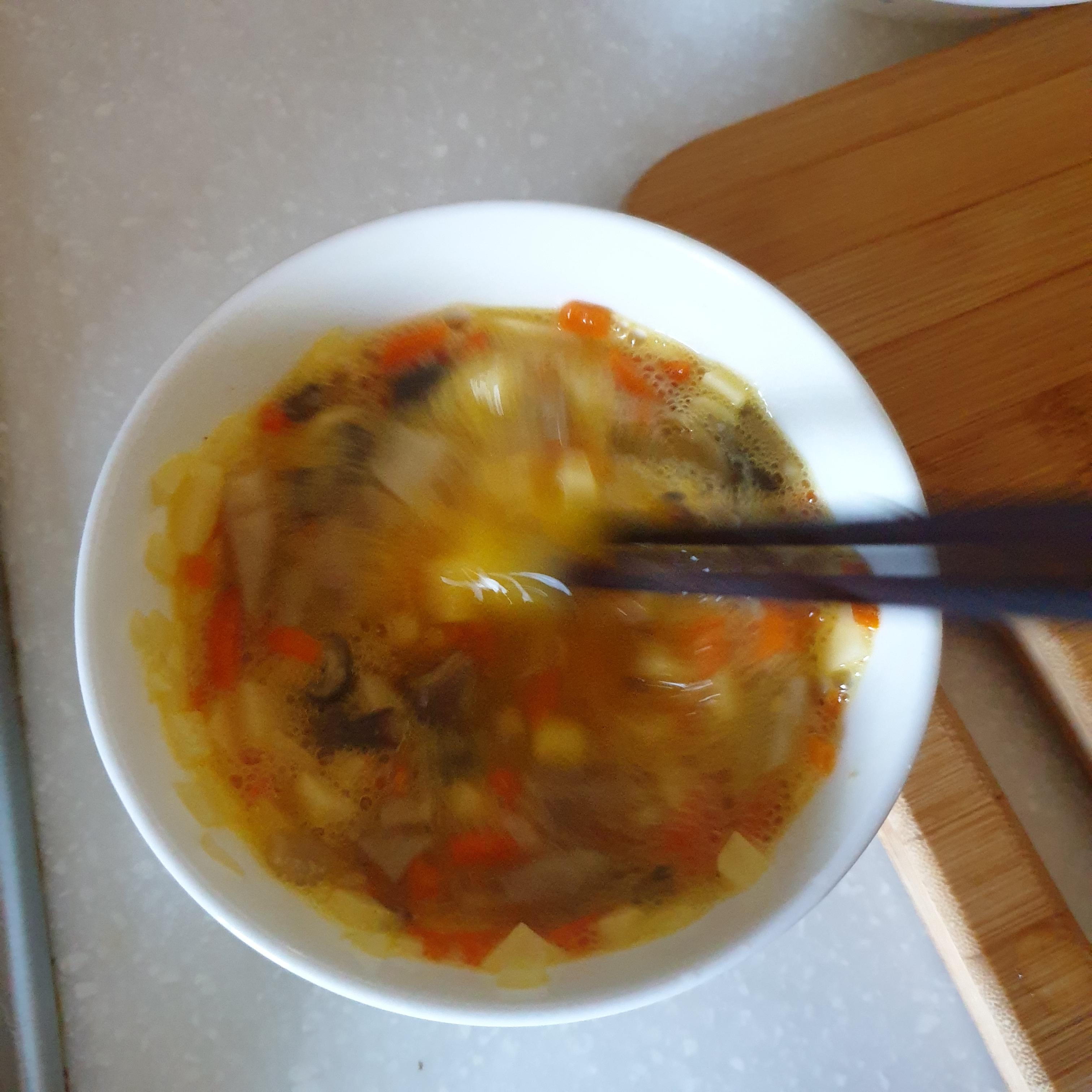 먼저 달걀 2개, 감자, 당근, 버섯을 잘게 썰어 넣고 저어주었다. 아침밥이니까 탄수화물이 든 감자를 하나 다 넣었다. 대신 금방 익도록 아주 얇게 썰었다.
