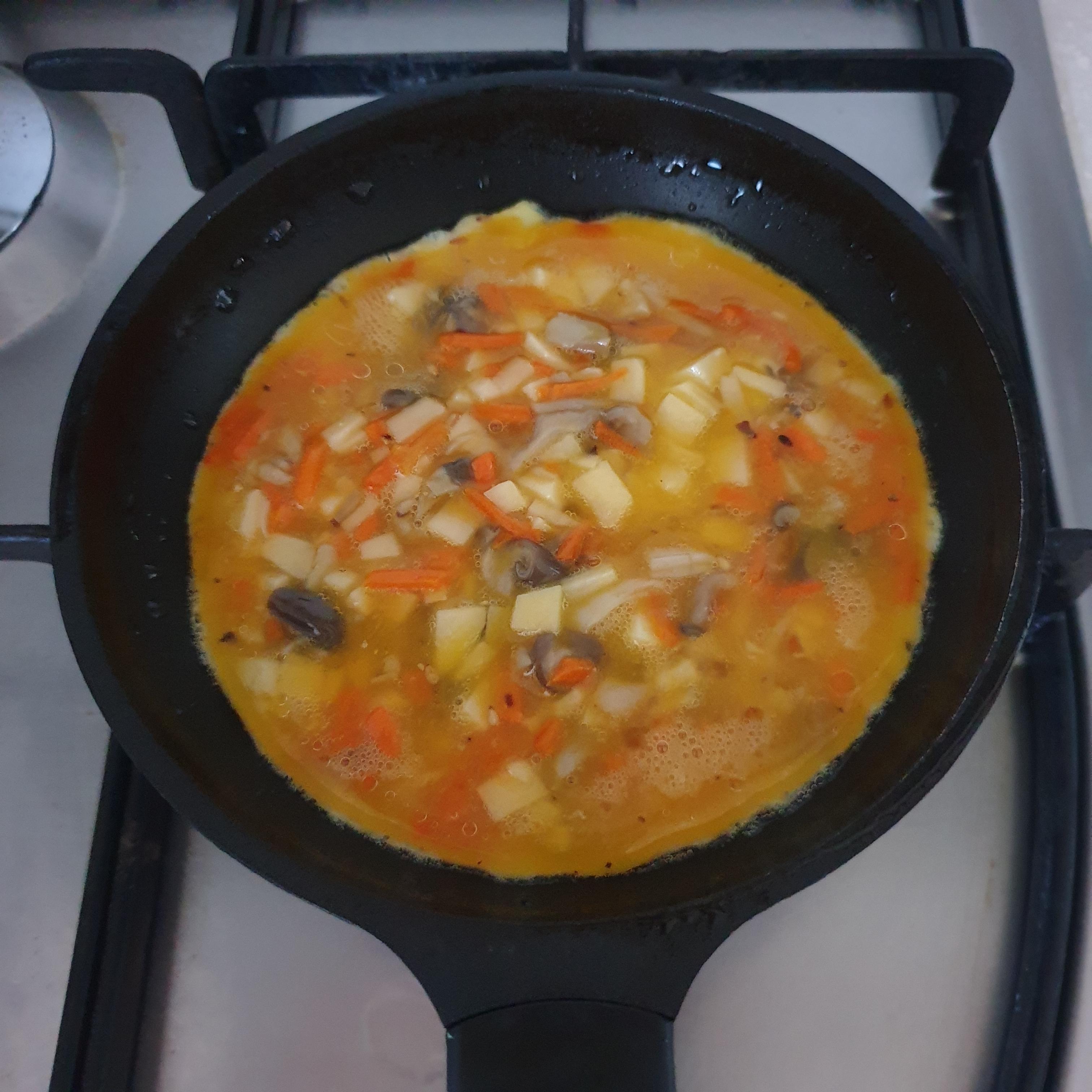 재료 : 계란 2개, 다진 당근, 다진 버섯, 다진 감자, 소금, 후추, 치즈 2장