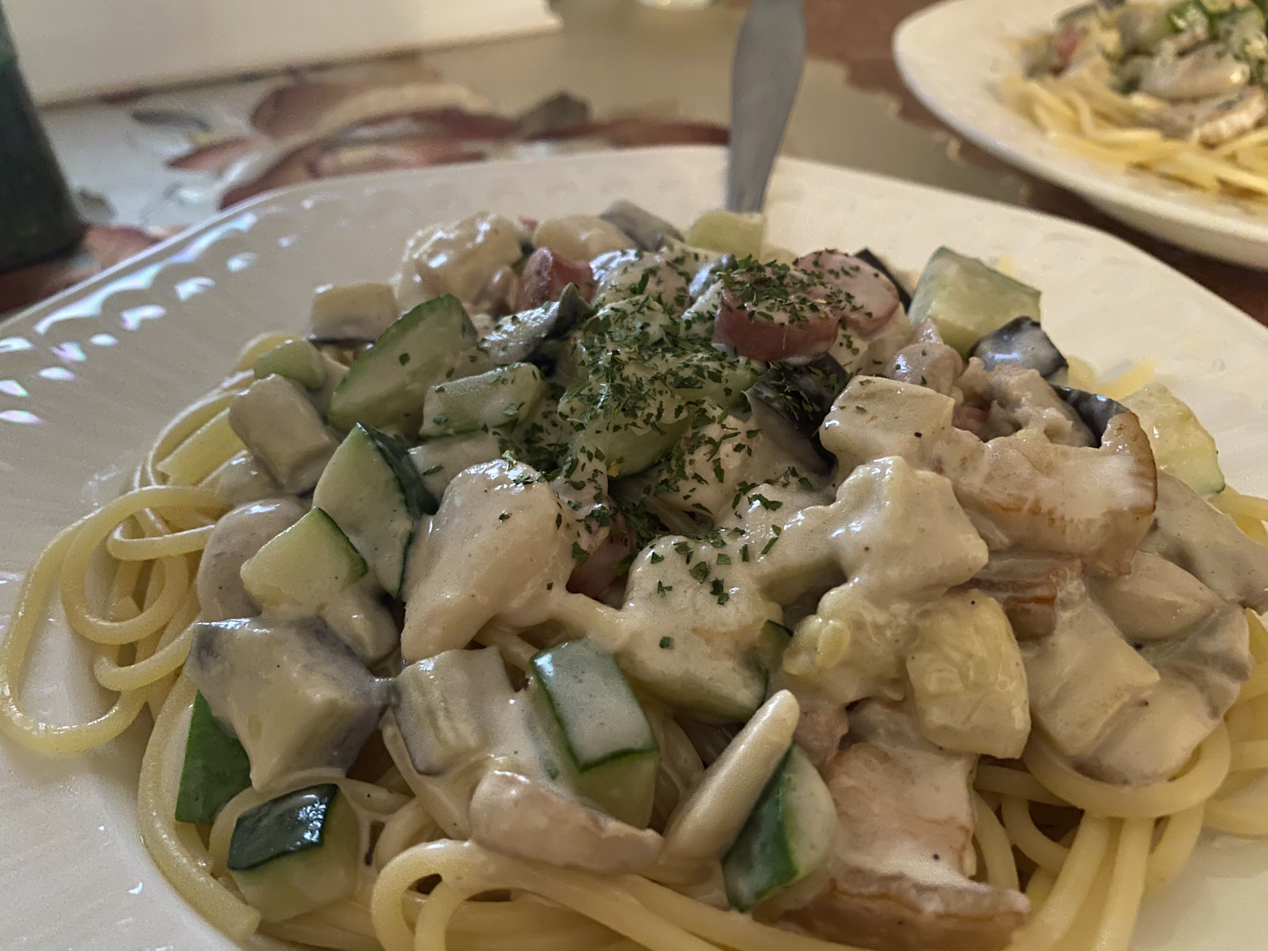 점심은 남자친구가 만들어 주었는데, 크림 파스타이다. 크림 파스타인데, 문제는 양파가 없다... 그냥 일단 양파 없이 있는대로 했다. 카르보나라인데, 야채 크림 파스타가 되었다.