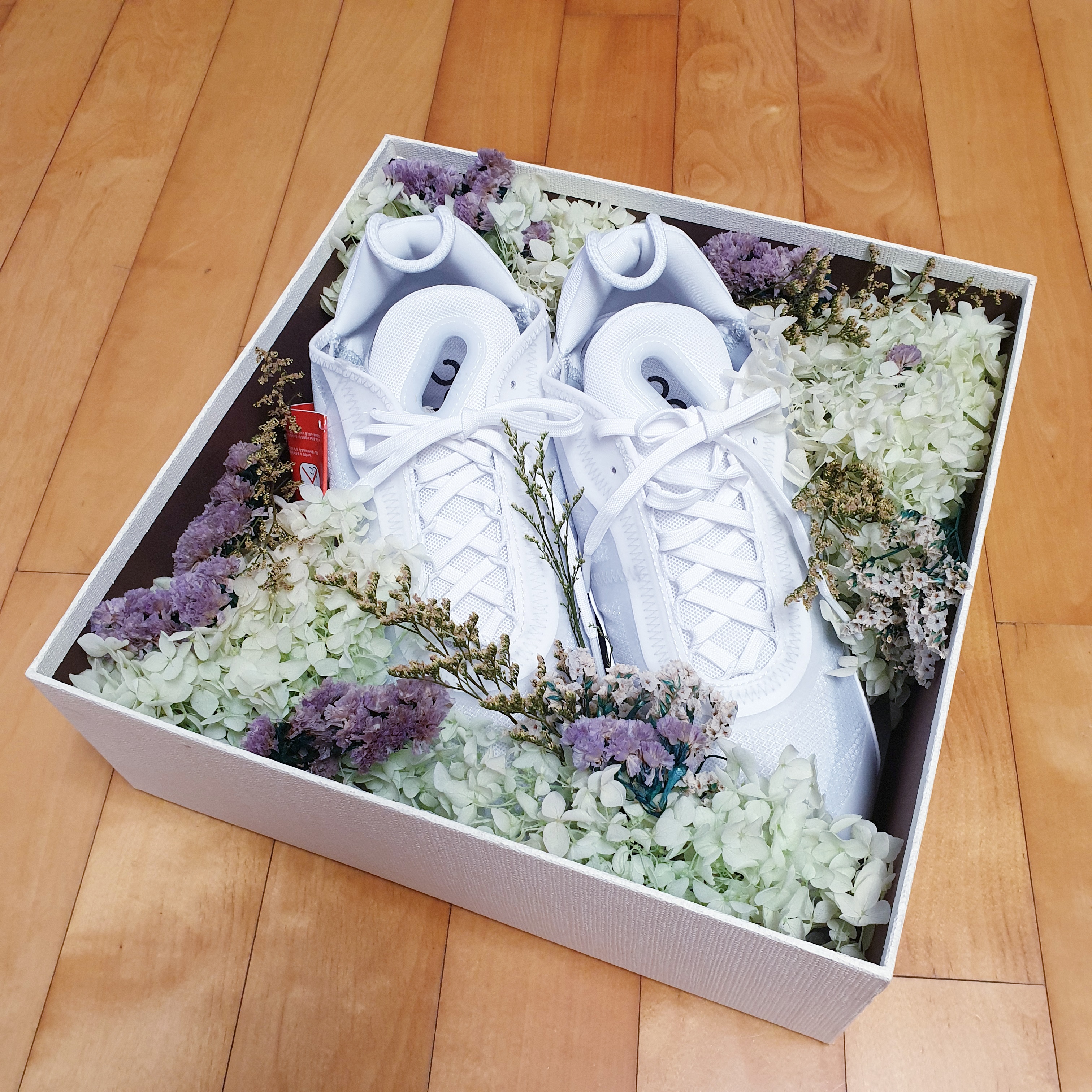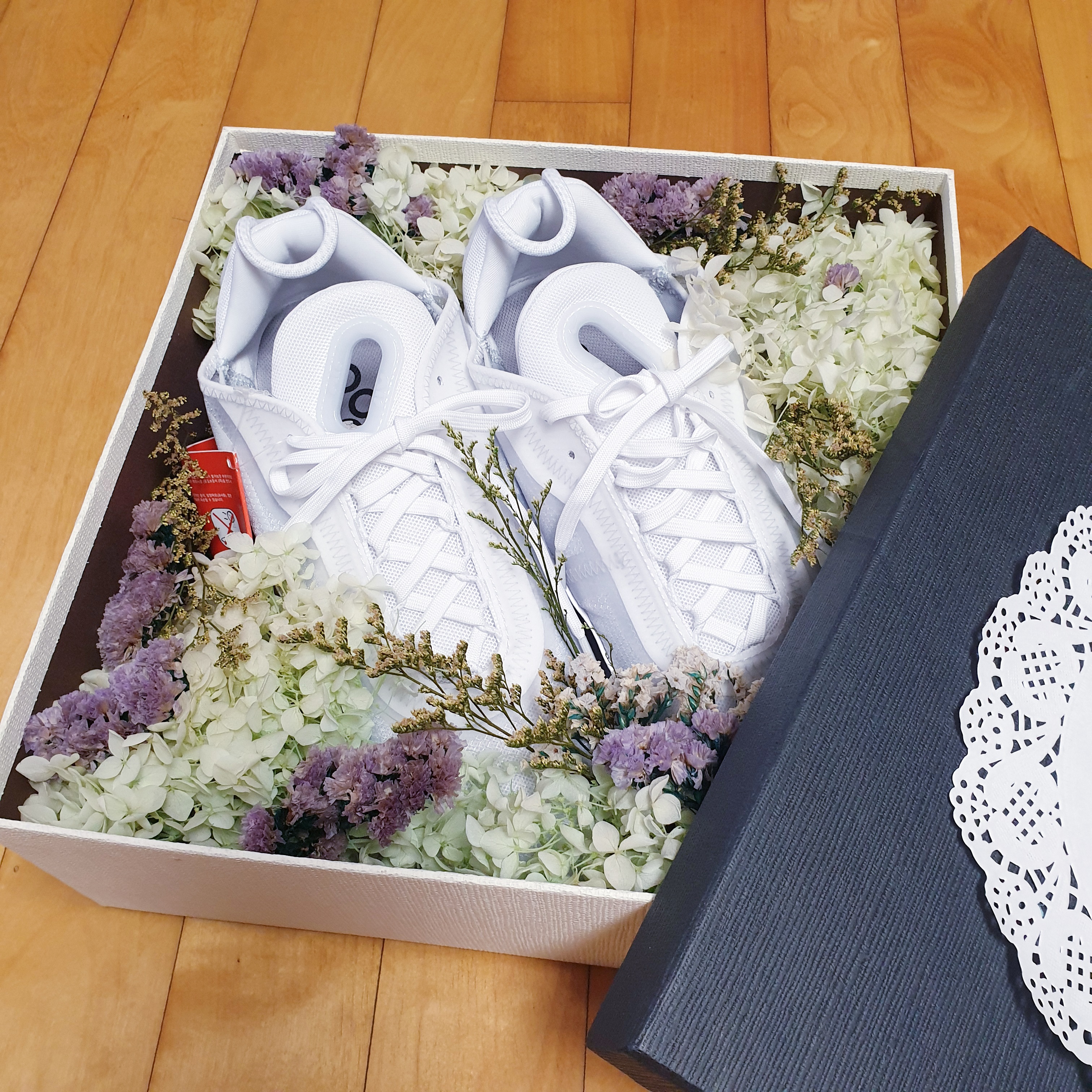 꽃신박스를 준비할 때 프리저브드 꽃 중에 이염이 발생하는 꽃들이 있어 조심해야 한다. 꽃대가 아주 초록색이거나 염색이 되어있는 것 같은 꽃들은 신발에 염색이 묻을 수 있다. 그래서 나는 원래 신발에 포장되어있던 흰색 종이를 신발에 싸서 박스에 담았다. 사진으로는 잘 보이지 않지만 흰색 종이를 싸서 신발을 넣었기 때문에 꽃이랑 신발이 직접 닿지 않는다.