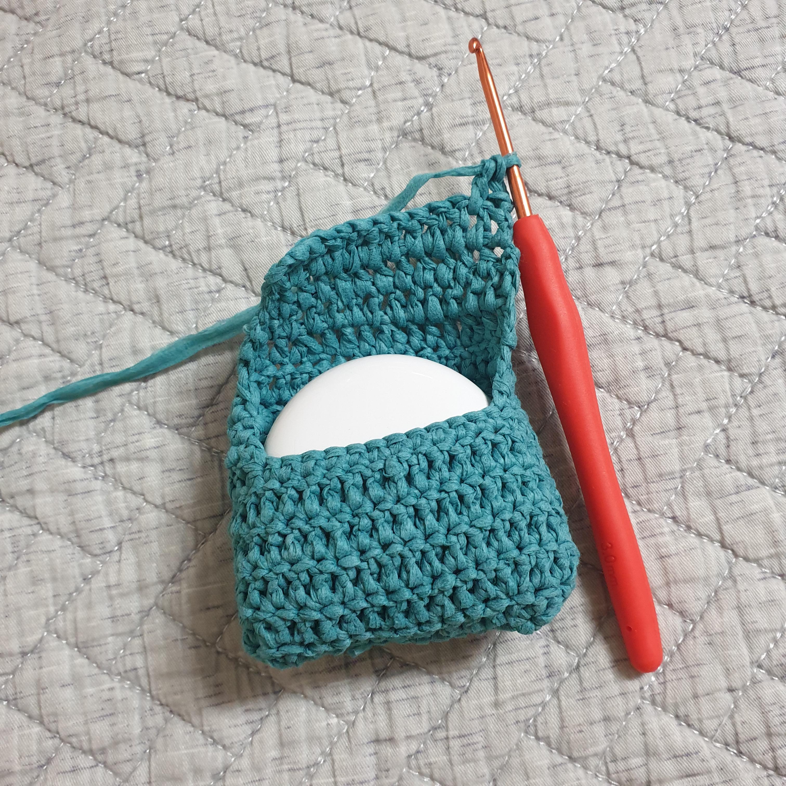 그리고 주머니 앞 쪽은 짧은 뜨기를 하고 긴뜨기로 옆을 만들고 한길길뜨기로 뒤를 만들어 높이를 조절한다. 이렇게 하면 앞쪽은 완성이다.