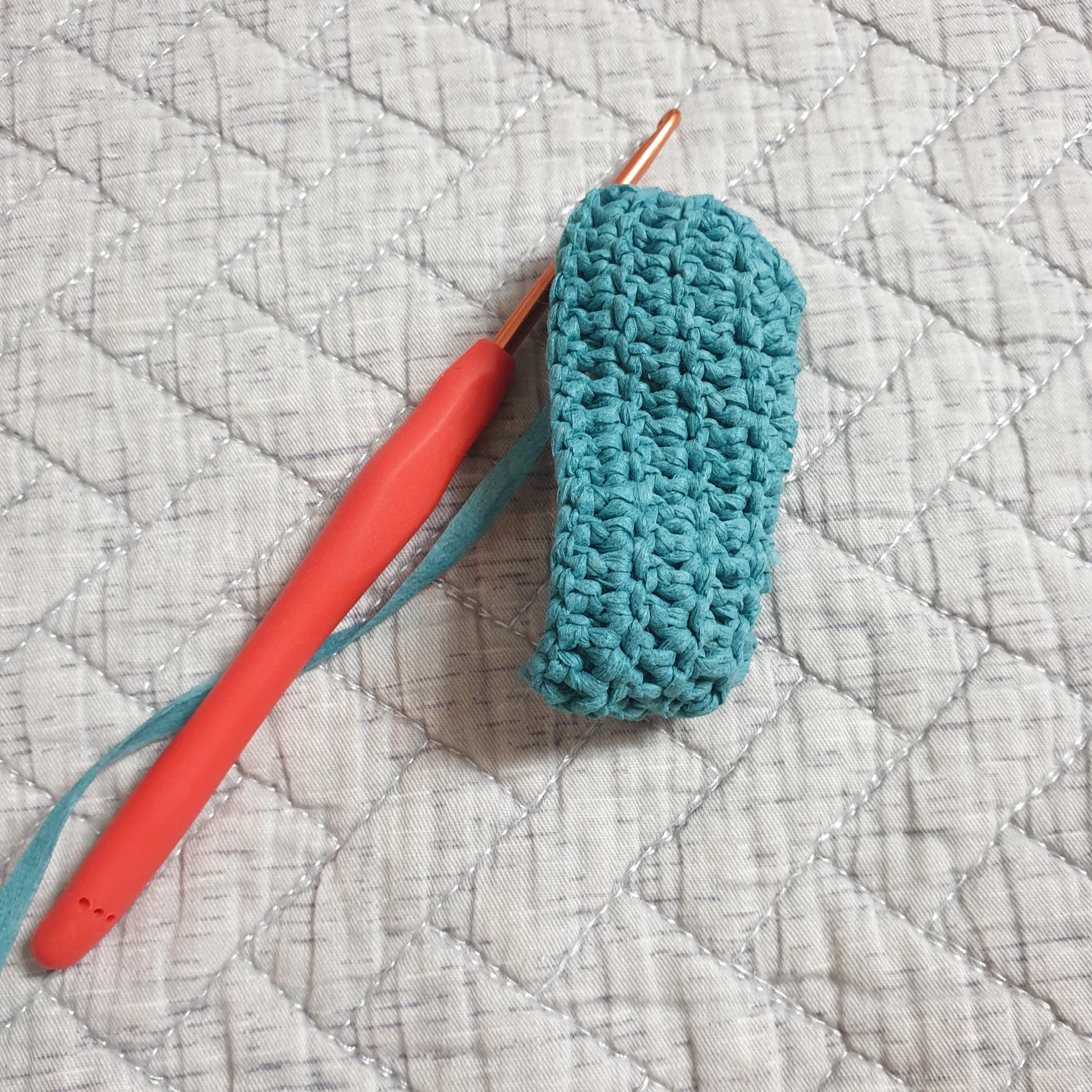 먼저 사슬을 케이스 길이에 맞춰 만들었다. 이 사슬이 바닥이 된다. 그리고 사슬을 따라 한길길뜨기를 한 바퀴 둘렀다. 이 방법은 지금 만들고 있는 곰돌이 푸 수세미를 만들면서 배운 기술이다. 곰돌이 푸 수세미의 바닥을 만드는 방법이랑 똑같다.