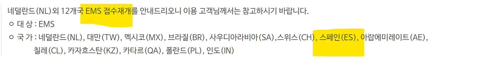 스페인으로 보내는 EMS 택배 접수가 재개되었다는 공지가 올라왔다!!!! 야호야호~~