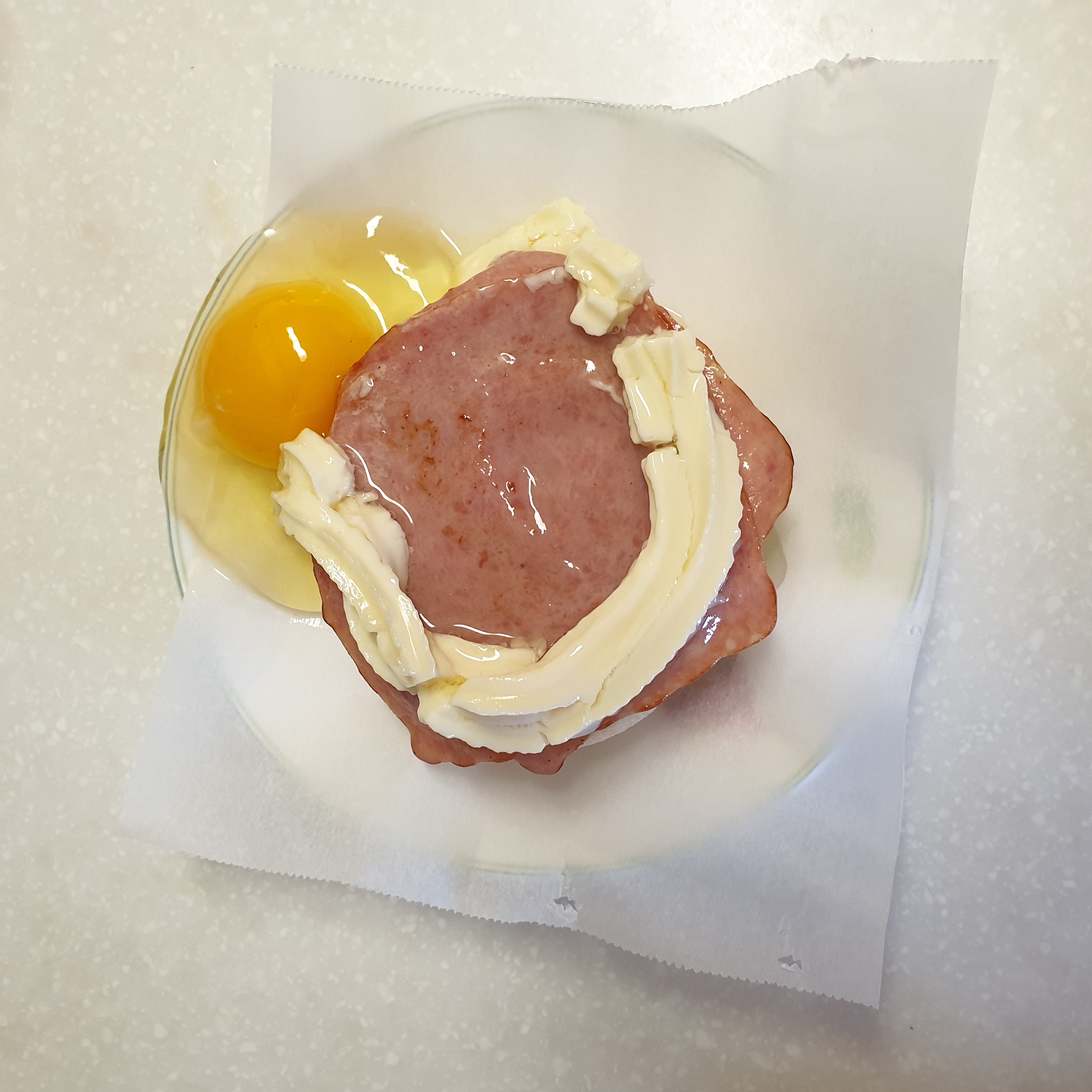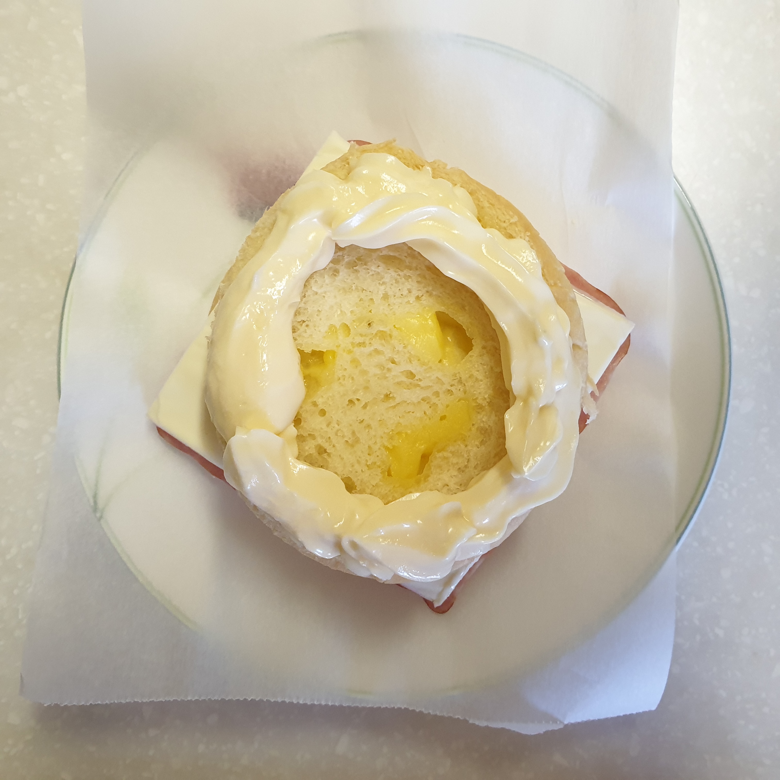 햄이 미끄러우니까 심지어 한번 구워서 뜨끈뜨끈하니까 마요네즈가 계란을 지탱하지 못하고 무너졌다.