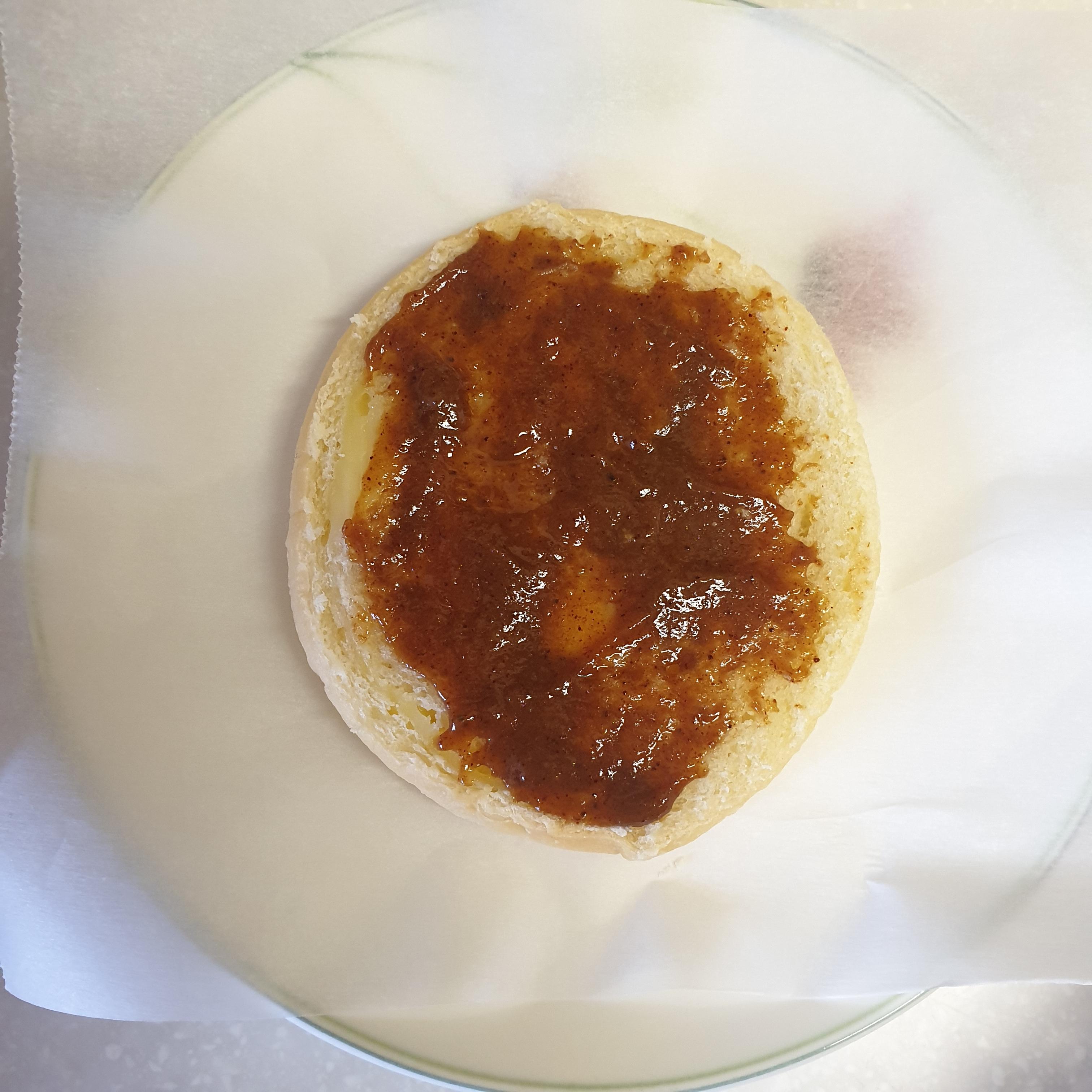 종이호일 깔고 빵을 올렸다. 그리고 직접 만든 바나나시나몬잼을 발랐다. 시나몬가루랑 흑설탕이 들어가 색이 갈색이다.