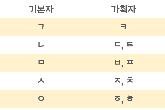 가획자는 위의 초성 'ㄱ, ㄴ, ㅁ, ㅅ, ㅇ'에 획을 더해 만든다.