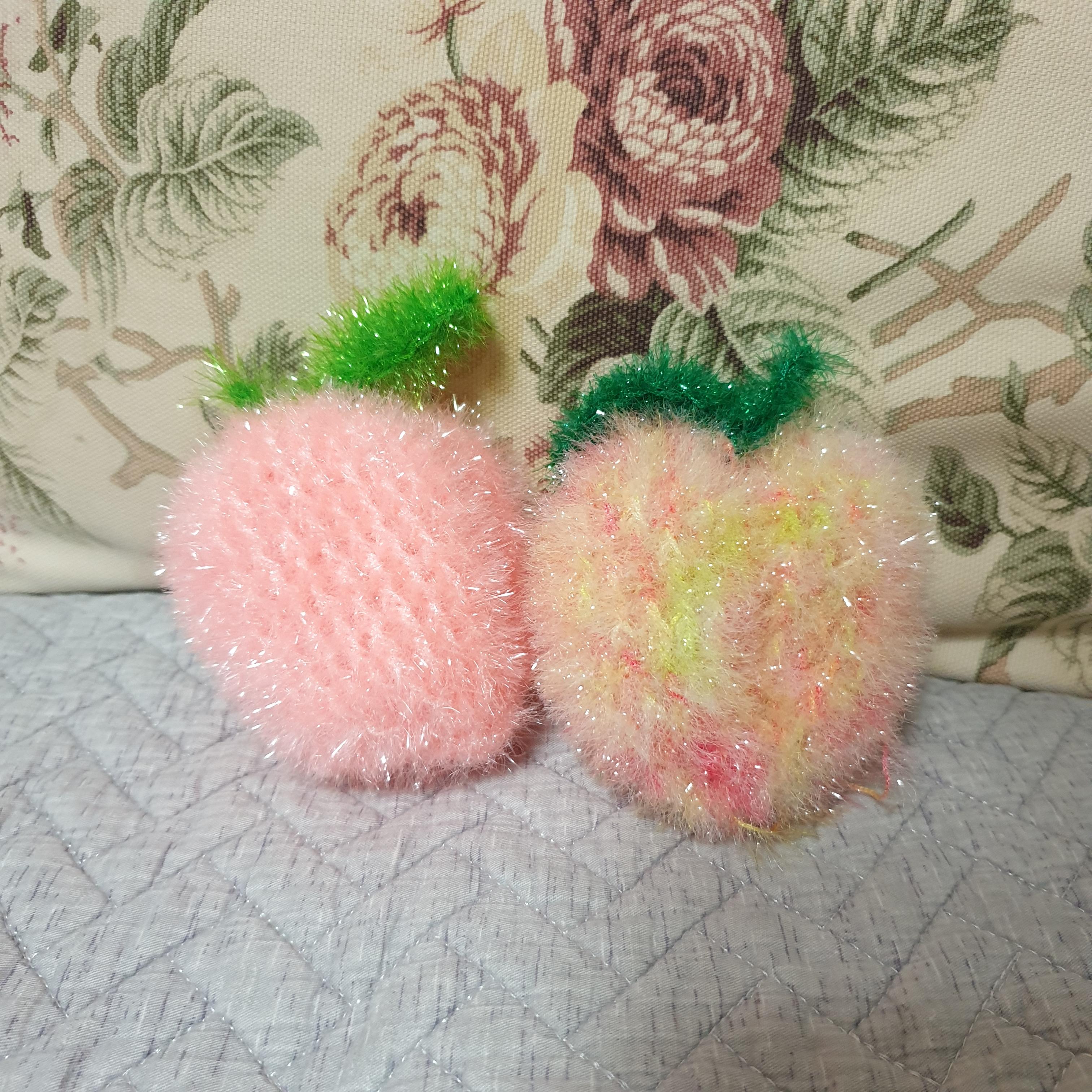 왼쪽부터 순서대로 감, 고추, 복숭아 수세미이다. 과일수세미도 있고 야채 수세미도 있다. 복숭아 수세미를 만들었을 때 가장 인기가 많다. 손이 작으면 복숭아 수세미가 그립감도 좋다. 수세미는 예쁘기도 해야하지만 설거지할 때 써야하니까 그립감이 좋아야 한다. 왼쪽에 진한 분홍색 복숭아 수세미가 가장 마지막에 만든 수세미인데 진짜 하트모양처럼 모양이 나왔다!! 뿌듯!! 감은 조금 더 납작해야 했는데 그냥 대봉이라고 우기고 있다.