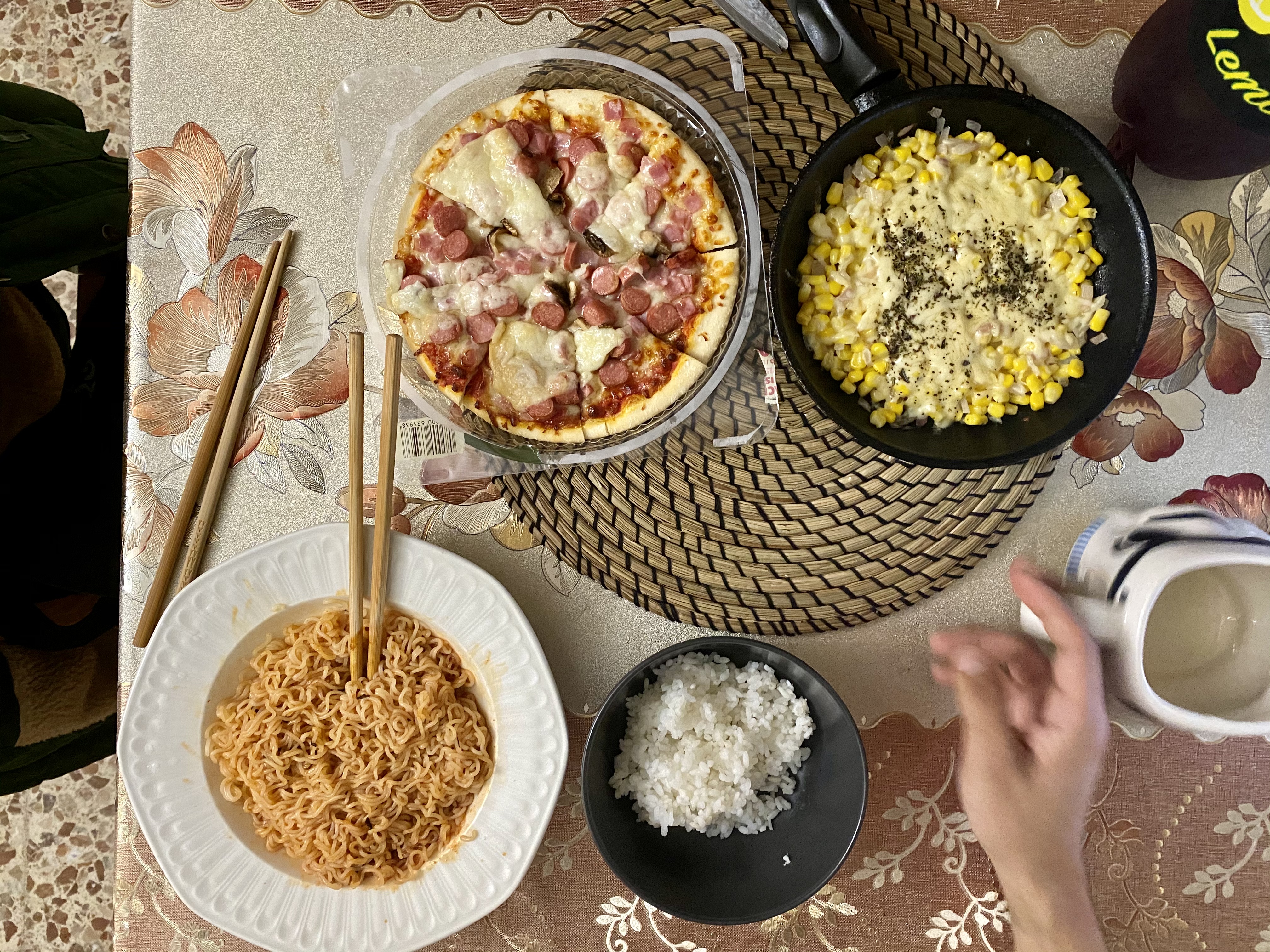 그리고 정리하고 샤워를 한 다음에 작은 미니 피자에 소시지 올리고 버섯 올리고 치즈를 더 올려서 에어프라이어에 돌리고, 어제 너무 맛있게 했던 콘치즈도 하고, 또 마지막으로 남은 비빔면까지 해서 완전 푸짐하게 먹었다. 아 정말 맥주가 없는 게 너무 아쉽다.